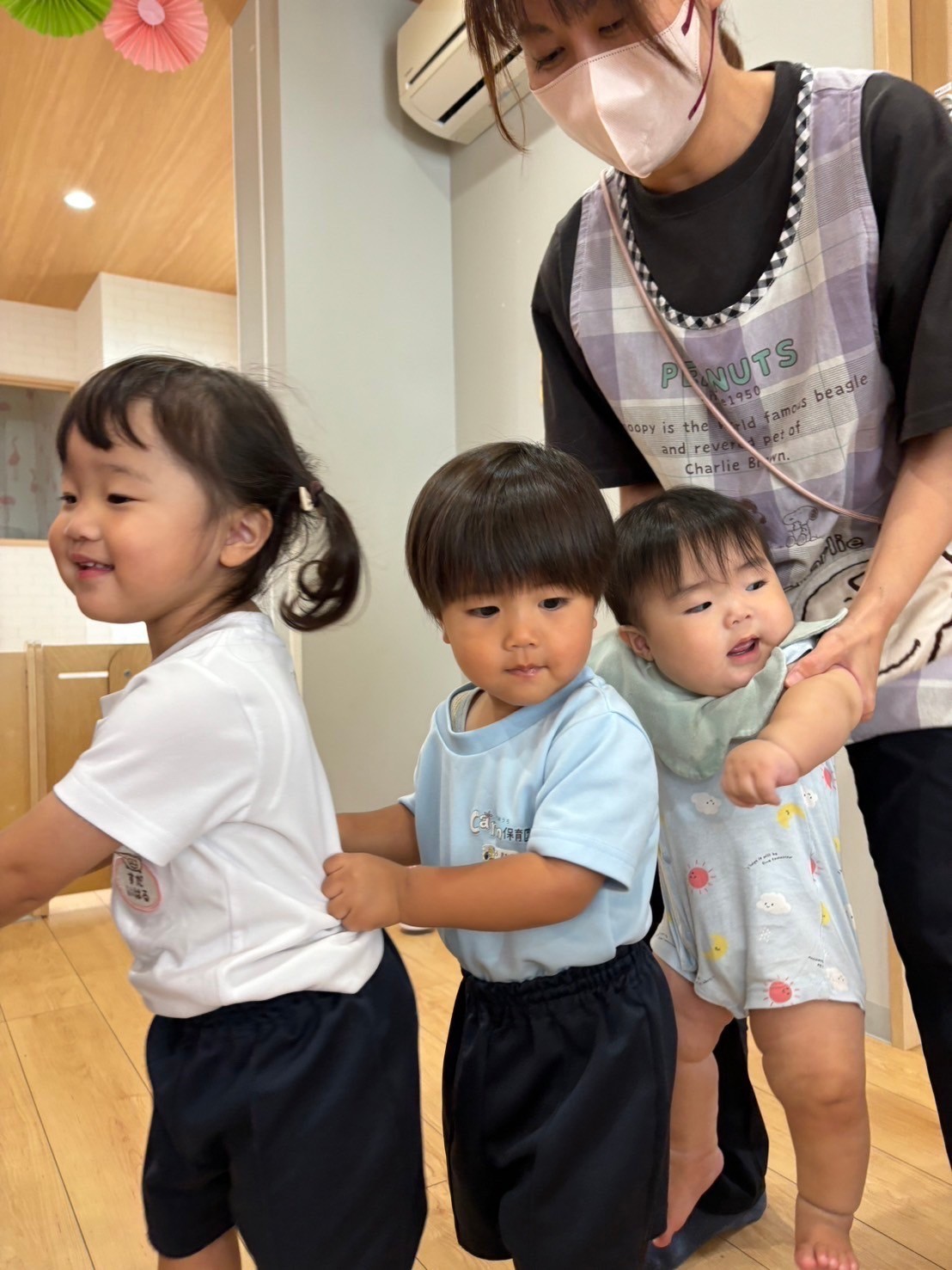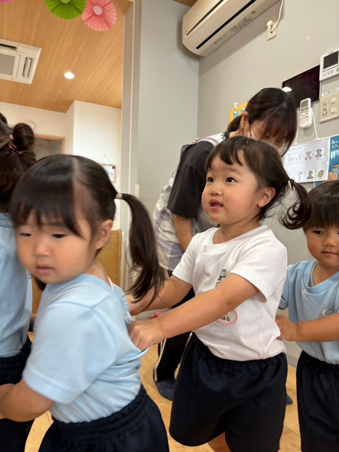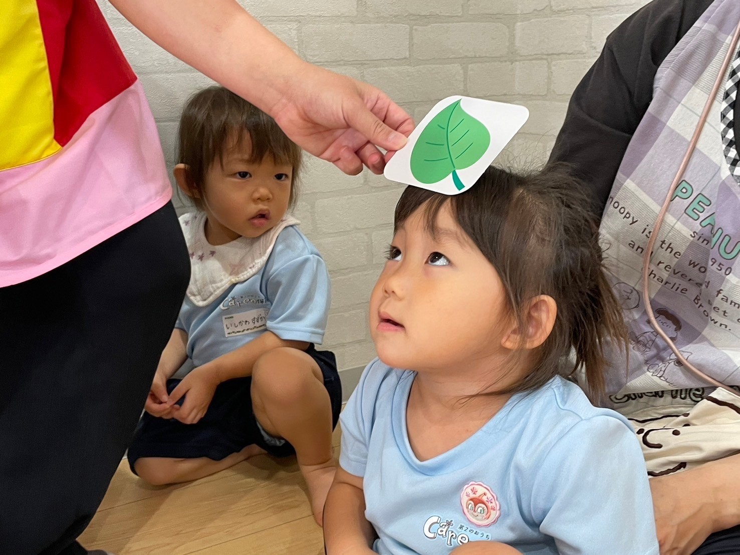 英語教室は、大好きな『ピカブー🫣』からスタート▶️💕みんな上手にお顔を隠して歌うことができました♫乗り物や果物の英語をチャリナ先生の後に続いて発音することもできましたよ👏💕