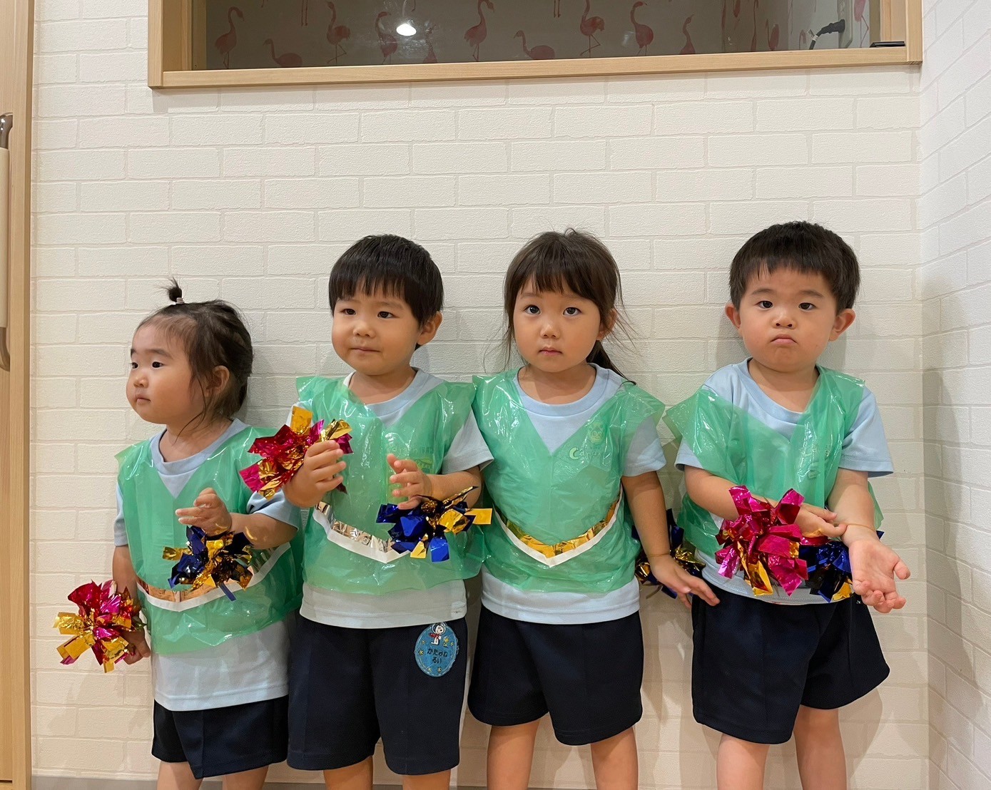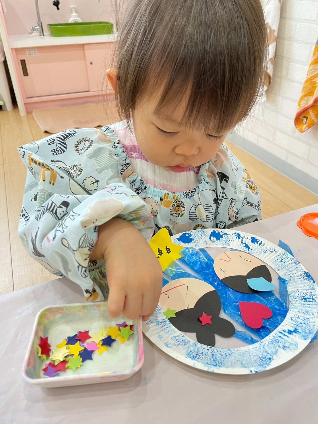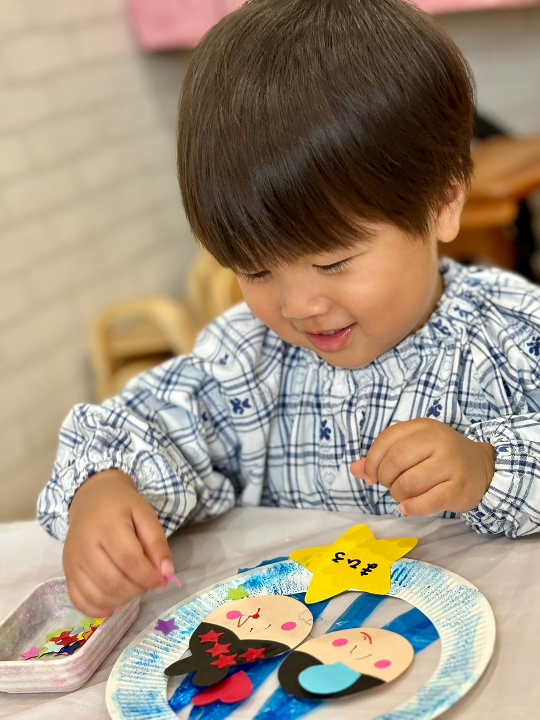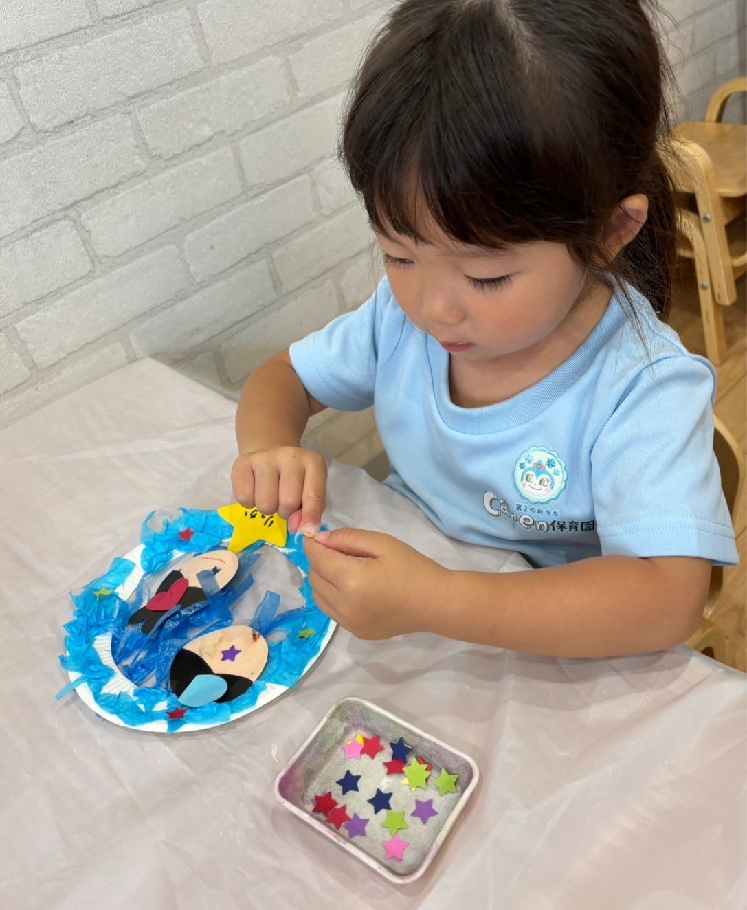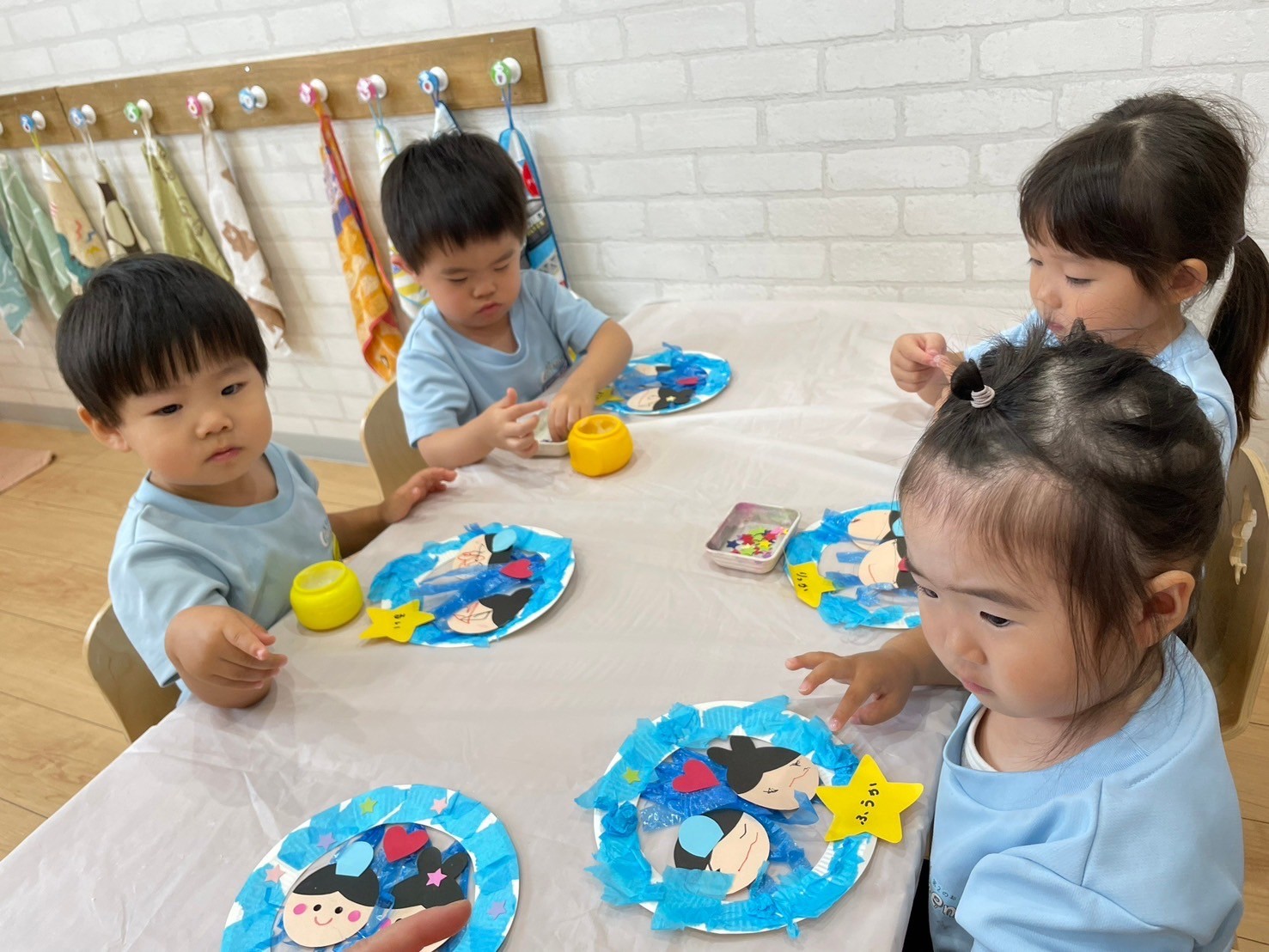 お願い事を書いてもらった短冊が少しずつ集まり、どんなお願い事があるかな〜🎵とみんなでお話しながら、織姫さまと彦星さまの周りの天の川に糊でカラフルな⭐️をペタペタ貼りましたよ😘