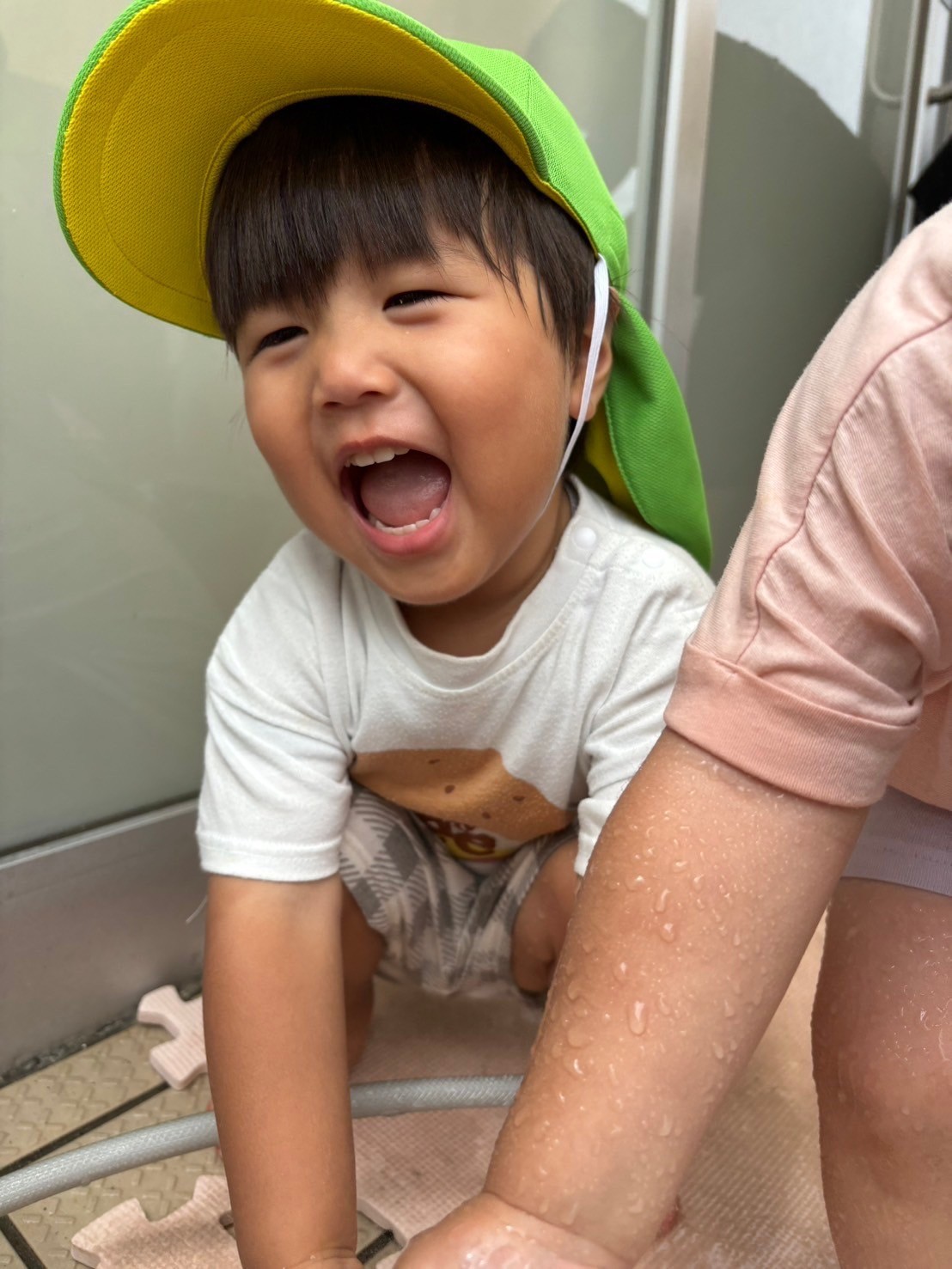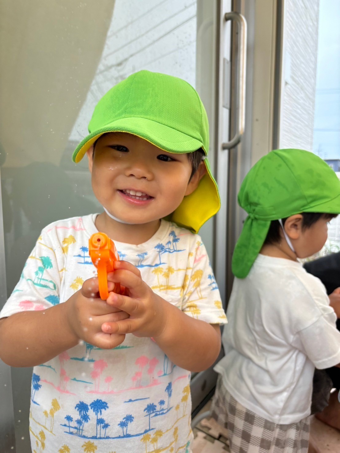 シャワーがかかると「うわぁぁぁ🤩」と大興奮💨水遊び玩具を順番に使ってお約束を守って水遊びを楽しみました💕【福津園の今日の給食です】