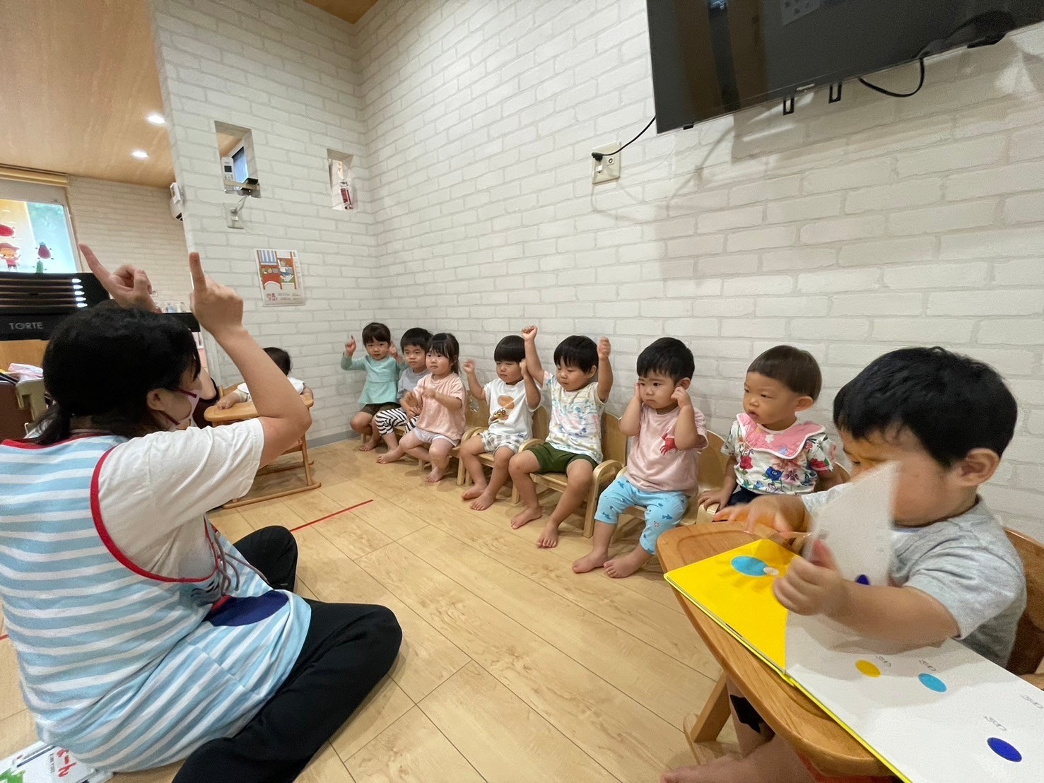 朝の会では、カエルがジャンプ🐸する絵本に大盛り上がりの福津園のお友だち💨絵本に出てくるカエルさん🐸やうさぎさん🐰と一緒にみんなでジャーンプ💨楽しい朝の会で1日がスタートしました▶️💕