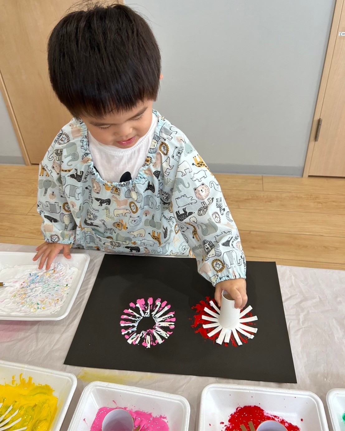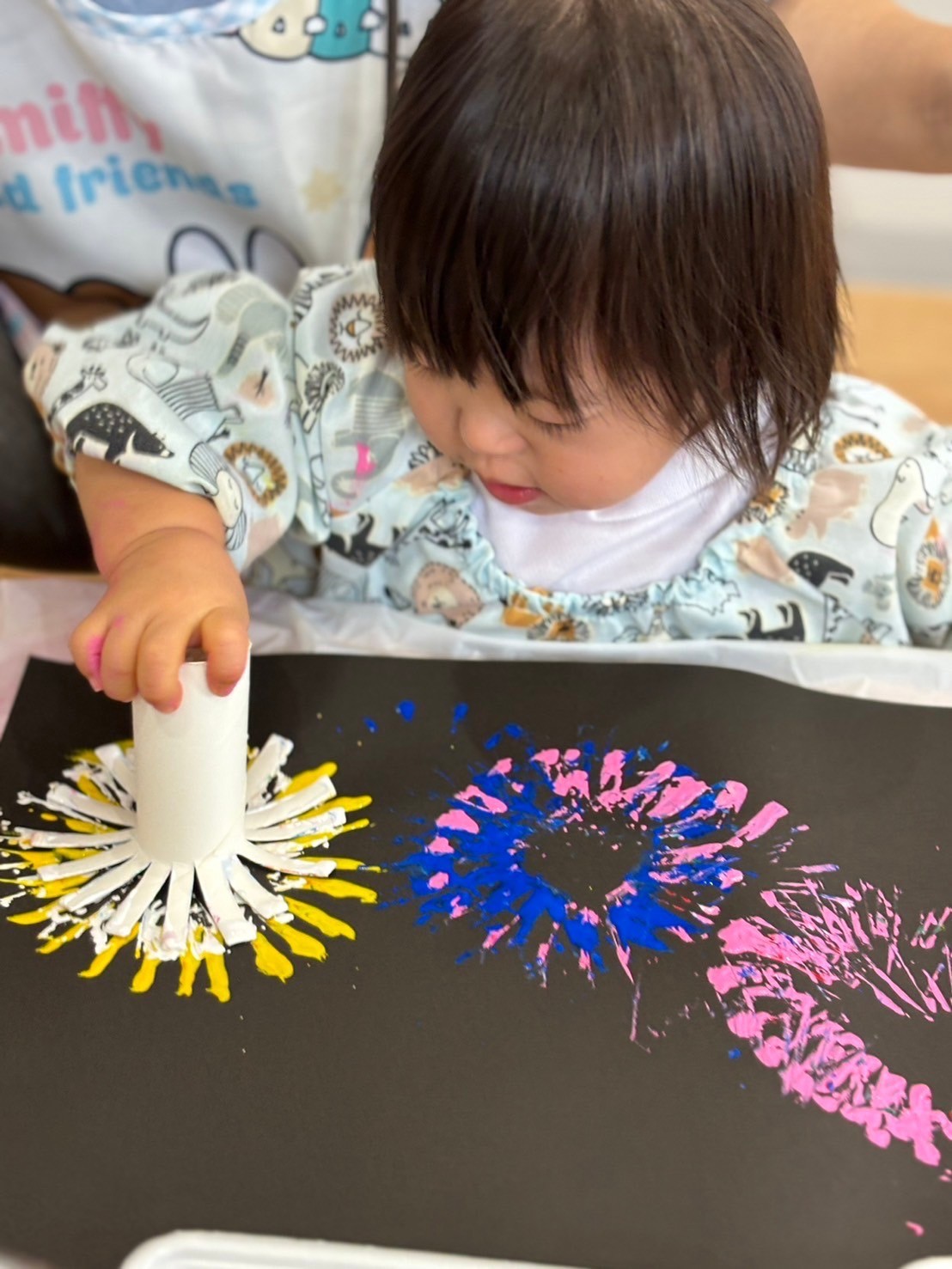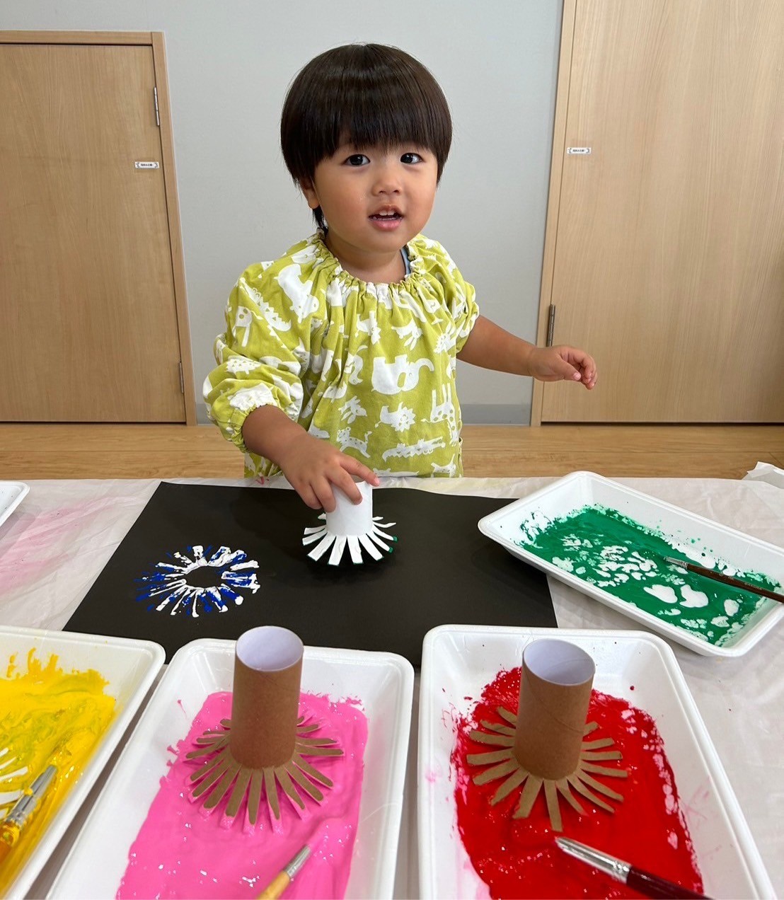 雨上がりで少し肌寒かったので、水遊びはお休みにして月製作をしました🙌トイレットペーパーの芯を使って絵の具でスタンプをして花火を作りました🎆色んな色を重ねるのが楽しくて、みんな夢中でペタペタしていましたよ🤗どんな作品が出来上がるかお楽しみに💕【福津園の今日の給食です】