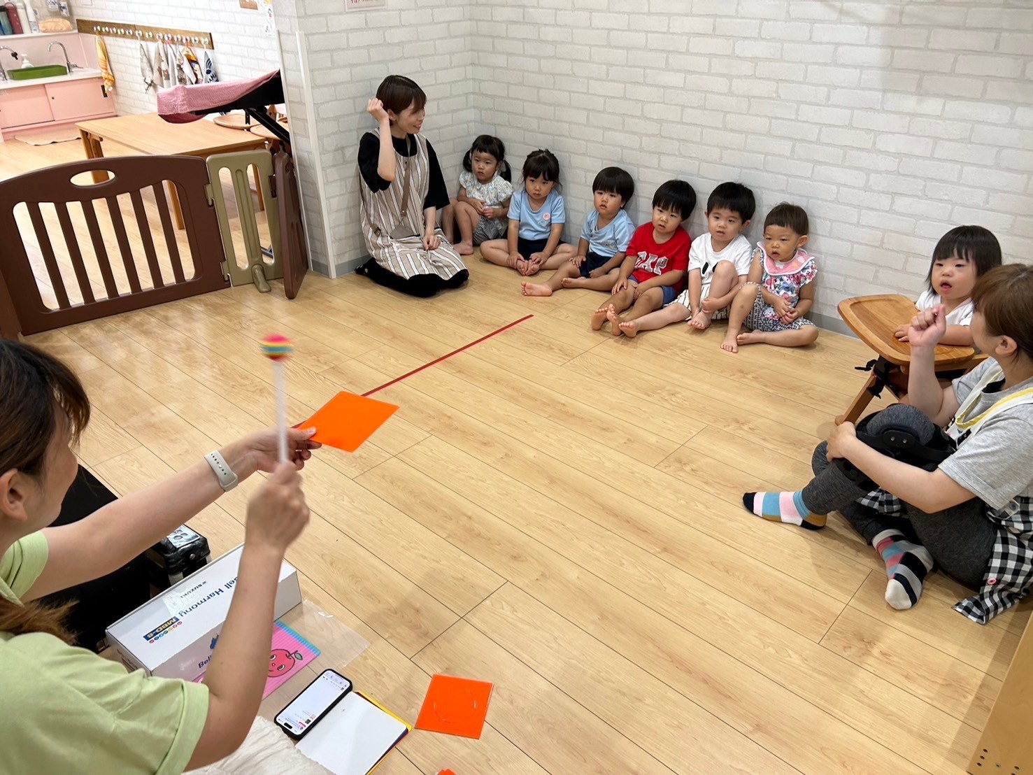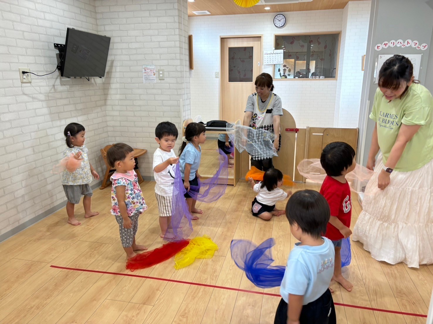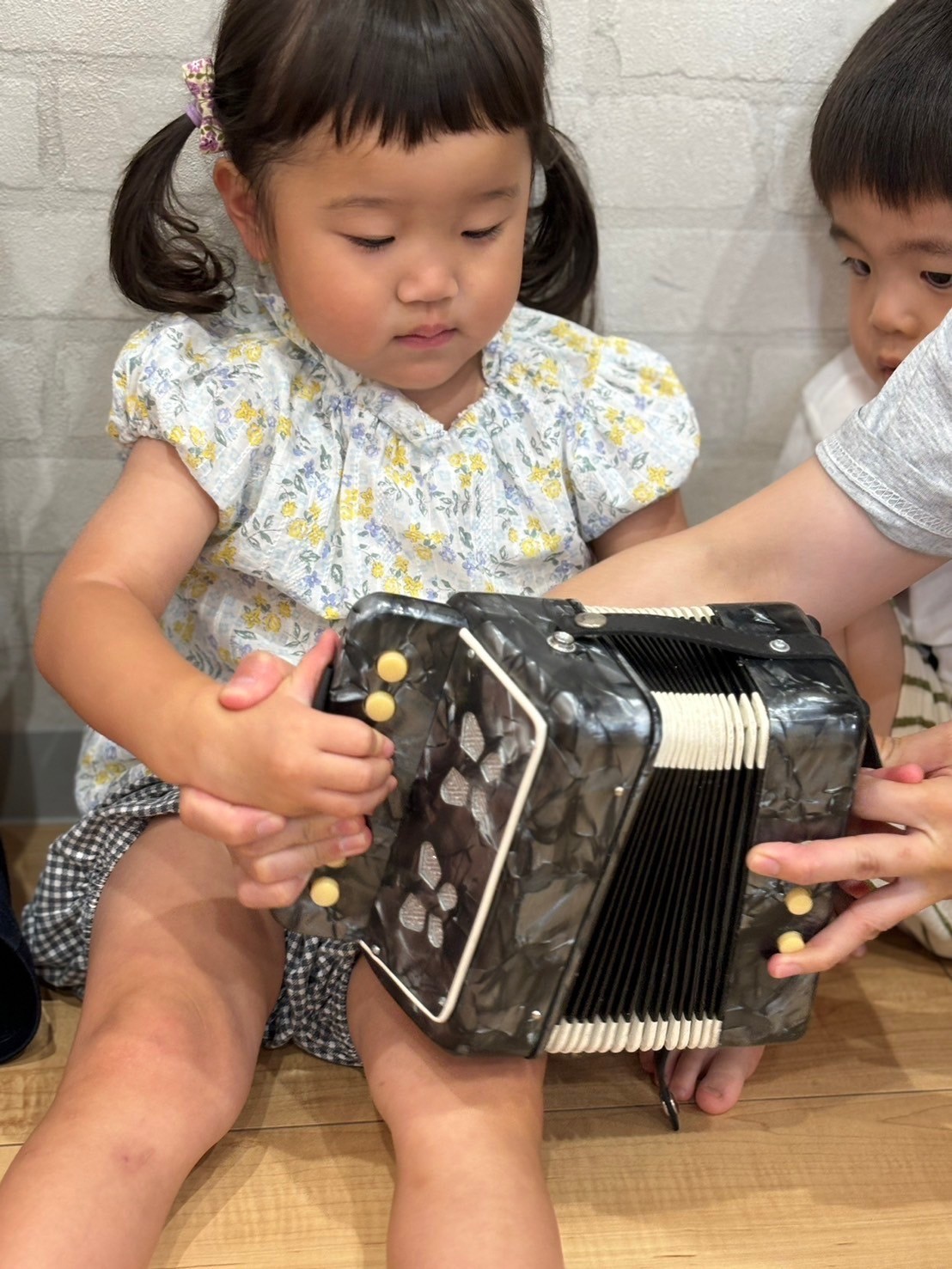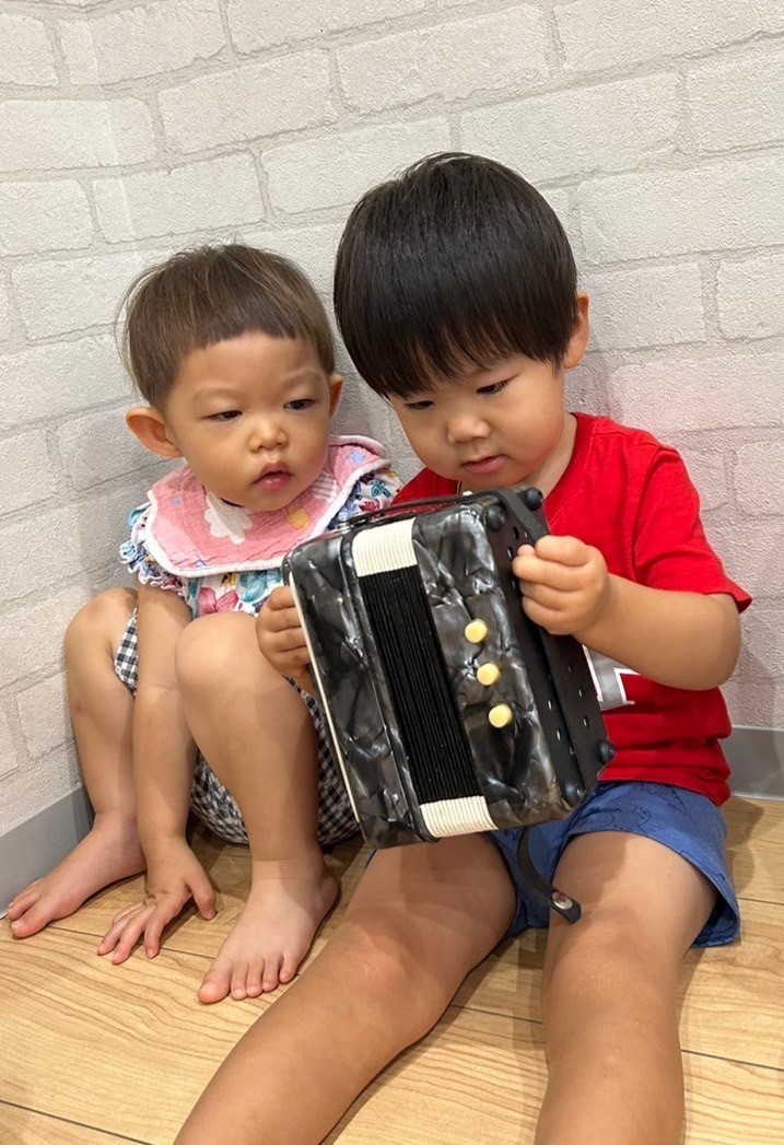 お気に入りの紙芝居を読んでもらい嬉しそうな子ども達🥰好きな色のベル🛎を鳴らしたり、虹🌈の歌に合わせてシフォン布を持って踊ったり🎵まゆみ先生が大小のアコーディオン🪗を持って来て下さり、先生の演奏に合わせて子ども達も小さな🪗を1人ずつ鳴らしましたよ😘とっても楽しい時間でした💛