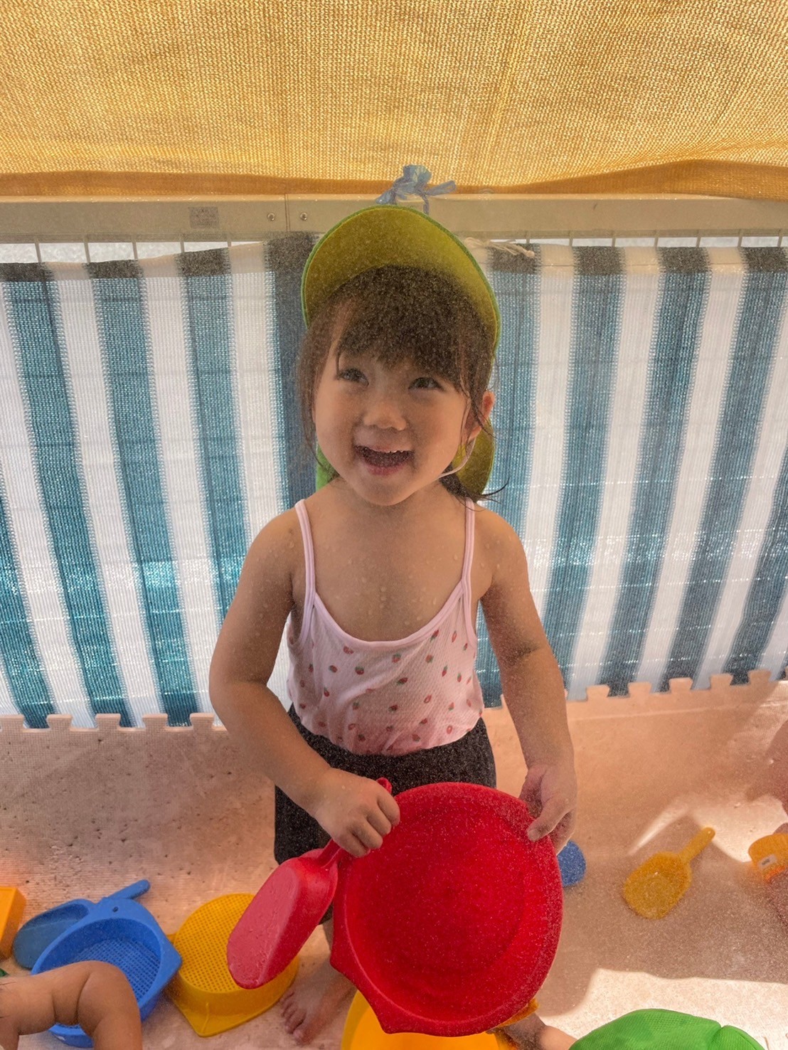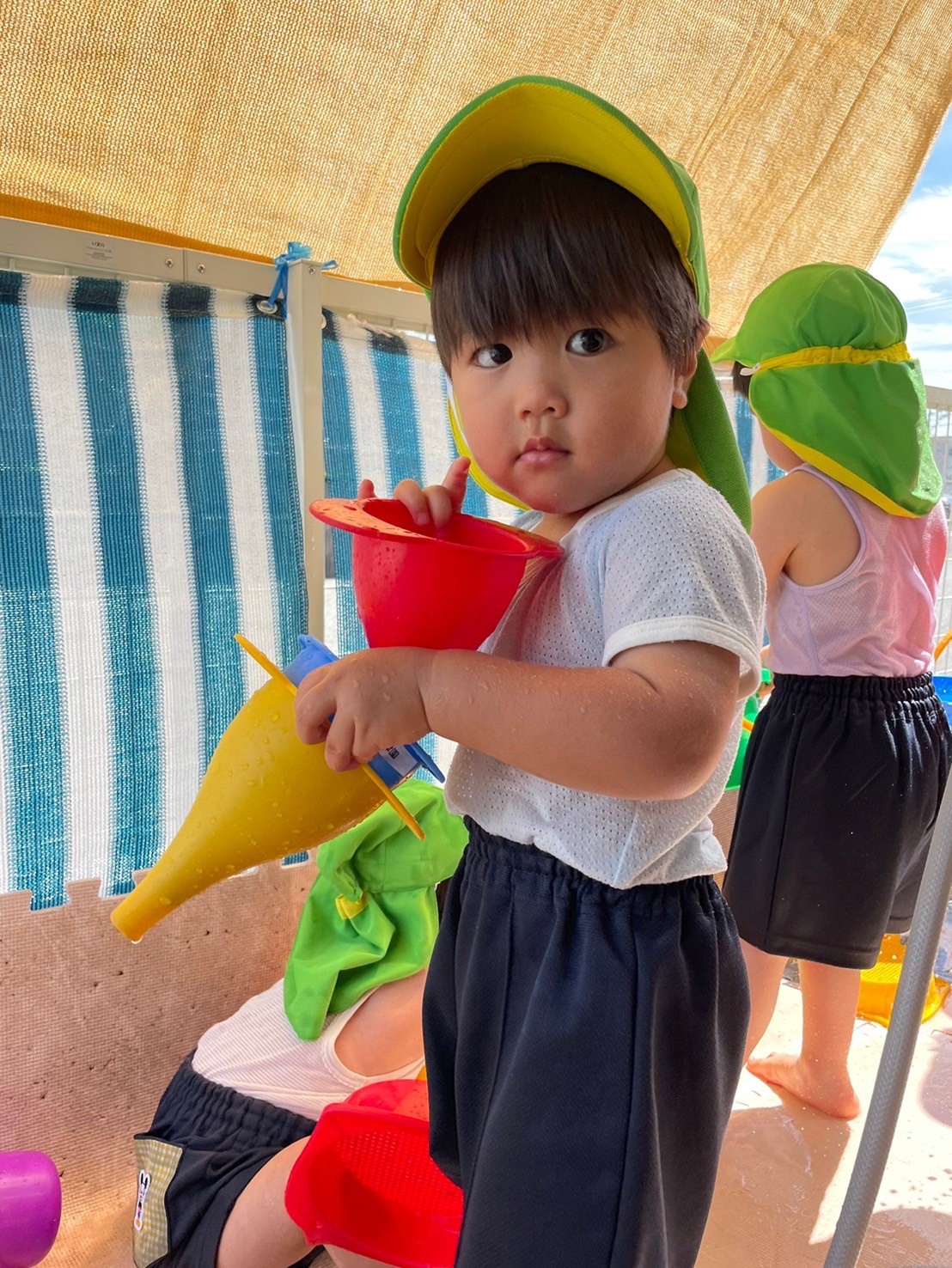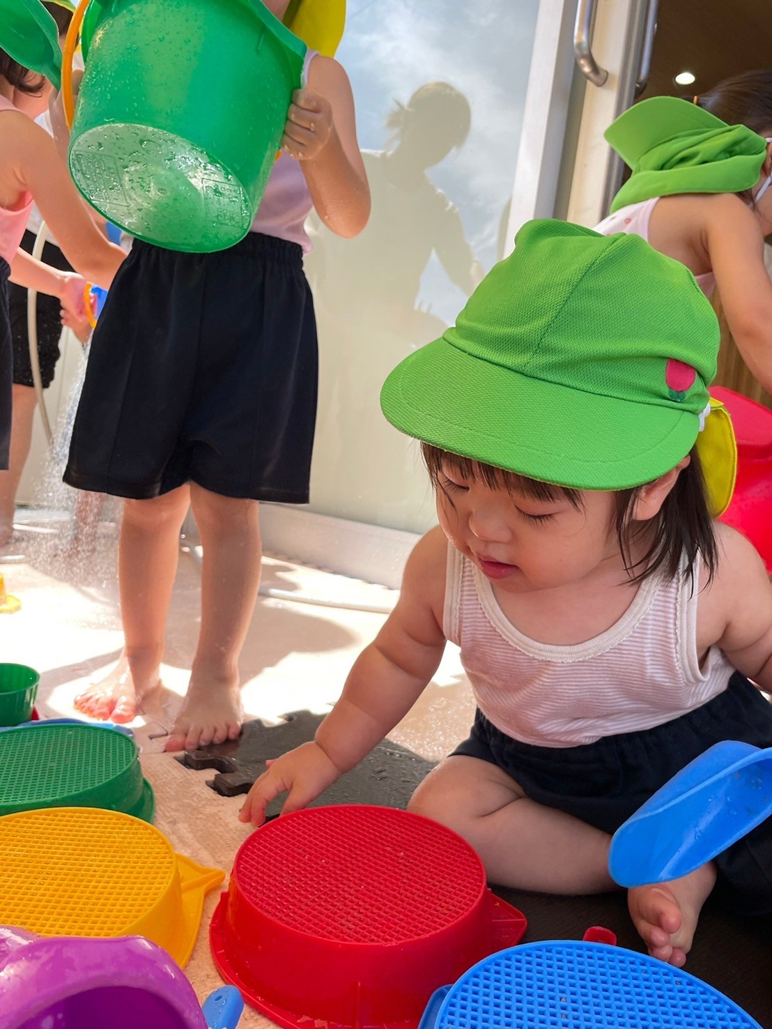バケツに🪣たくさん水をいれシャワーのように浴びたり、道路にまいたり、友だちのバケツに水を入れ替えたりと楽しんでいた子どもたち❤️