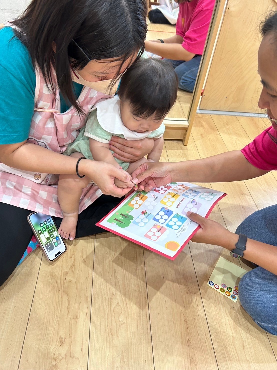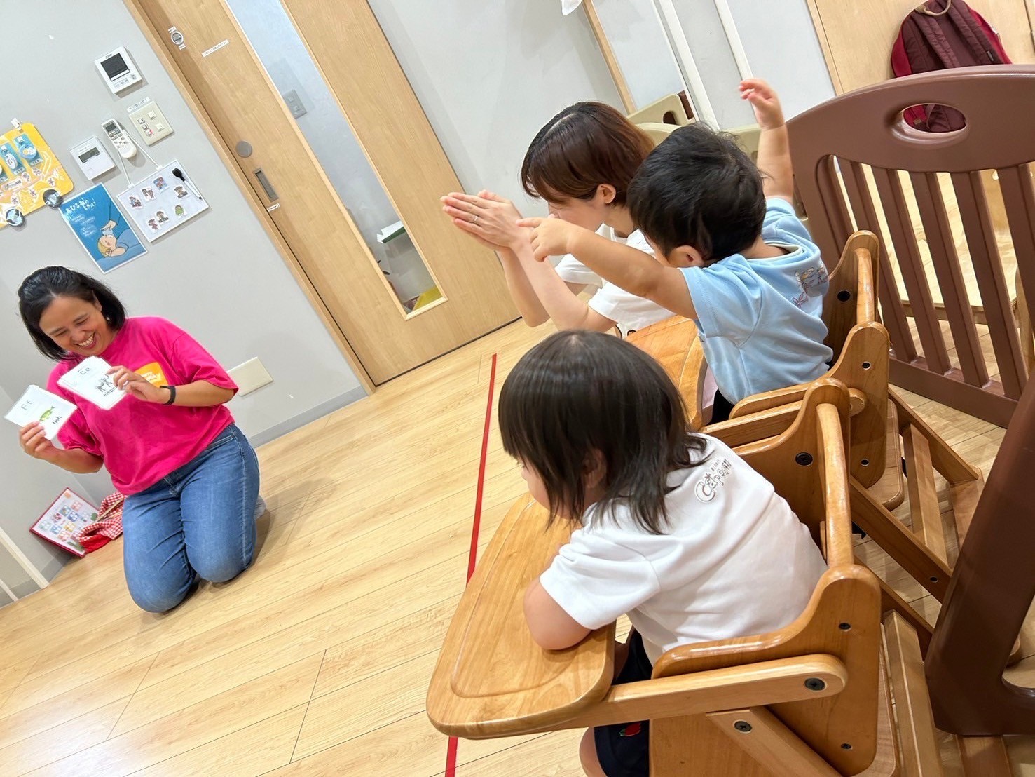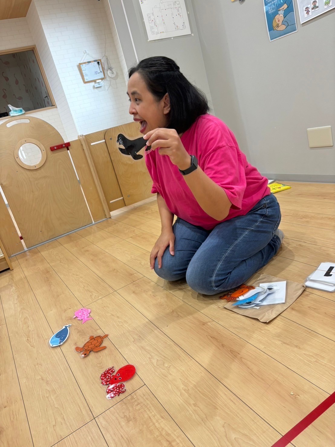 今日はチャリナ先生の英語レッスン🌟魚の絵本を読んで、色や魚の数を教えてくれました♪海の生き物🐟(タコ)の名前もたくさん教えてもらいました(魚)(魚)(海)