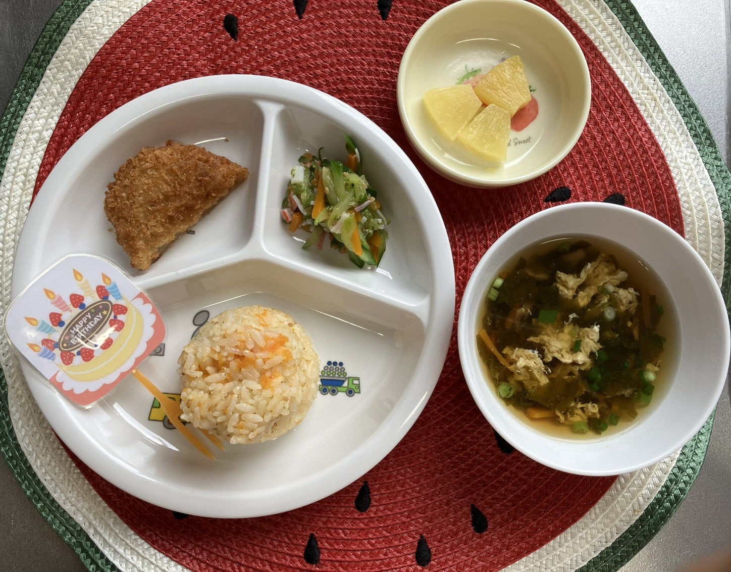 そして、先生からの出し物は『🎋そうめん流し(フォーク)』金曜日にあるそうめん流しの練習も兼ねて、そうめんをキャッチ💕😆✨途中に流れてくるトマトや、カブにもびっくりしていました🤭💕そうめん流し本番(びっくり)にやる気モリモリの福津っ子たちでした☺️【福津園の今日の給食です】