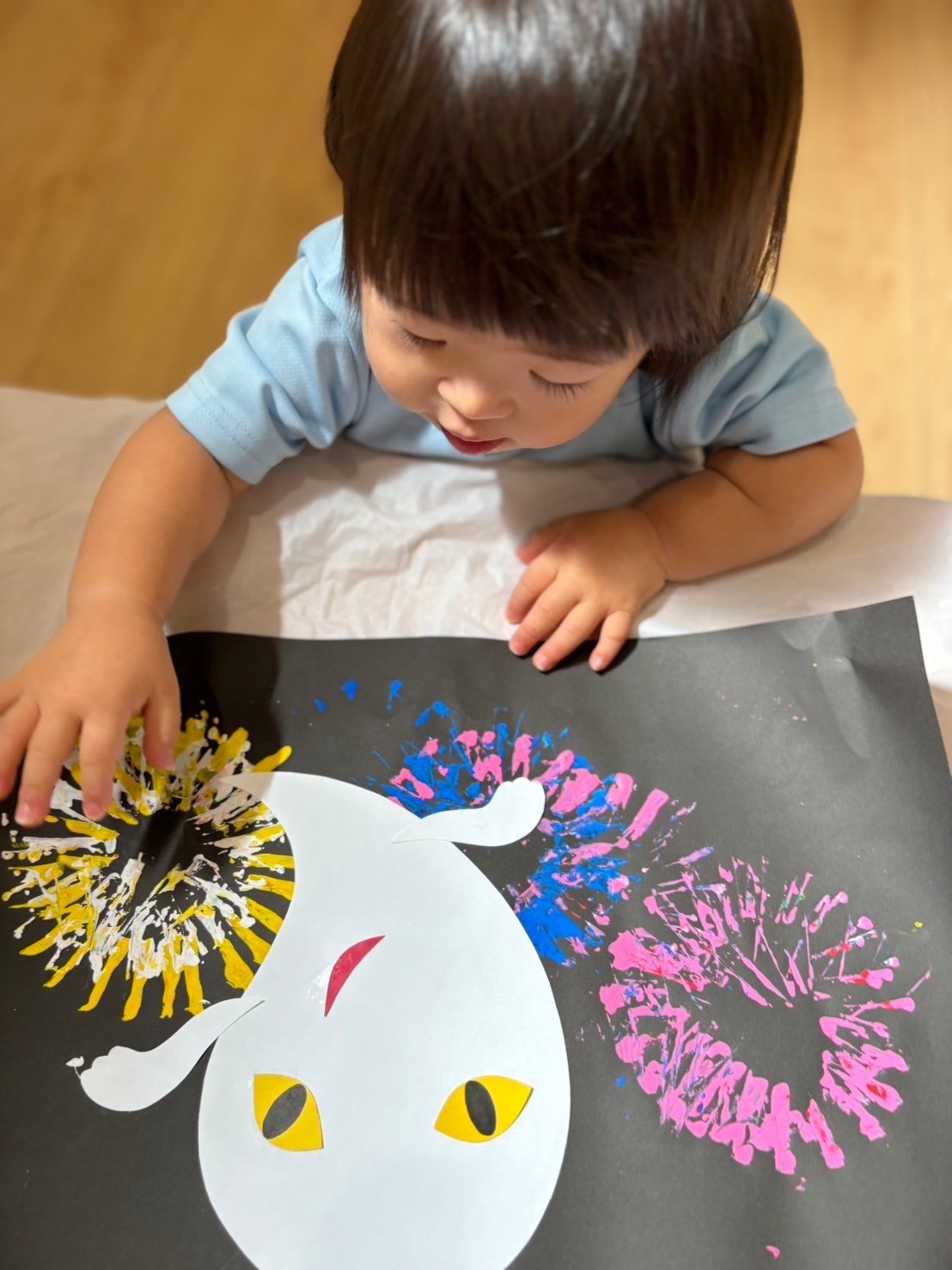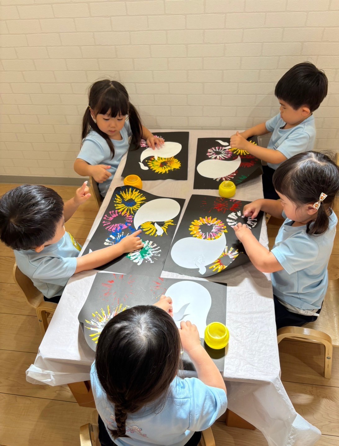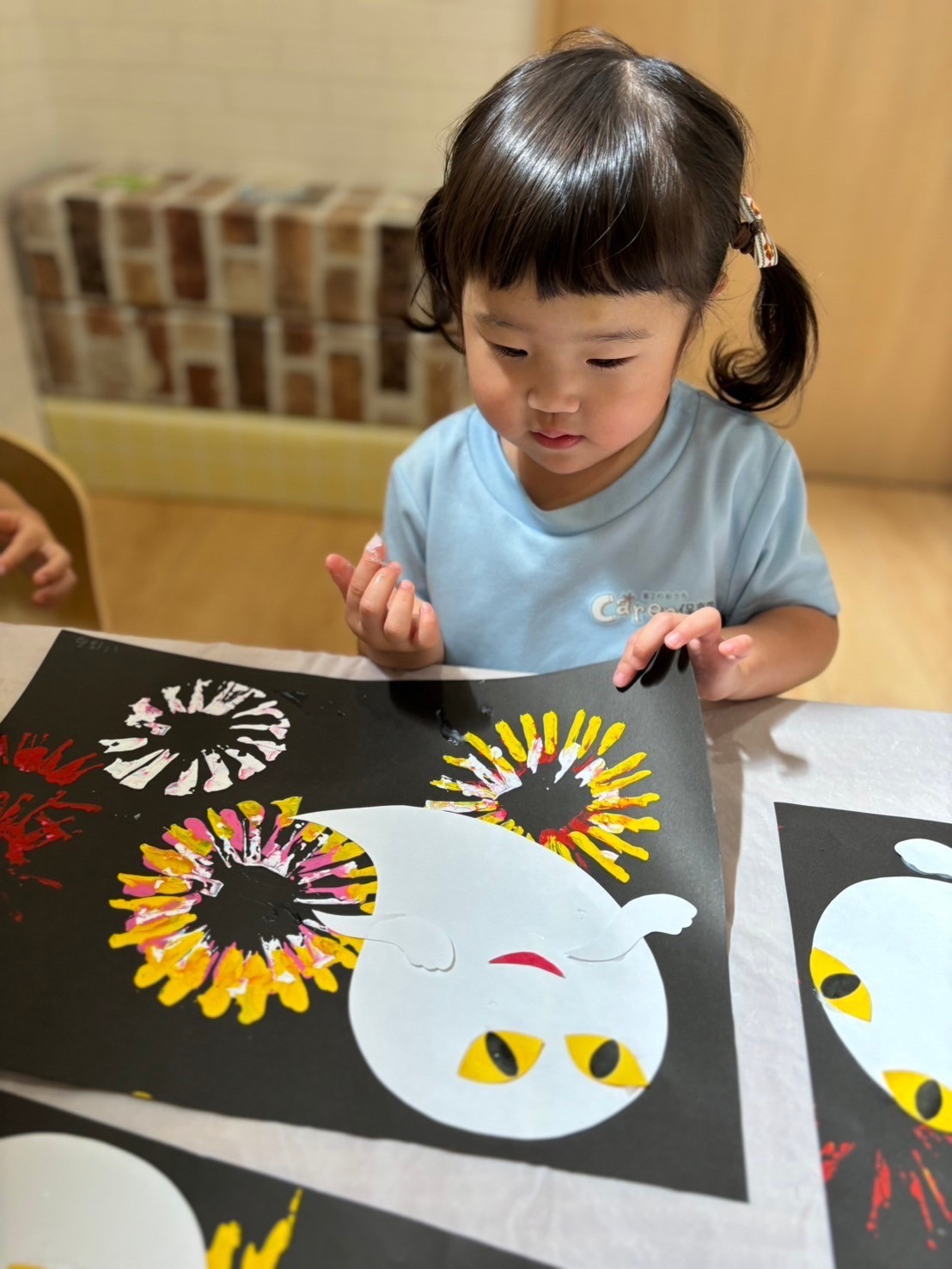 先生のお話を聞く姿勢がとっても素敵な子ども達💛糊を使って👀や👅、💪をペタペタ…✨花火(花火)の上に、表情豊かな可愛いおばけ👻が出来上がりました😆