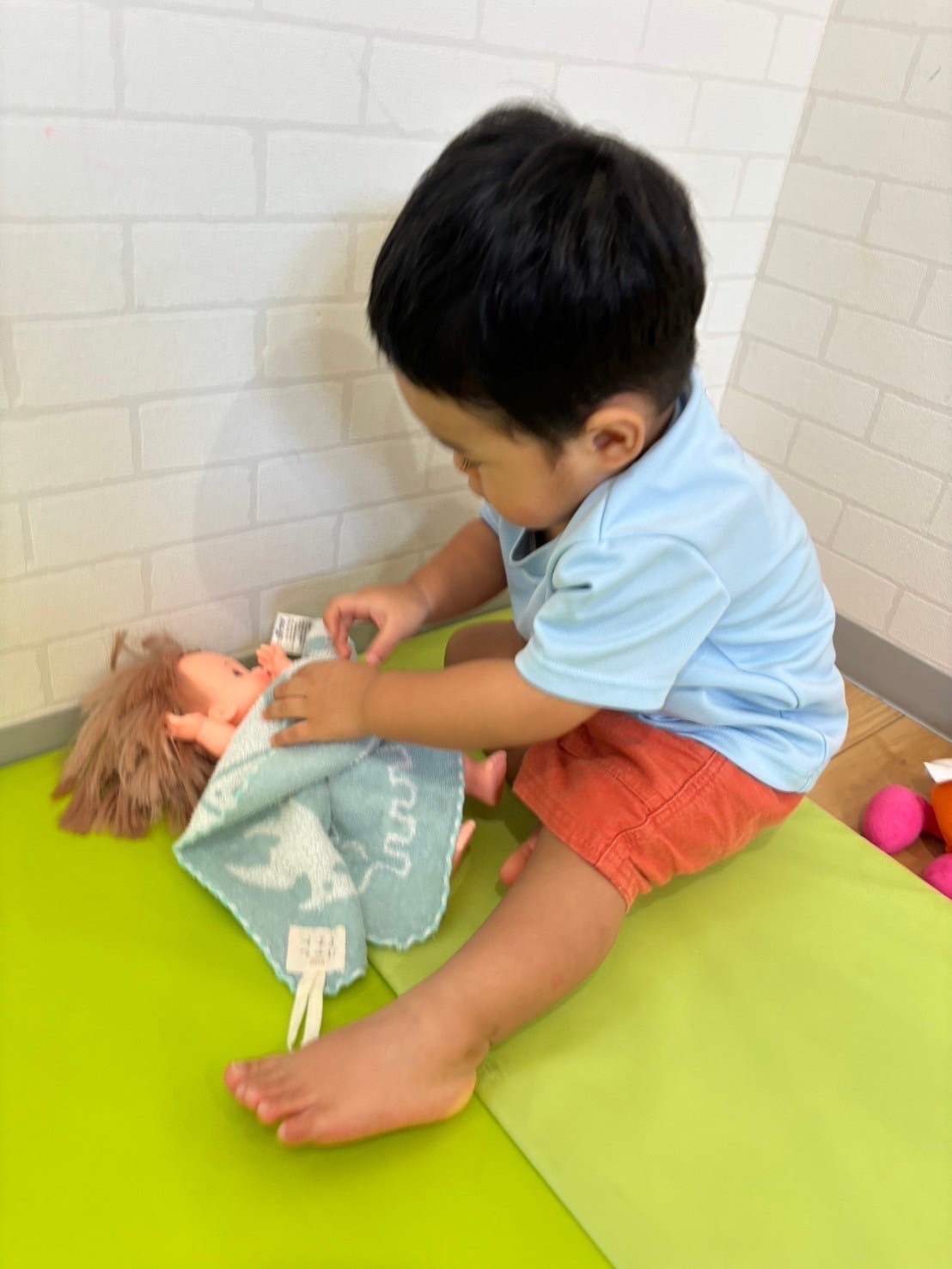 ぬいぐるみにタオルをかけて寝かしつけをしたりお世話をする姿も見られましたよ🍼