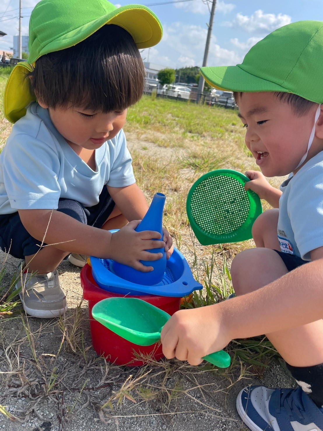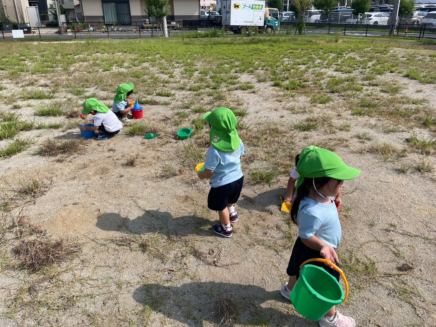 砂場セットがでてくると、みんな一斉にスコップやバケツを持って砂をすくいかき集めたり、小石を入れたりと楽しみました‼️