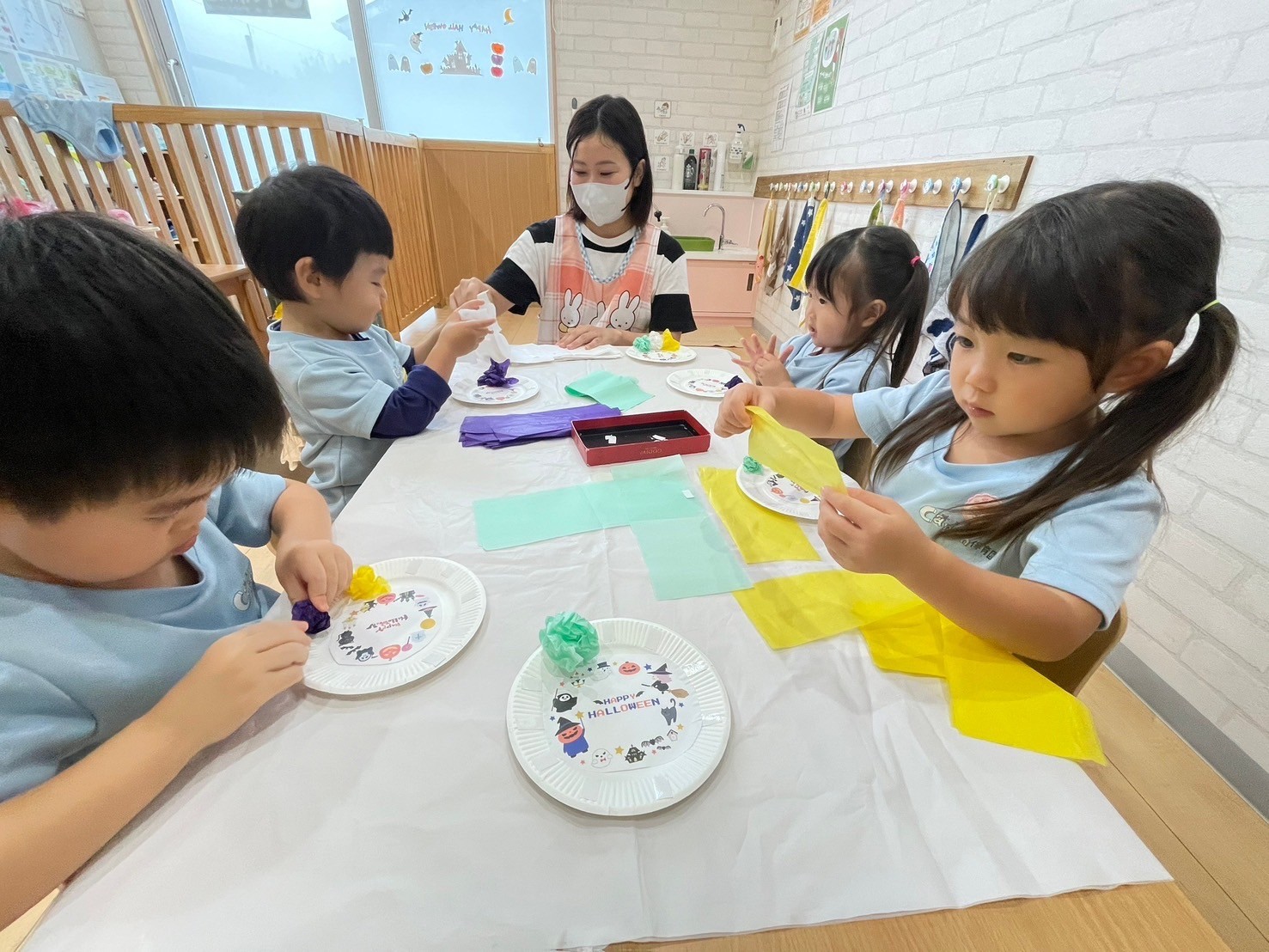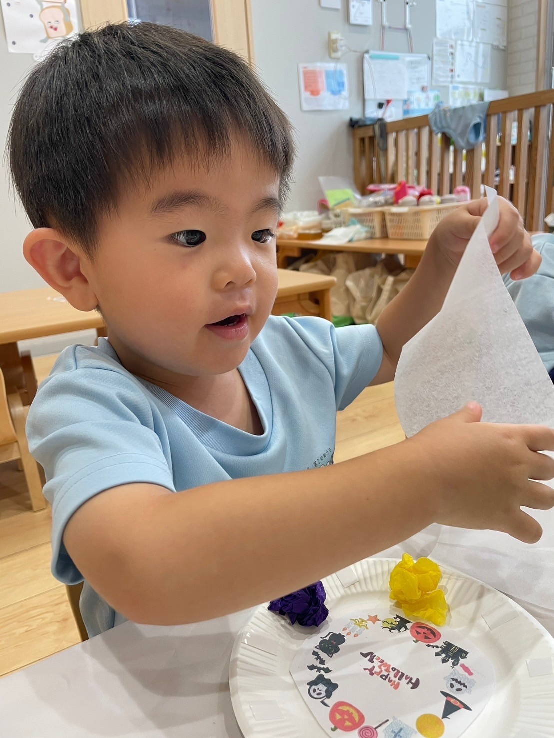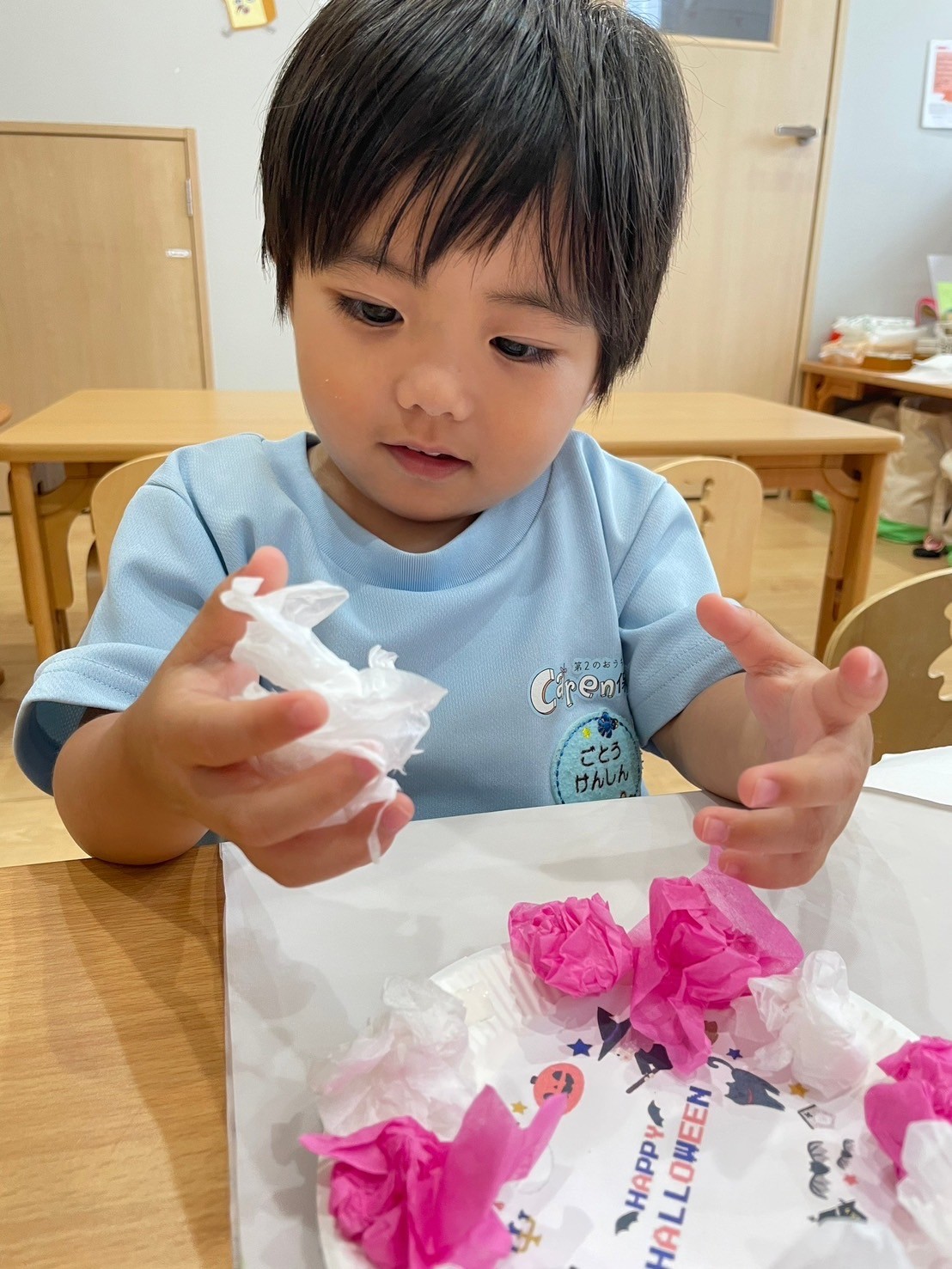 ハロウィンリースを作りましたよ👻花紙を丸めて、色んな色をリースに貼りました🌷自分たちが作ったリースをみて「綺麗だね😍」と満足気な福津っ子たちでした☺️