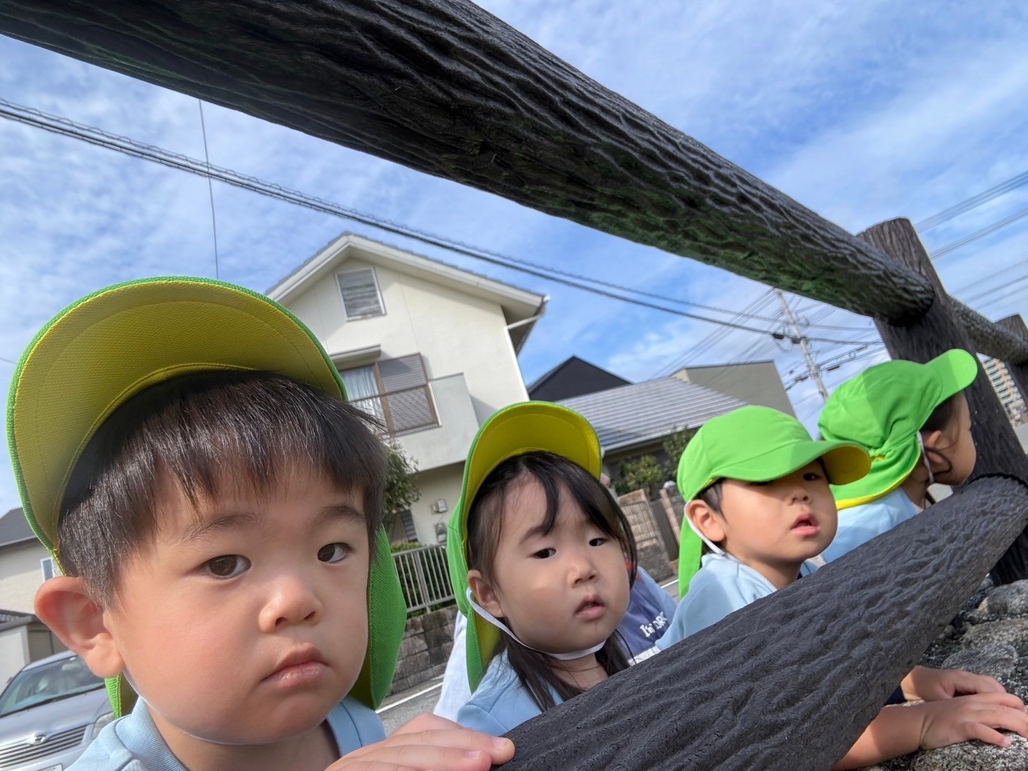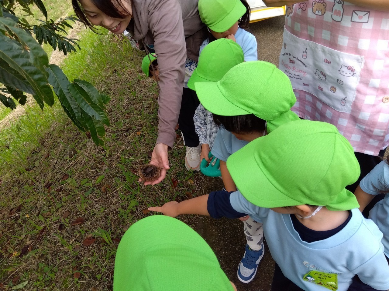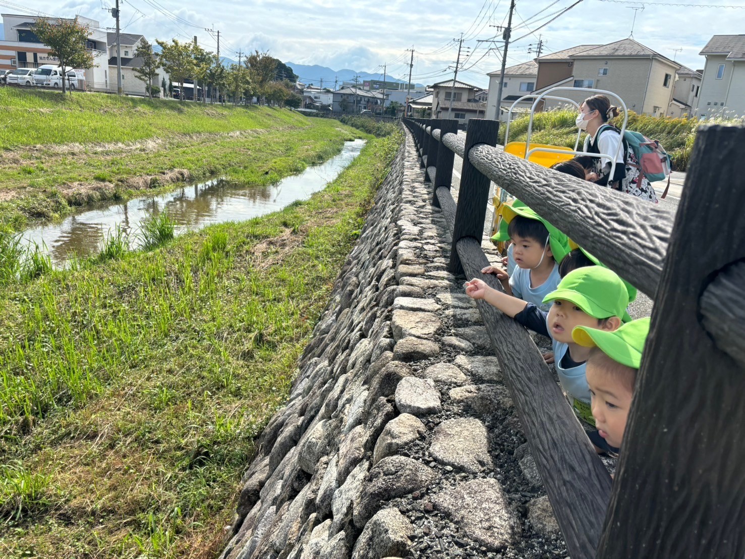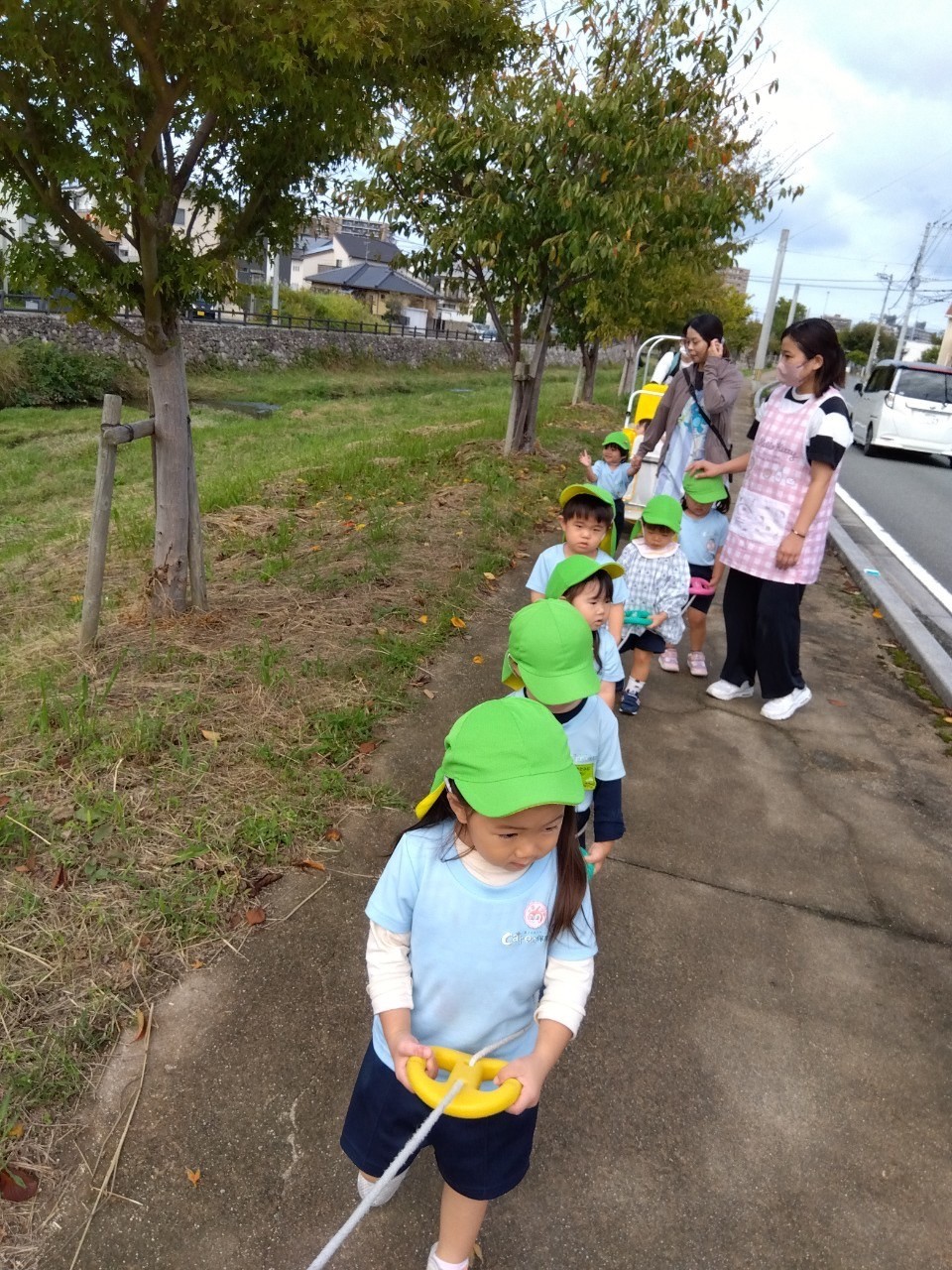 お絵描きのその後は、🐥さんはカートで、🐿🐼さんは誘導ロープや保育者と手繋ぎで近隣散歩へ!!川で鯉や鴨を見たり、畑の野菜や紅葉した落ち葉、栗やきのこなど沢山の秋を発見をして楽しい散歩となりました🍂🍄