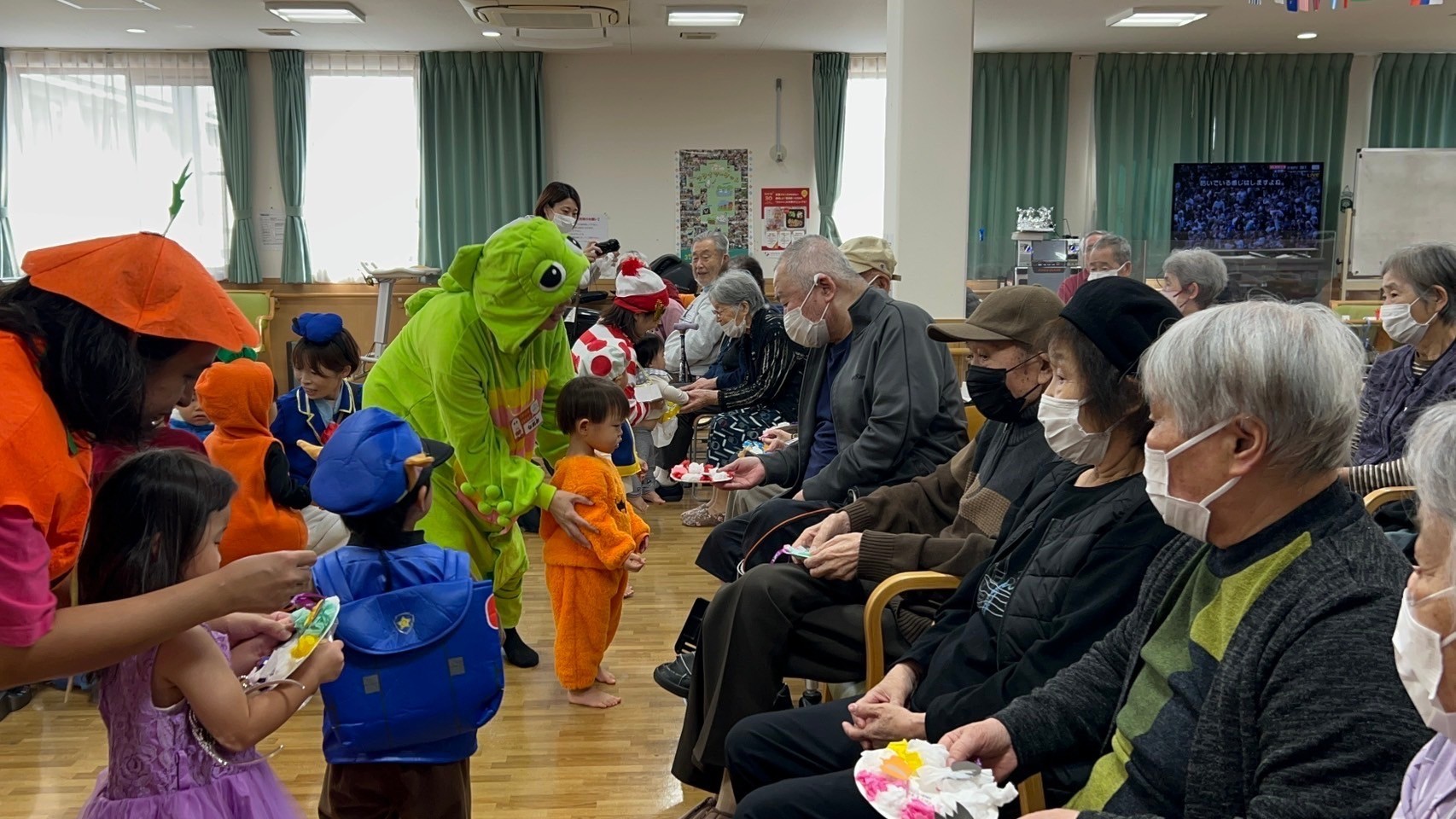 手作りのハロウィンリースをプレゼントでは、積極的におじいさんおばあさんのそばに行って手渡す姿も見られ、笑顔のふれあいがとっても素敵でしたよ🥹💕