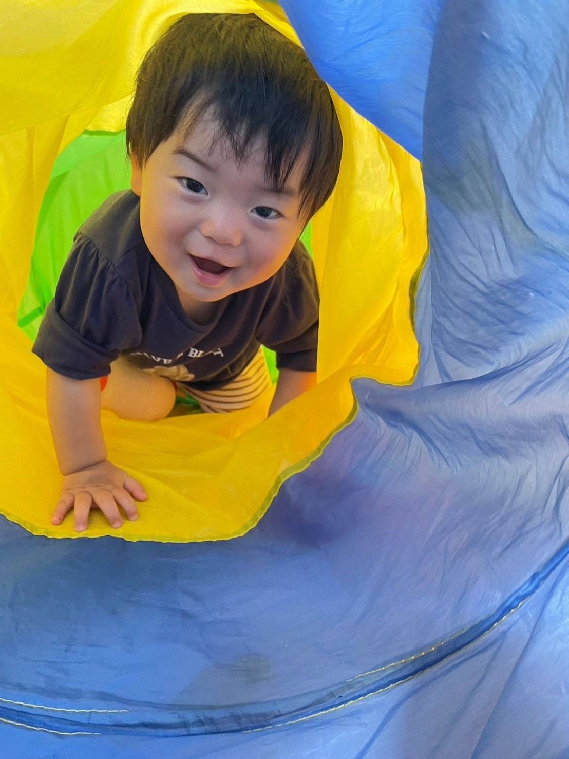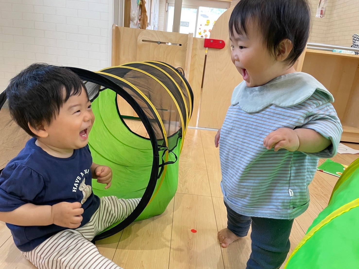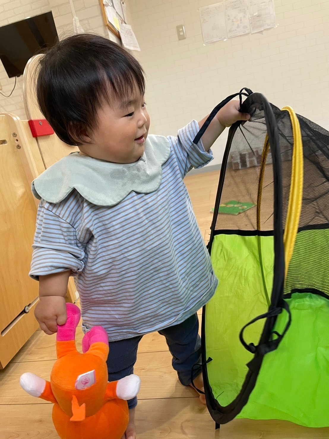 ひよこ🐣さんは、みんながスイートポテトを作っている間、トンネルとぬいぐるみでのびのびと遊びました😊上がネットになってるトンネルがお気に入りのようで、潜ったり覗き込んだりと楽しんで遊びました🎶【福津園の今日の給食です】