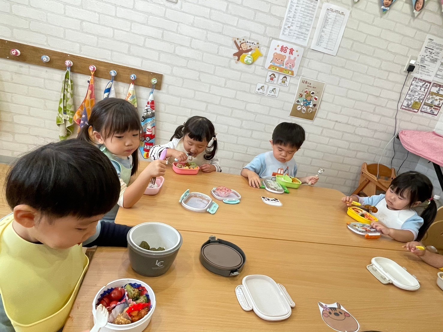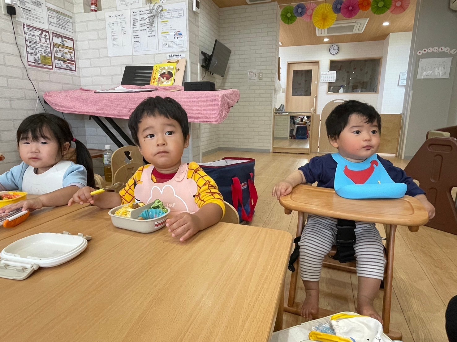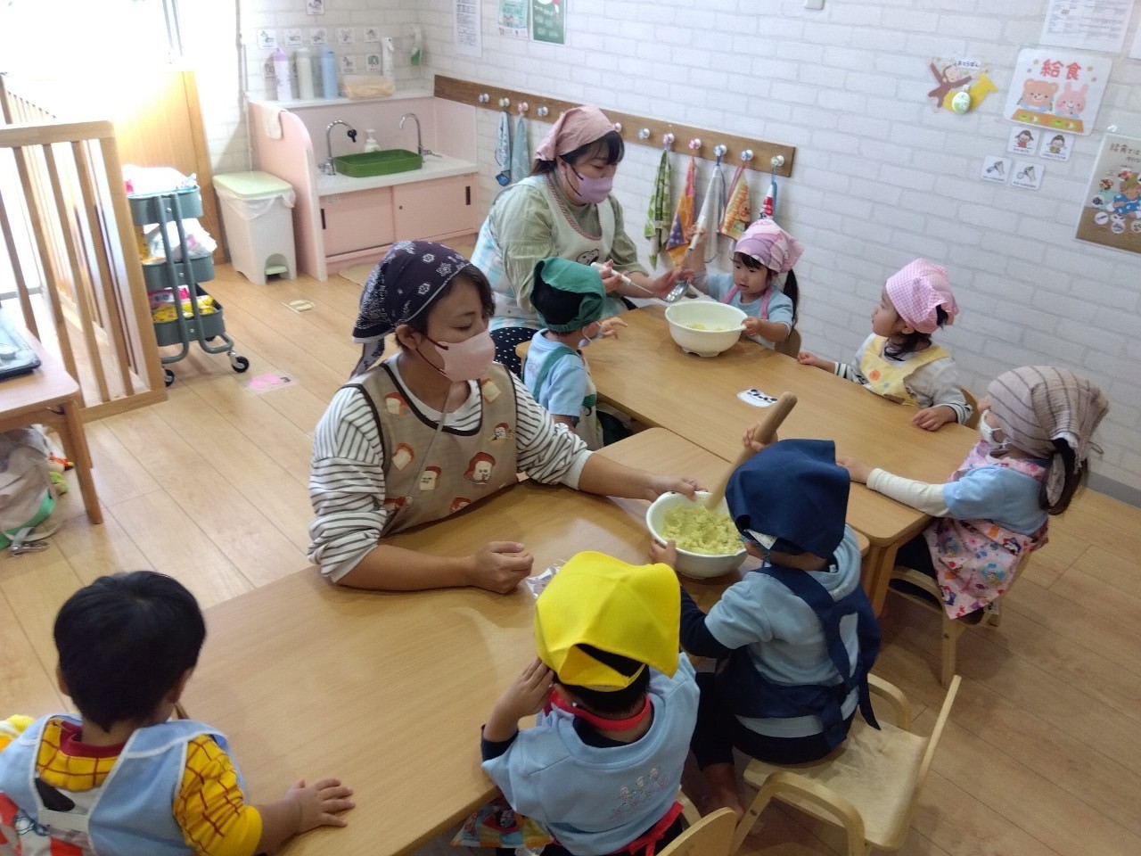 ひよこ🐣さんは、みんながスイートポテトを作っている間、トンネルとぬいぐるみでのびのびと遊びました😊上がネットになってるトンネルがお気に入りのようで、潜ったり覗き込んだりと楽しんで遊びました🎶【福津園の今日の給食です】