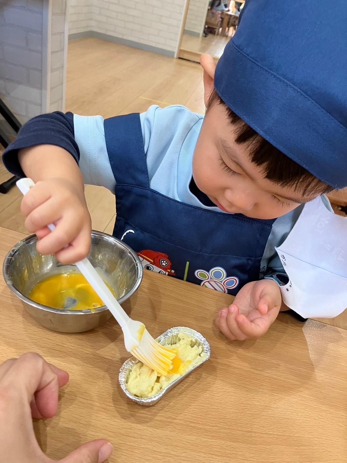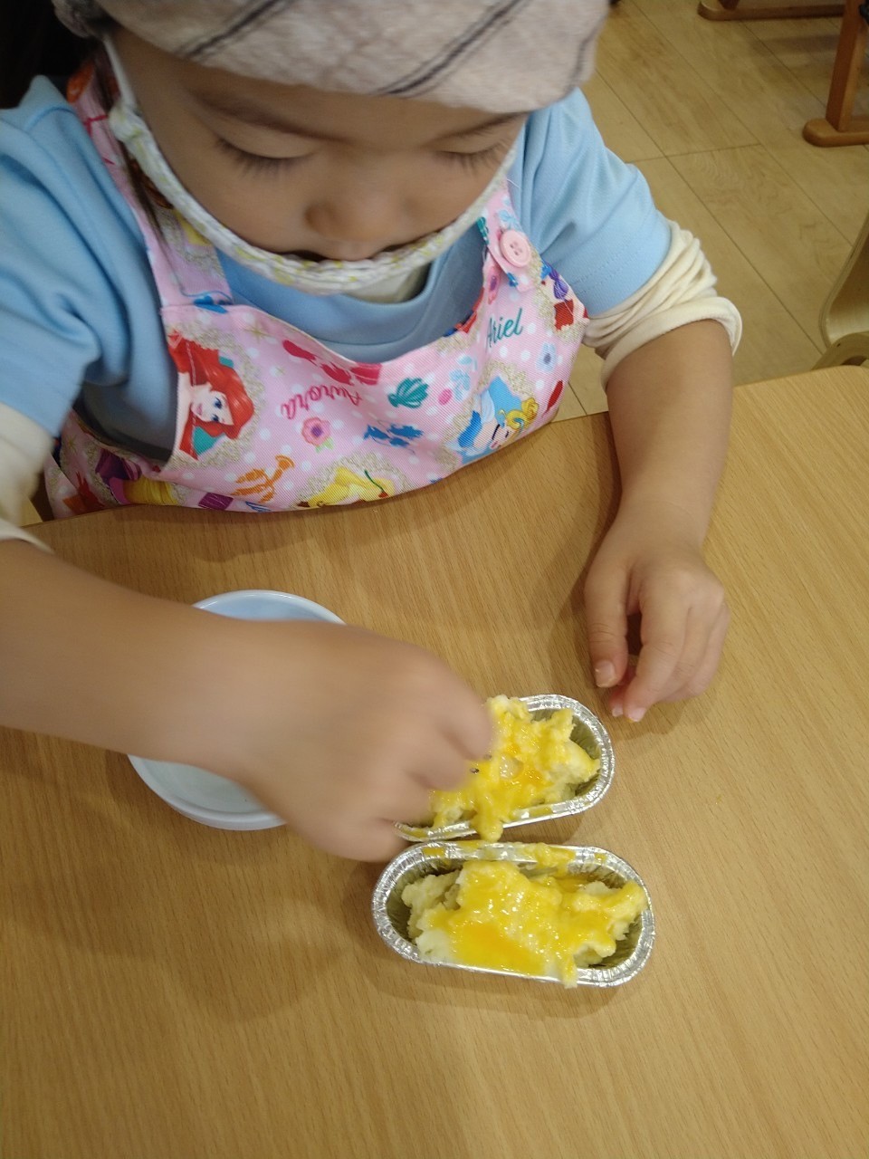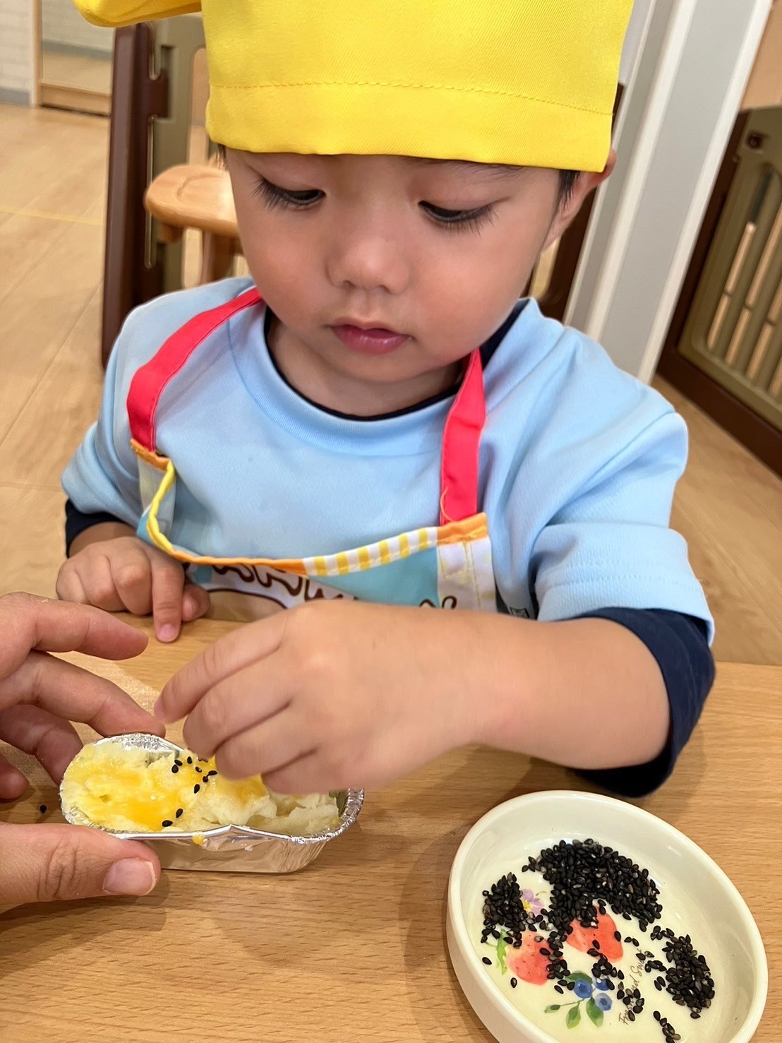 芋を麺棒で潰して、アイスクリームを混ぜ混ぜ🥣卵黄をヘラで塗って、ごまをパラパラ〜と散らすと美味しそうなスイートポテトが出来上がりました💕みんな仲良く順番こしながら、楽しいクッキングの時間になりました🍠💓