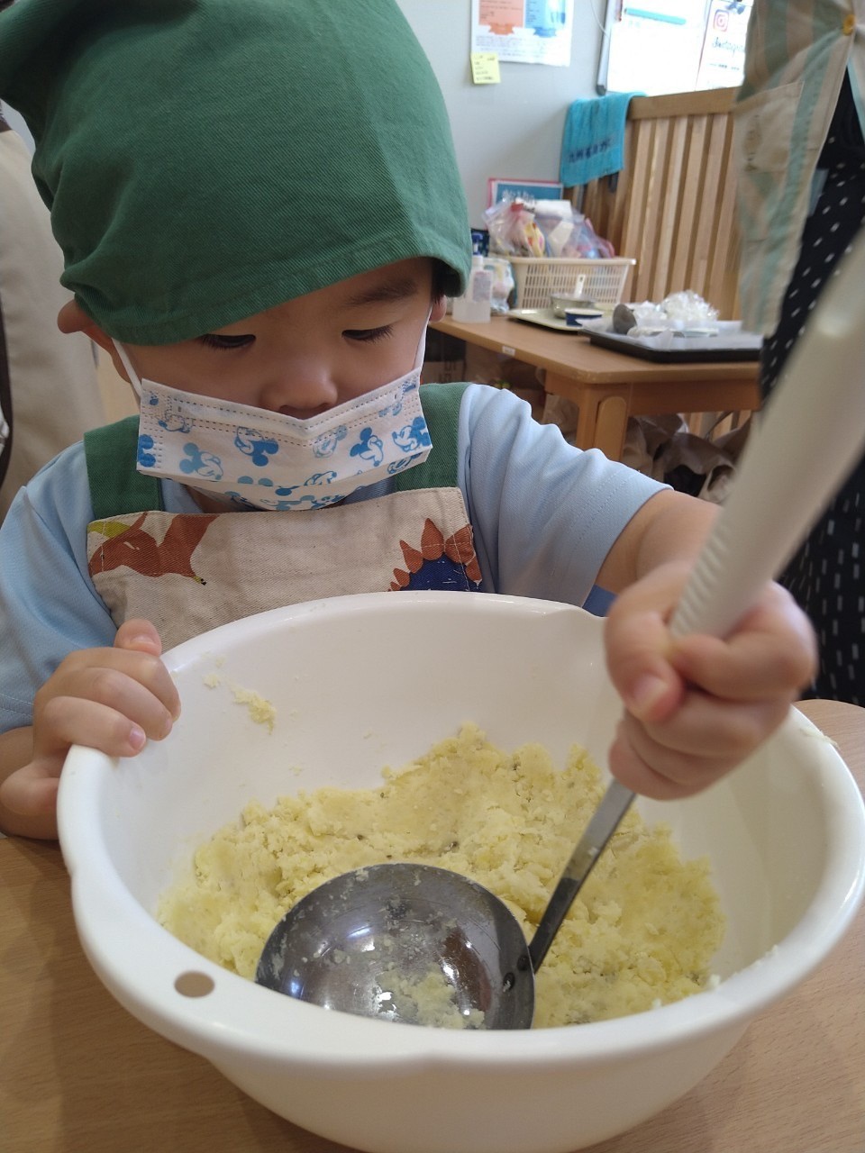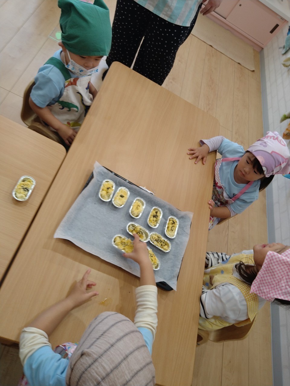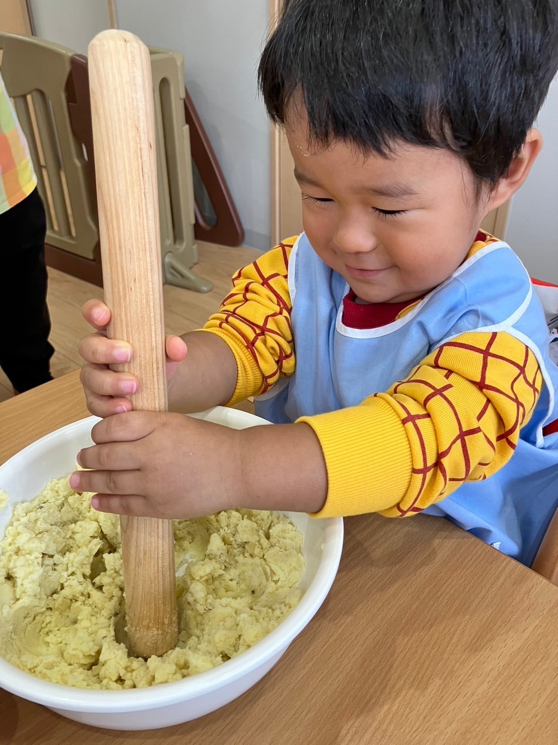 芋を麺棒で潰して、アイスクリームを混ぜ混ぜ🥣卵黄をヘラで塗って、ごまをパラパラ〜と散らすと美味しそうなスイートポテトが出来上がりました💕みんな仲良く順番こしながら、楽しいクッキングの時間になりました🍠💓