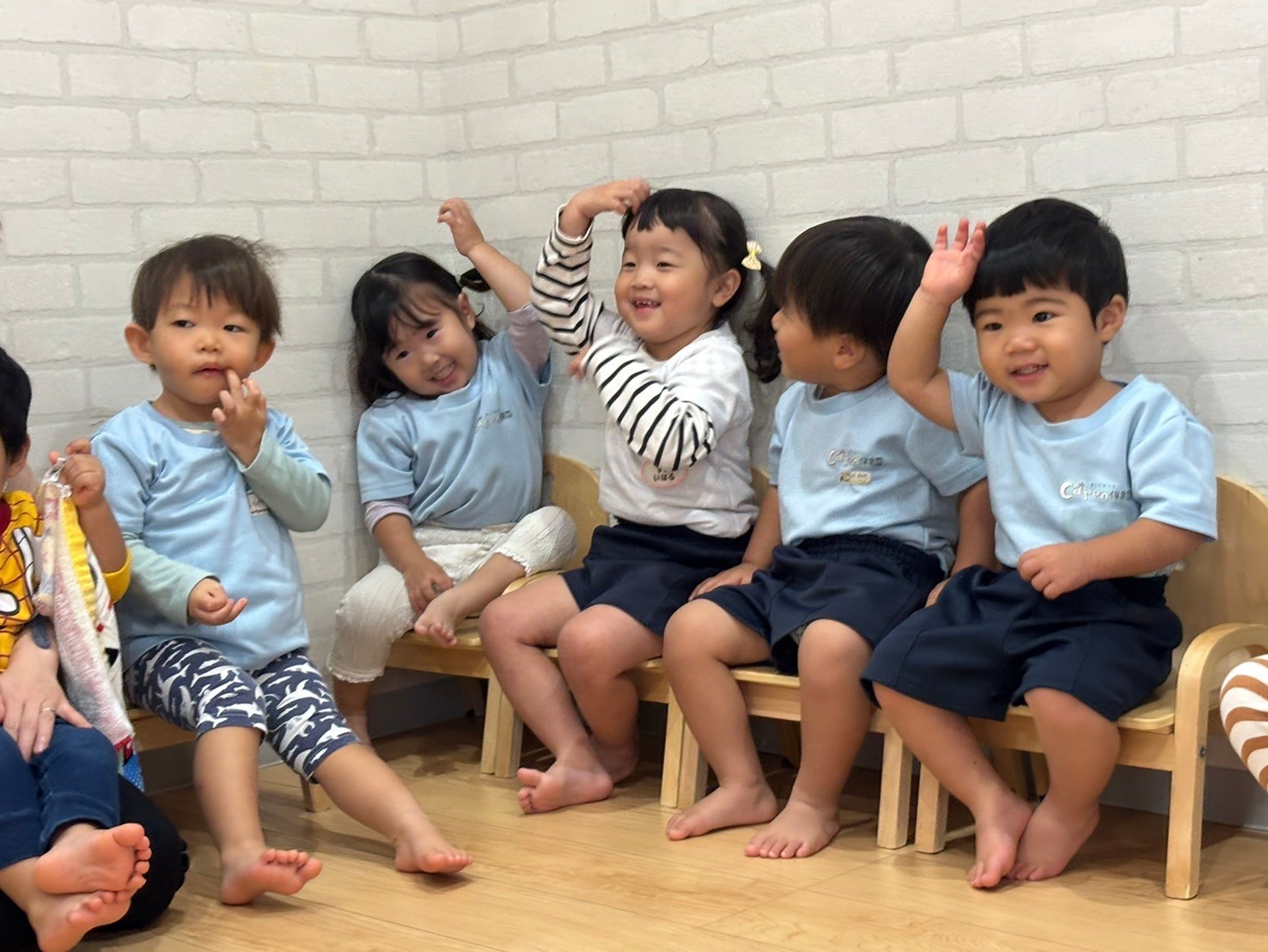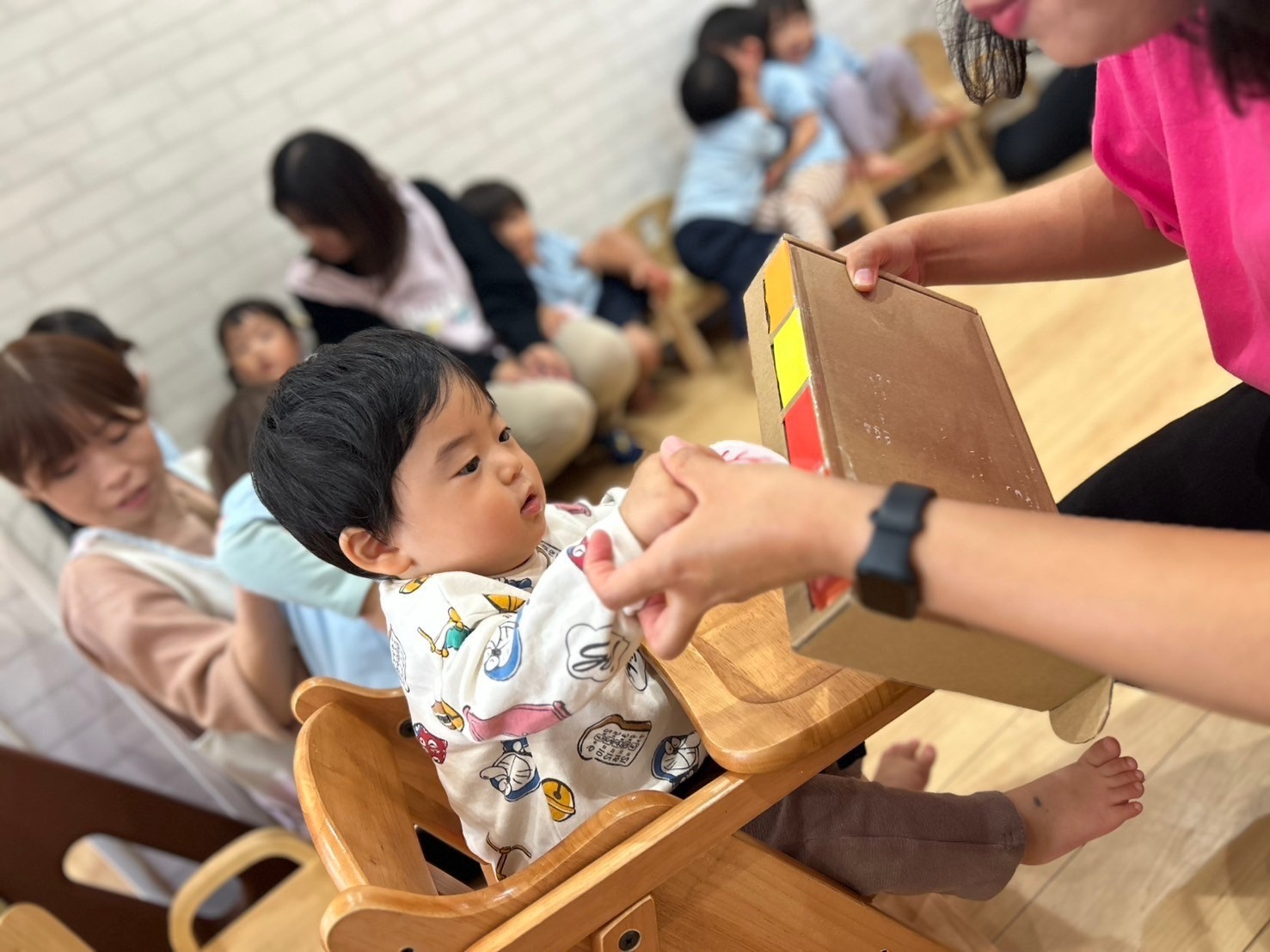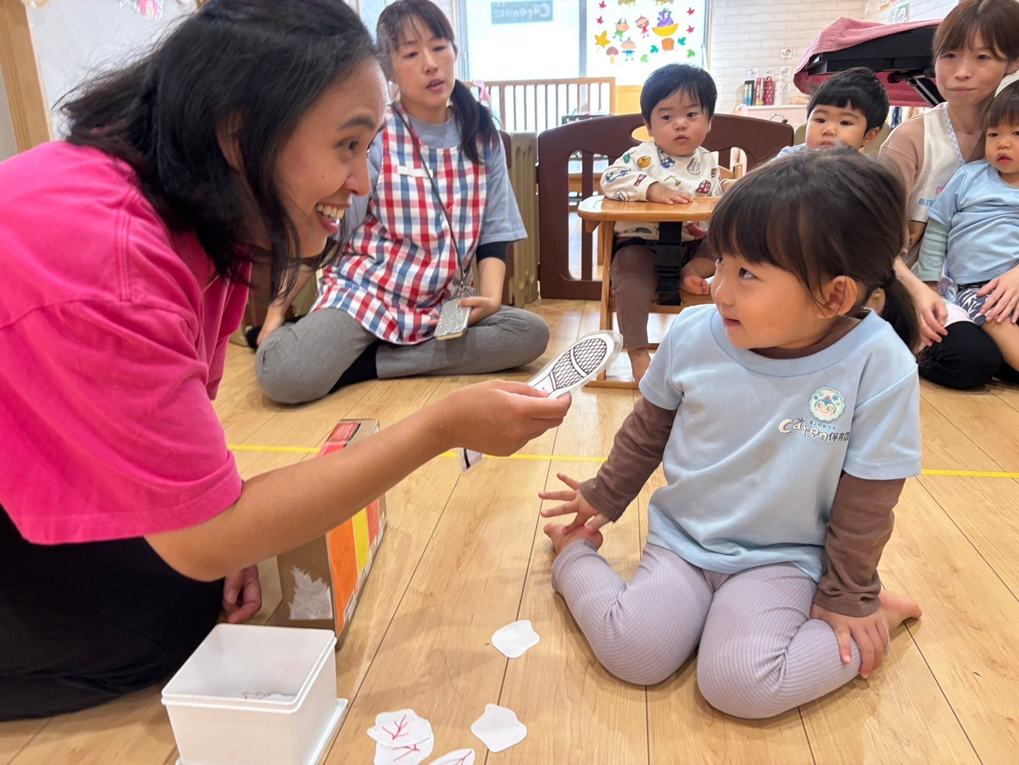 秋の葉っぱの色を英語で教えてもらい、同じ色のボックスに入れていくゲームでは、ワクワクしながら順番を守って楽しむことができましたよ🍂🍁