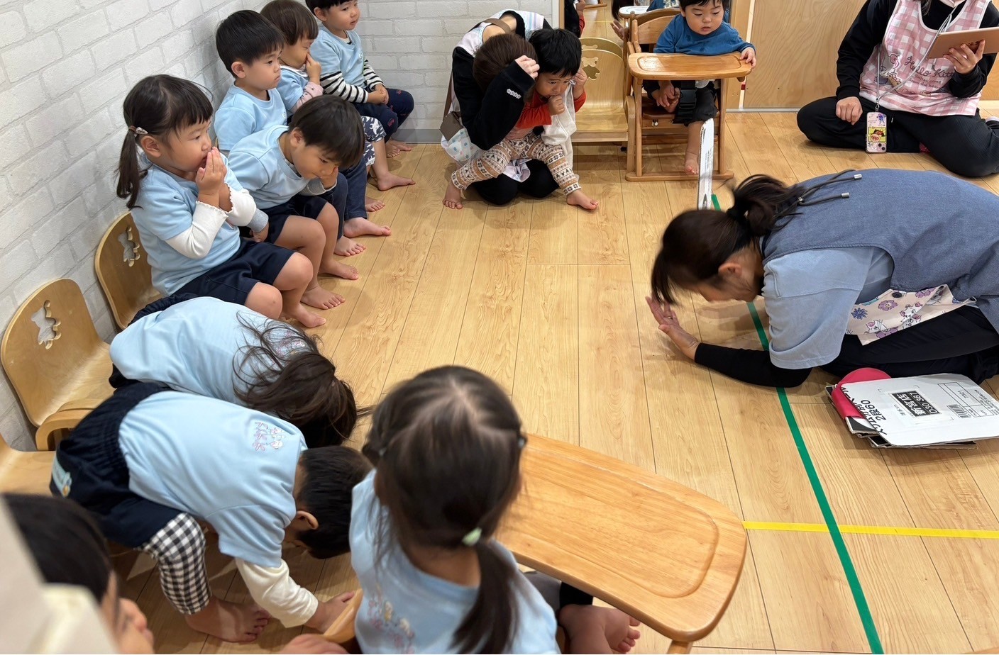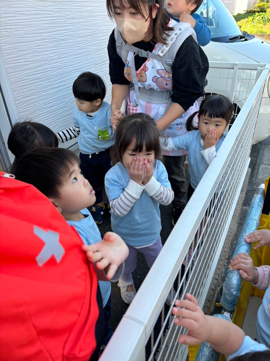 地震の際にはダンゴムシポーズで頭を守る‼火災の際はひよこのように小さくなって逃げる‼など、紙芝居を通してみんな理解できたようで、サイレンが鳴っても焦る事なく避難できました💙💜