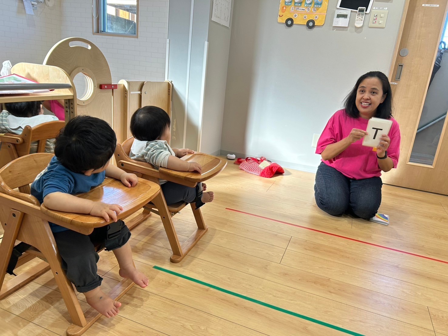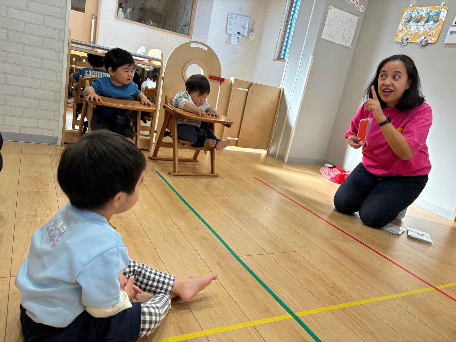 『Hello〜💕』と元気な声のチャリナ先生につられて、みんなも笑顔で『ハロー』と答えていました✨アルファベットカードもドンドン覚えてきています。🎶Autumn Leavesの歌も🍂葉っぱの動きを上手に真似っこしています🍁