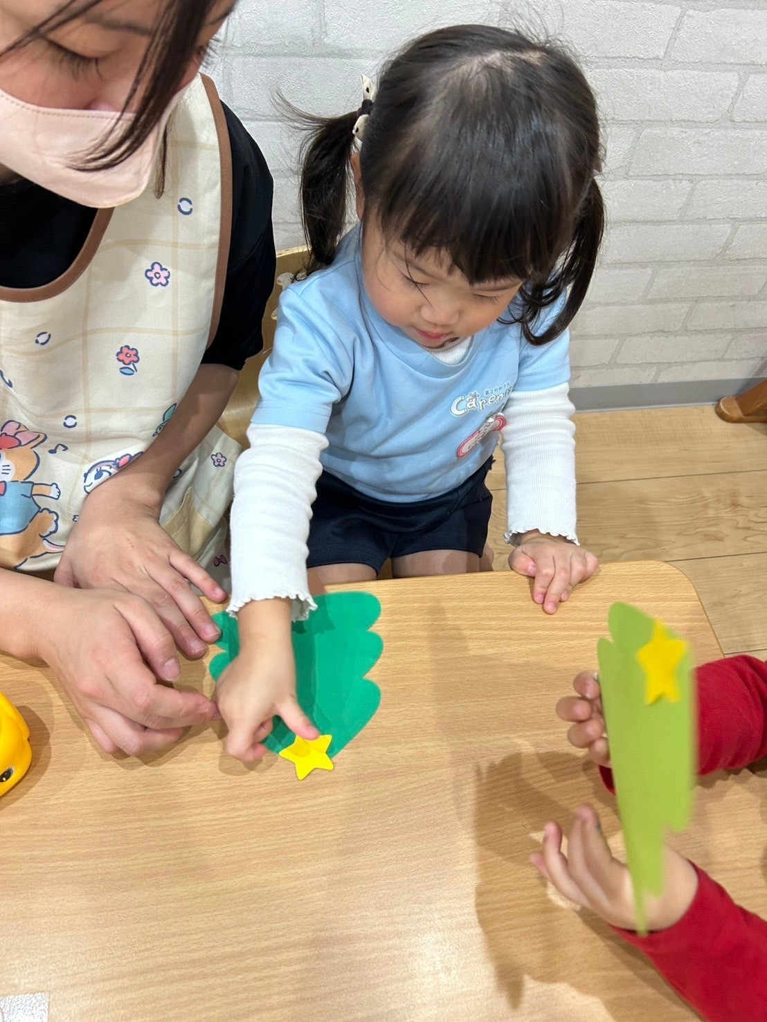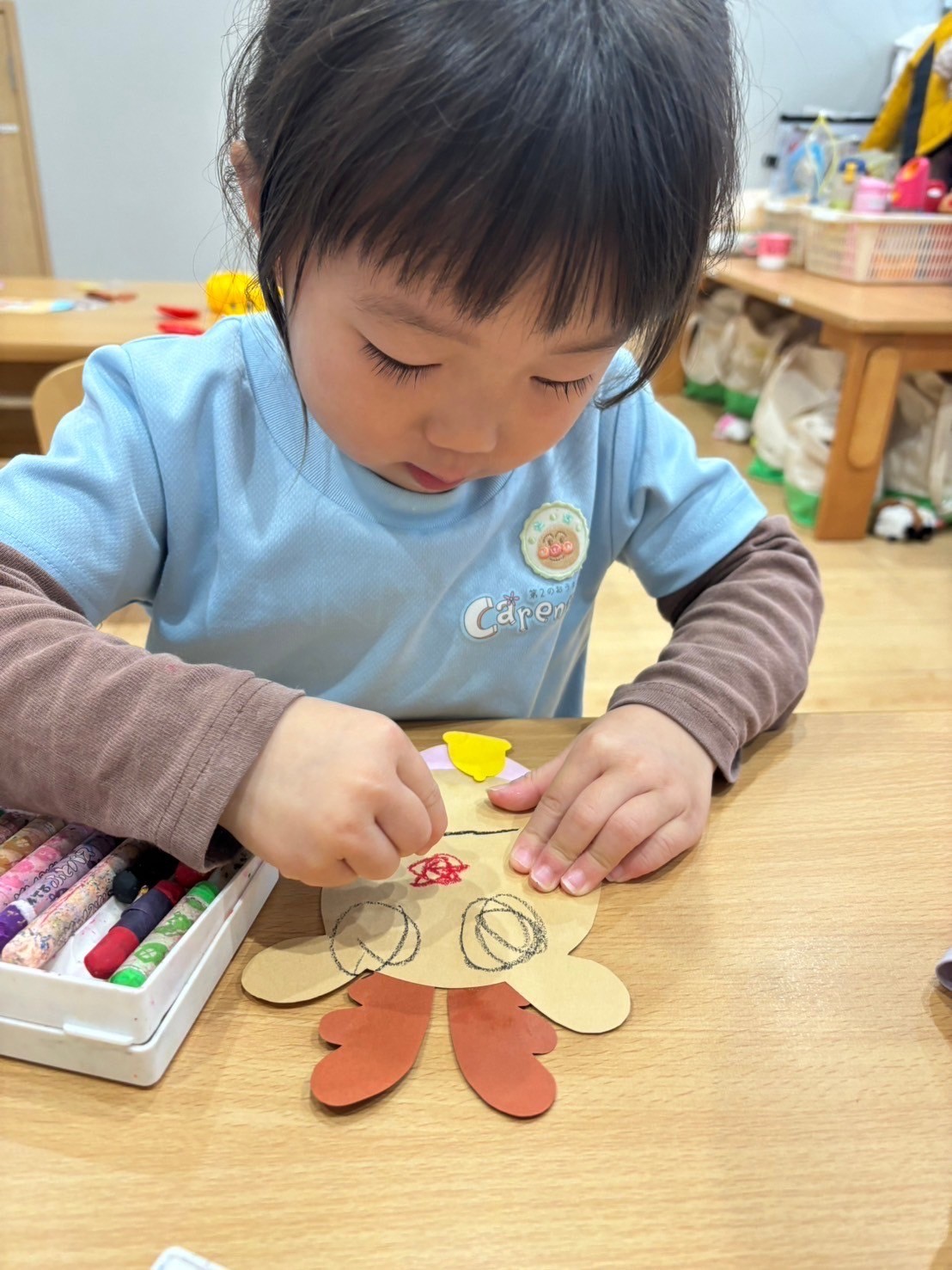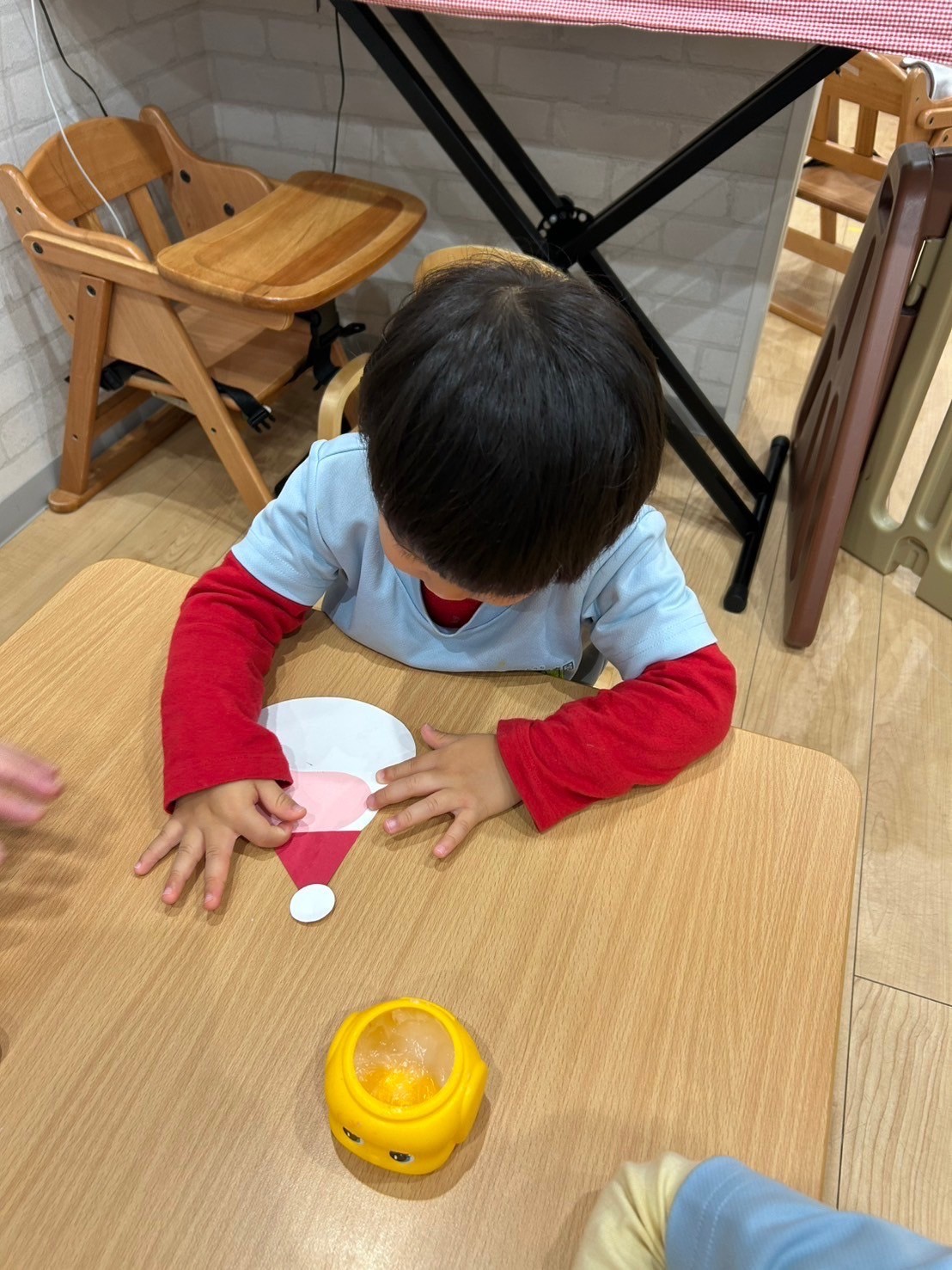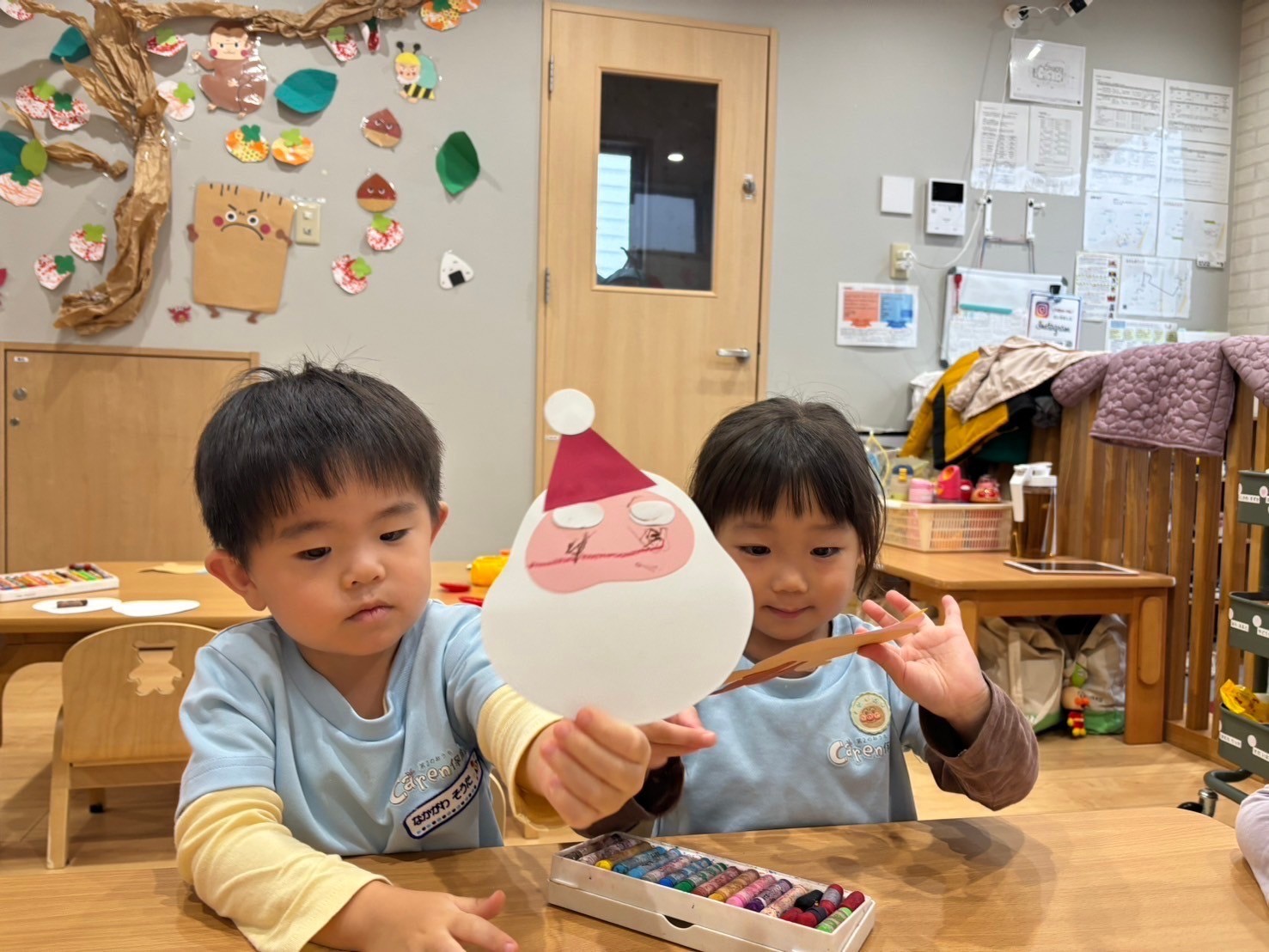 サンタと、トナカイを選んでいざ糊貼り!!『少しだけ』つけるのが難しいみんなでしたが、それぞれのパーツを貼れました。クレパスでも目や口も描き自分だけのクリスマス飾りを作りました(クリスマス)【福津園の今日の給食です】