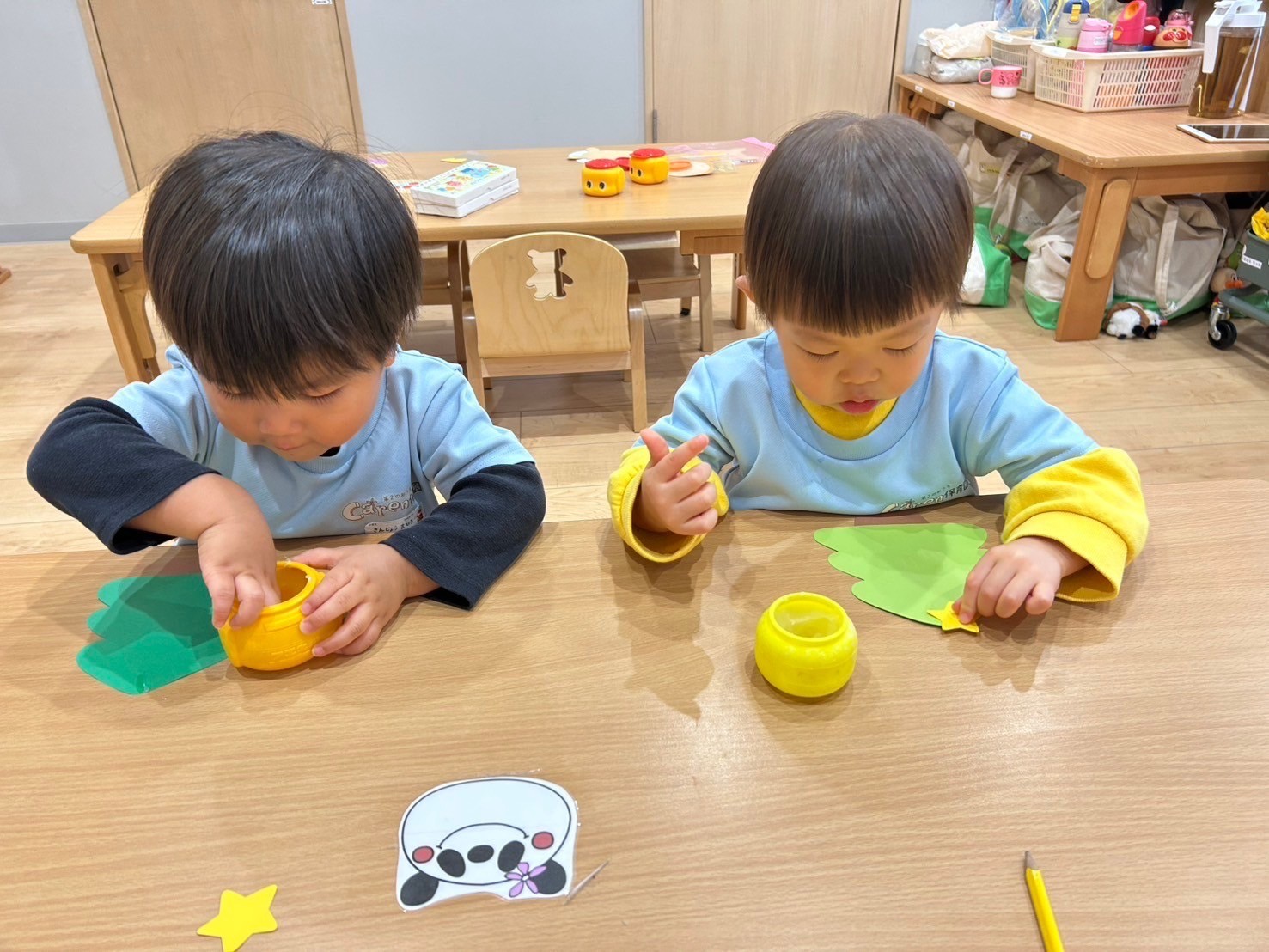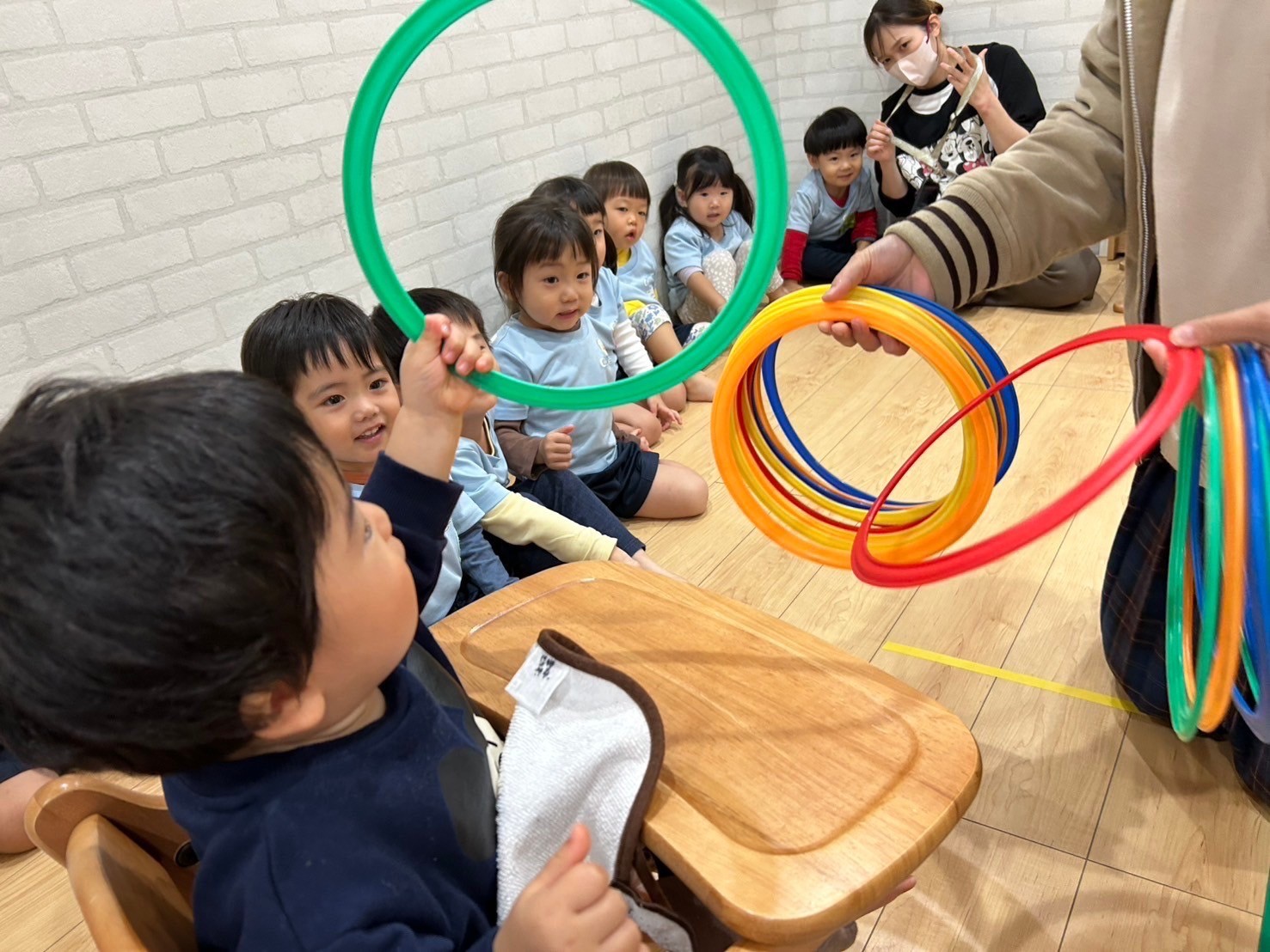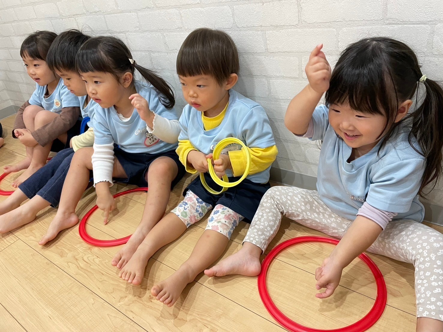今日はまゆみ先生のリトミックからスタート♪『たべたの だぁれ』の絵本に釘付けで聞くみんな(本)(本)ドレミの階名もテンポ良く言えるようになりました(ハート)カラフルフープも好きな色があるようで「赤がいいー緑がいいー」と、しっかり自分の気持ちも言えています(きらきら)