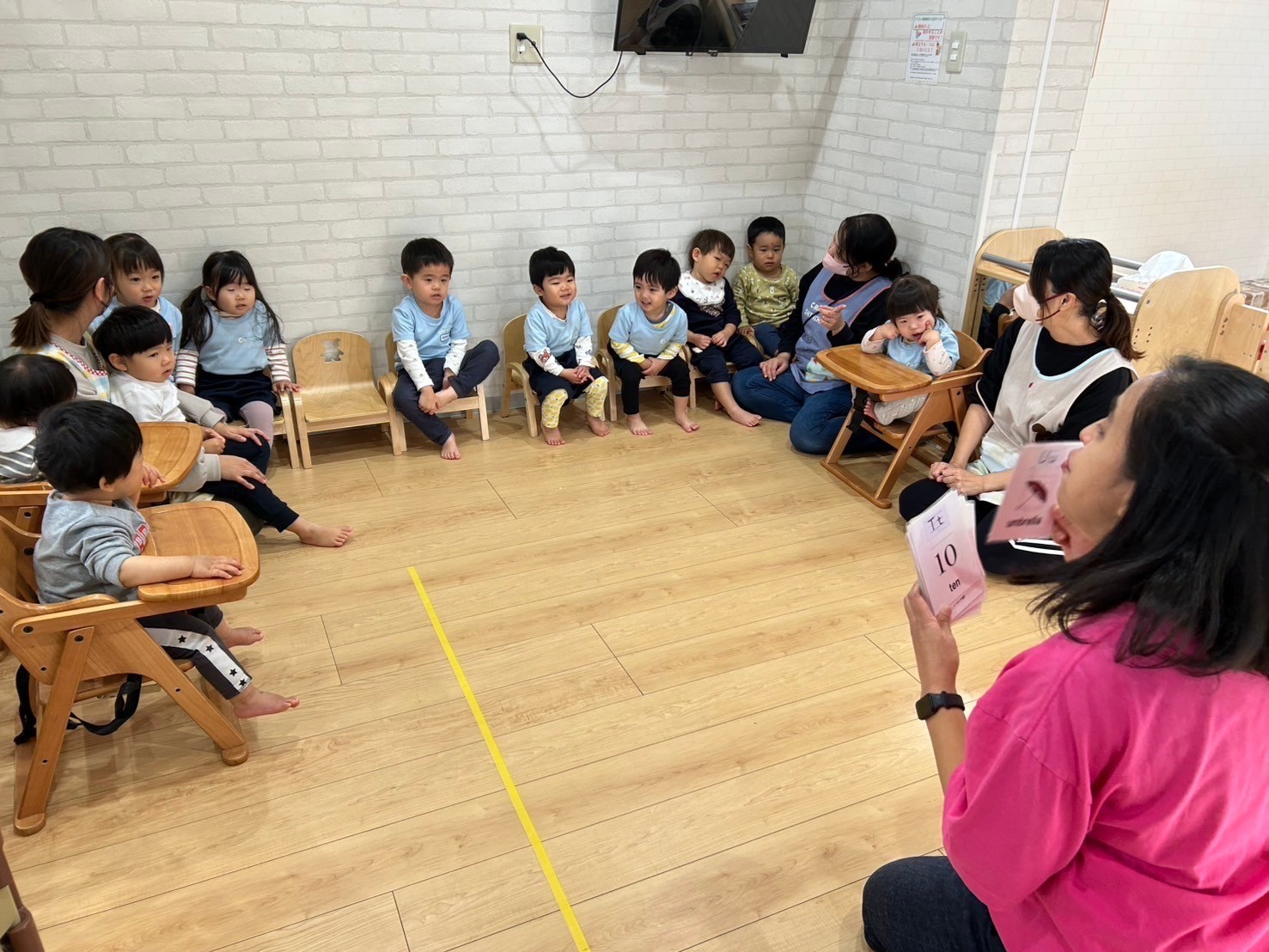今日はチャリナ先生の英語教室🎶アルファベットのカードを見てどんどん単語を答えていくお友だち❤️成長しています✨『クリスマスのかくれんぼ』の絵本も集中して見入っていました(クリスマス)