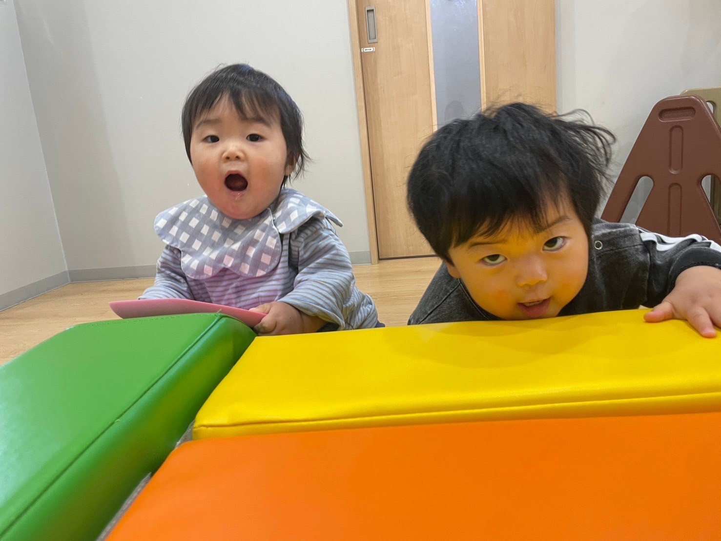 風に飛ばされる枯れ葉を追いかけて体もポカポカになりました🌬🍁お部屋で遊んだお友だちはカメさんマットで体を動かしました🐢