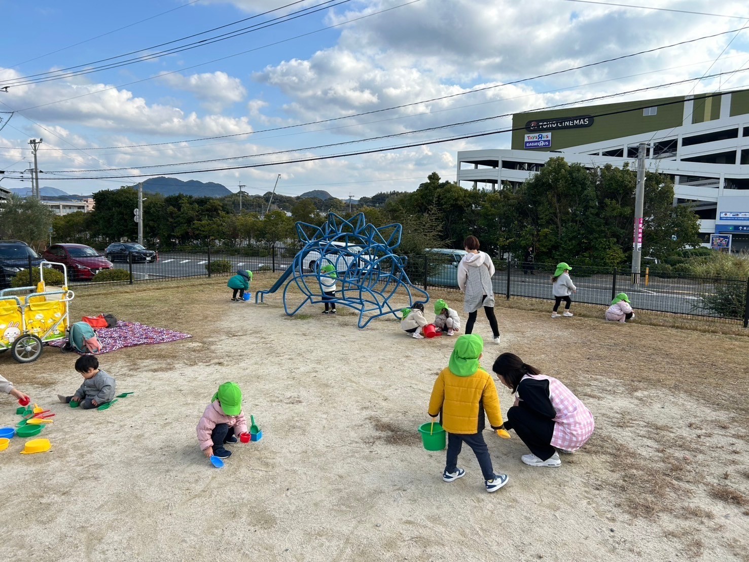 その後は『むつき公園』へ行きました。パンダさんは恐竜🦕のジャングルジムの上まで行けるかみんなで挑戦していました❣️上まで行く友だちを見て『すごいねー』と、刺激をもらいました🥰