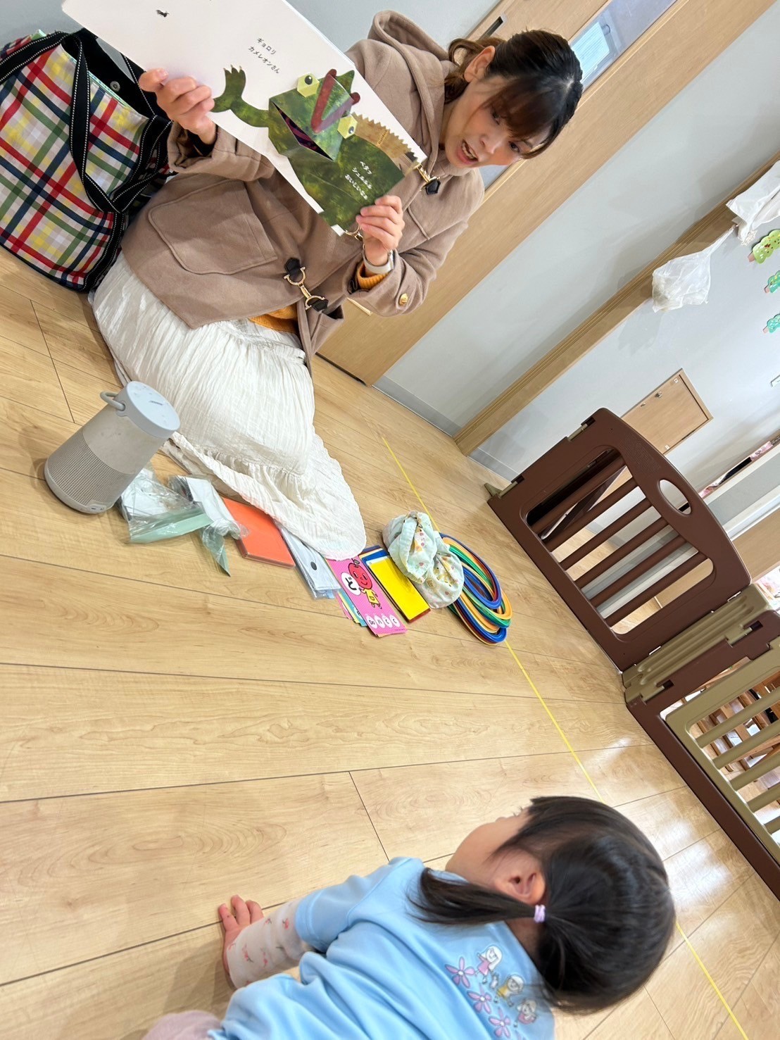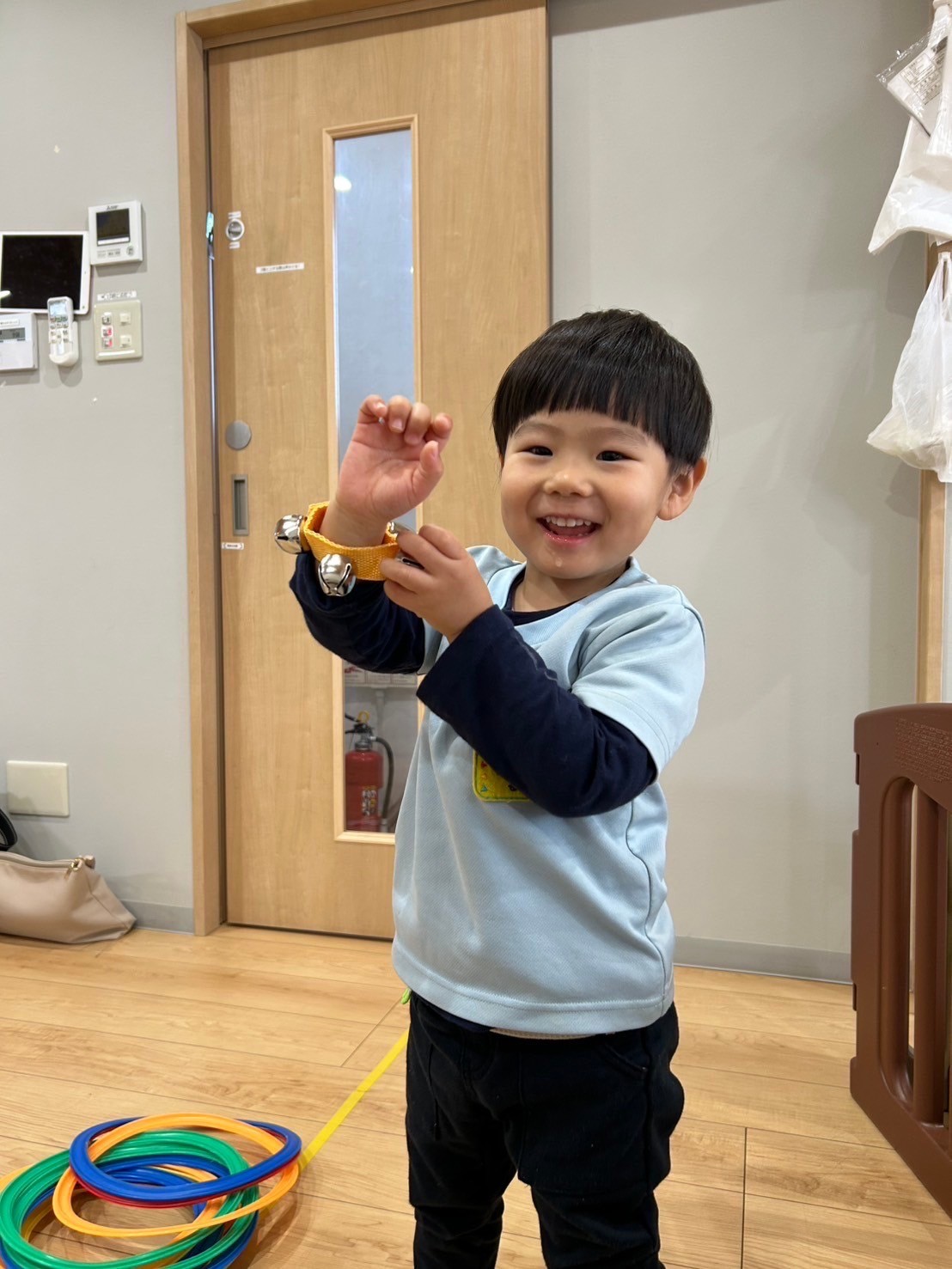 今日はまゆみ先生のリトミックの日🎶9つの楽しい物が並んでワクワク(楽しい)絵本、カード、階名カード、鈴に、カラフルフープどれもテンポよく進み、みんなもリズムに合わせて楽しく答えていきました💛❤️💙