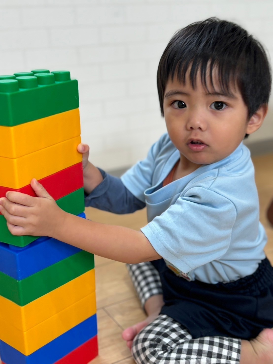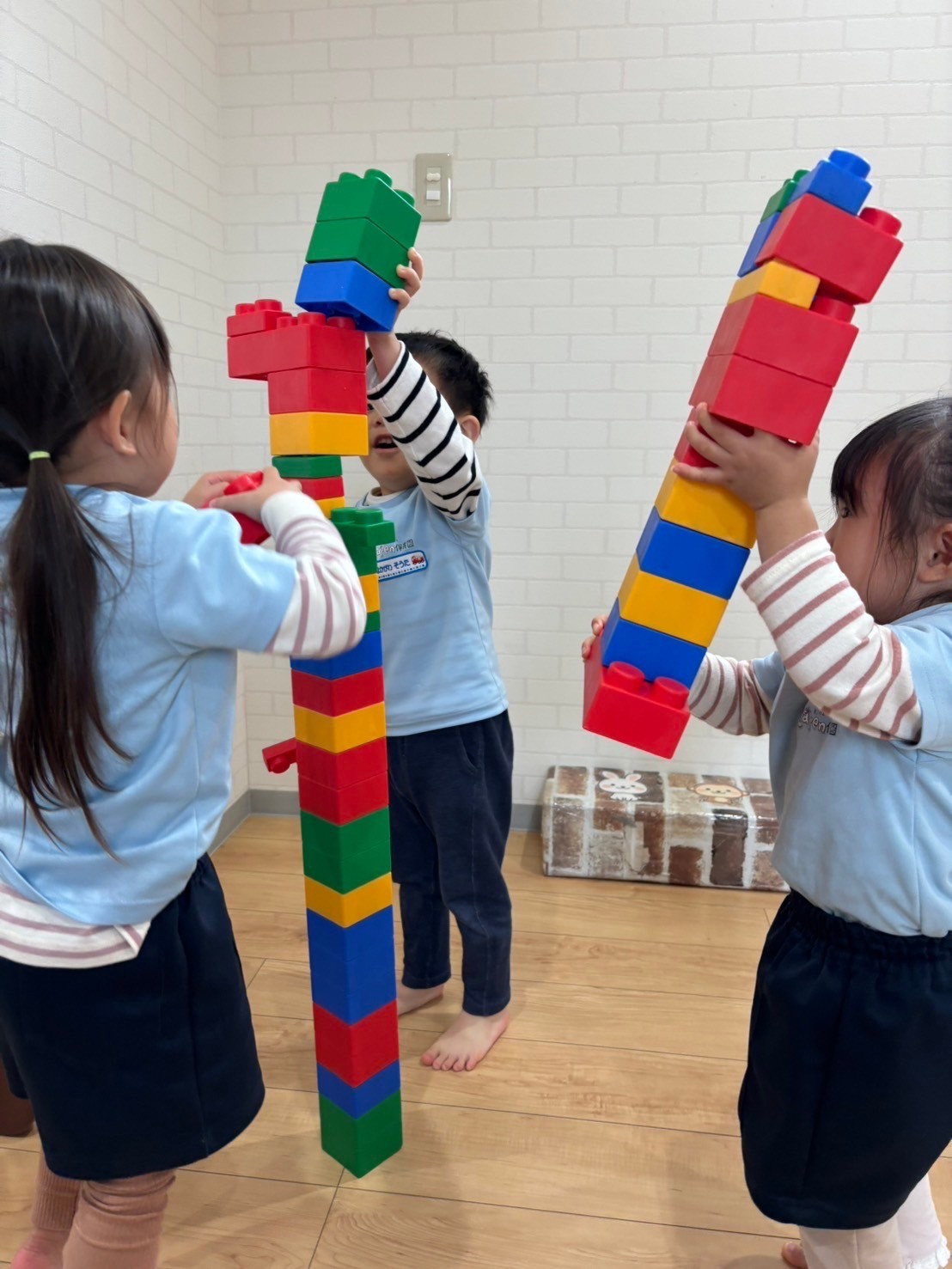 その間ブロック遊びをしましたよ😊友だちと一緒に高く積み上げてタワーを作ったり、キリン🦒を作って歯ブラシで🪥ゴシゴシ歯を磨いてあげたりと思い思いの遊びを展開していましたよ💕