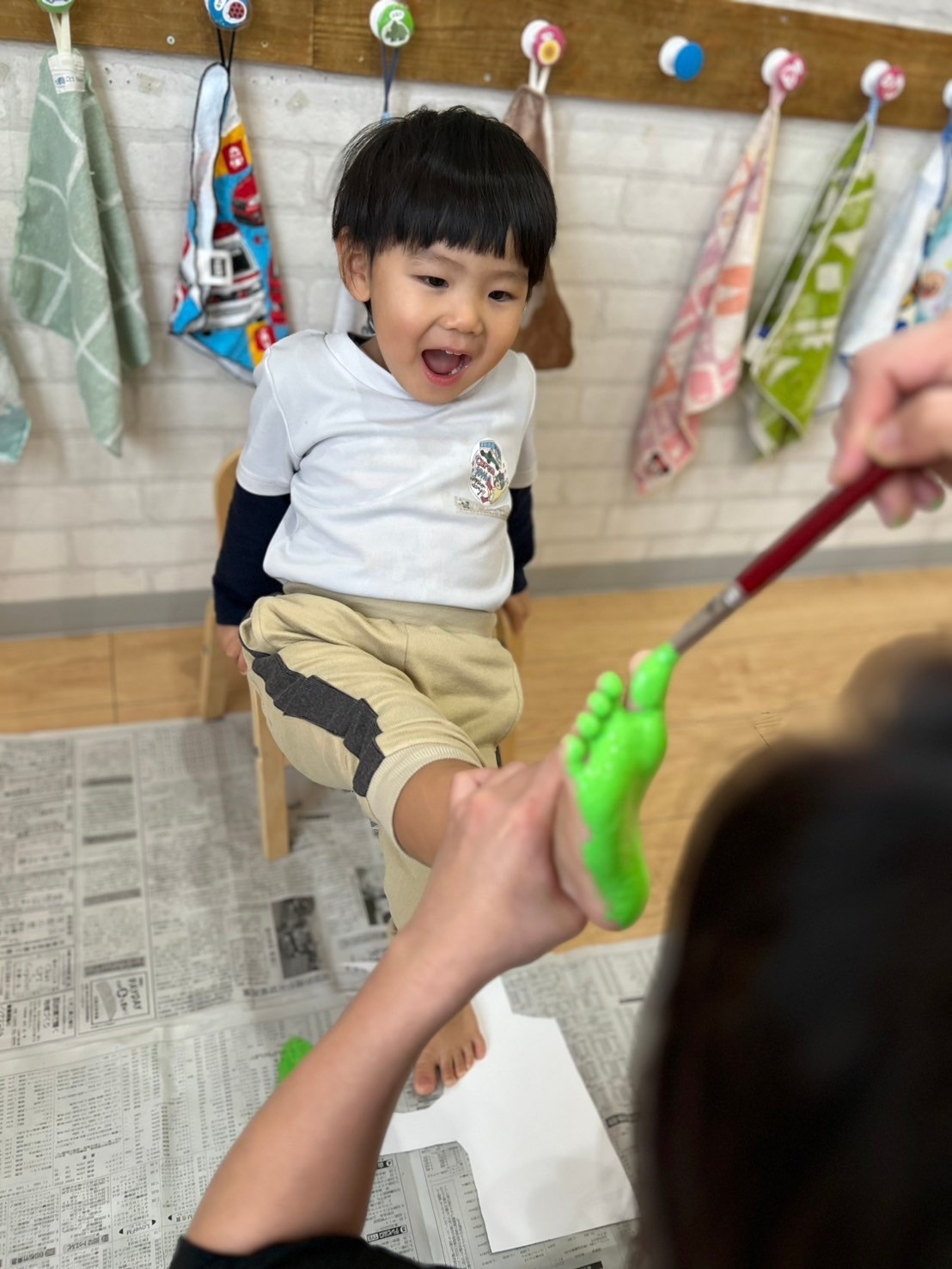 今日は来年度のカレンダー作りで1人ずつ足型を取りました✨先生が足の裏に絵の具をペタペタ塗ると、ちょっとくすぐったいけど、みんなワクワク♫可愛い足型ができました❣️出来上がりをお楽しみに🤗