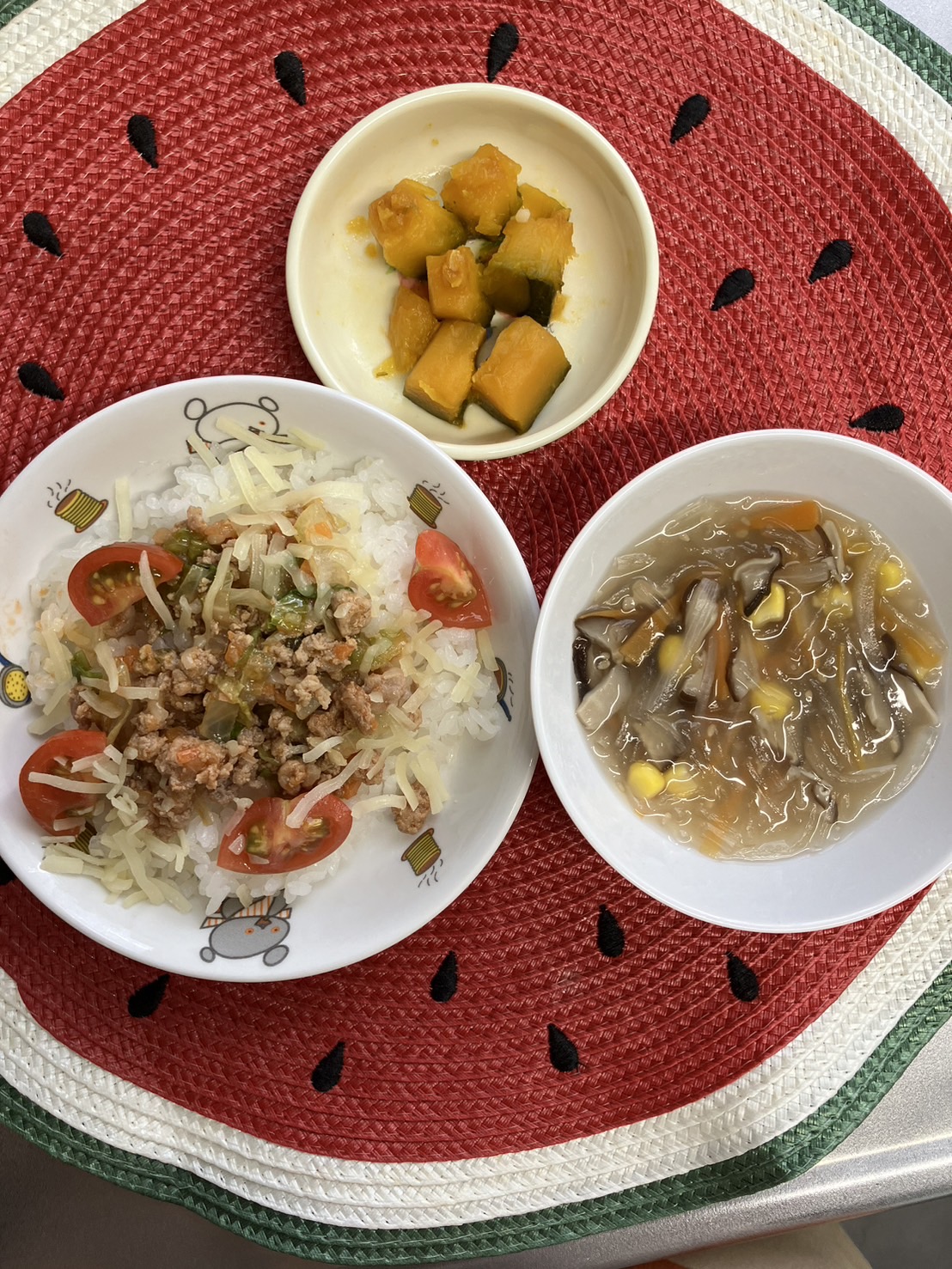 砂場ではケーキ(ケーキ)を作ったりプリン🍮を作ってあそびました(顔文字)【福津園の今日の給食です】