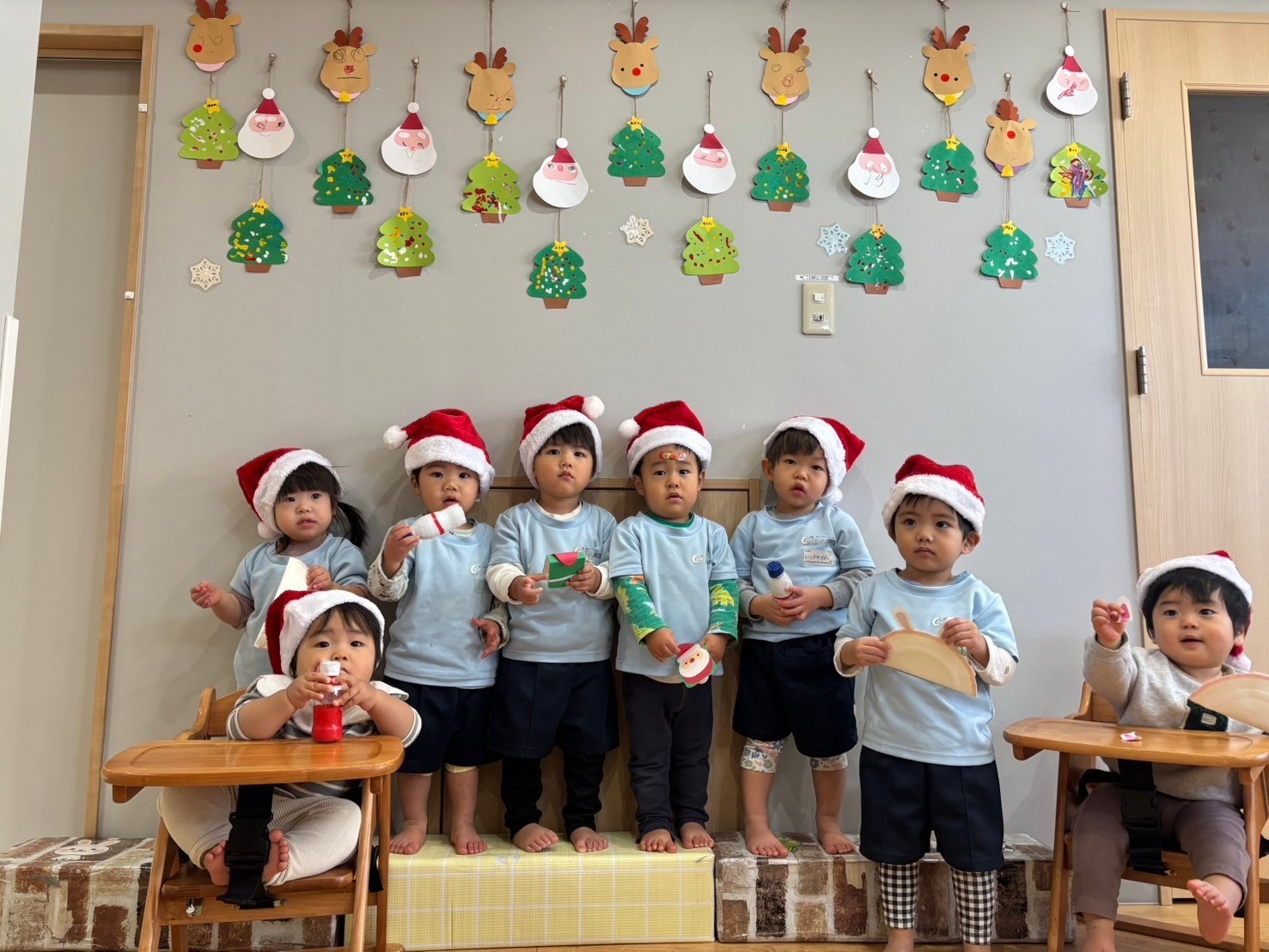 りす組🐿ひよこ組🐣はサンタの帽子を被って手作りのマラカスを使って『おもちゃのチャチャチャ』を演奏しました🥁🎻