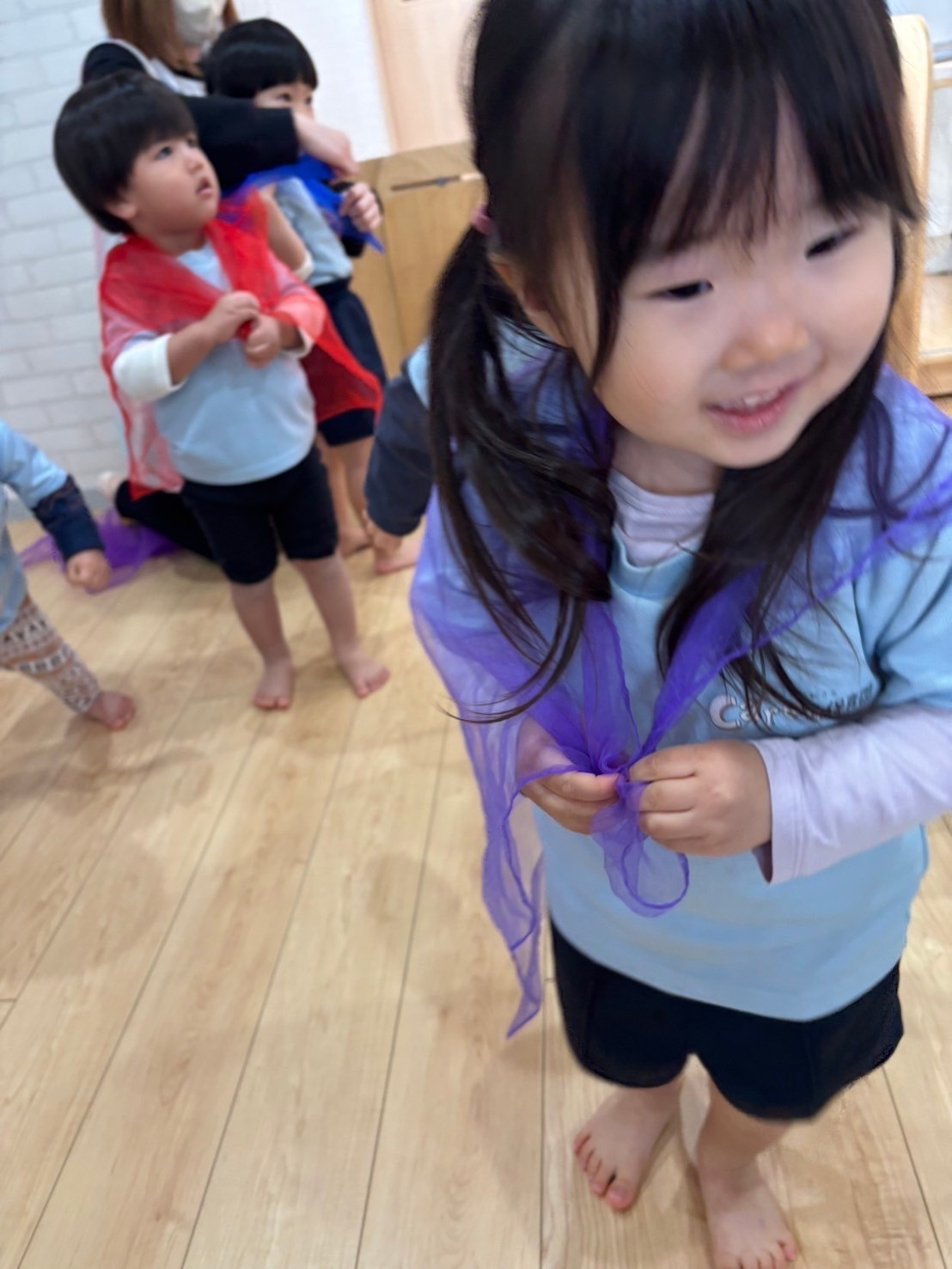 シフォン布をアンパンマンのマントに見立てて、びゅーんとお空を探検しましたよ💨