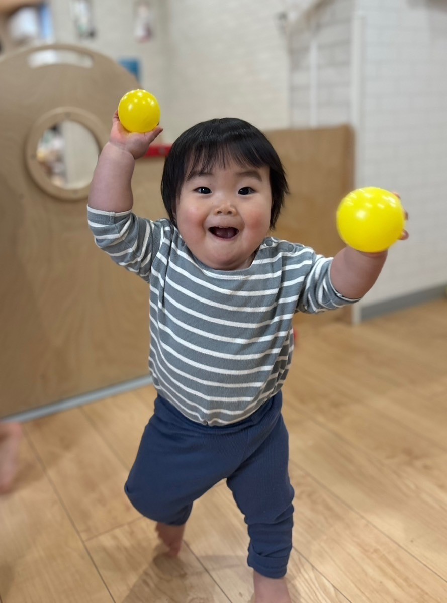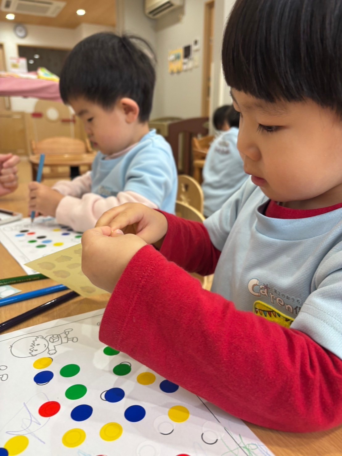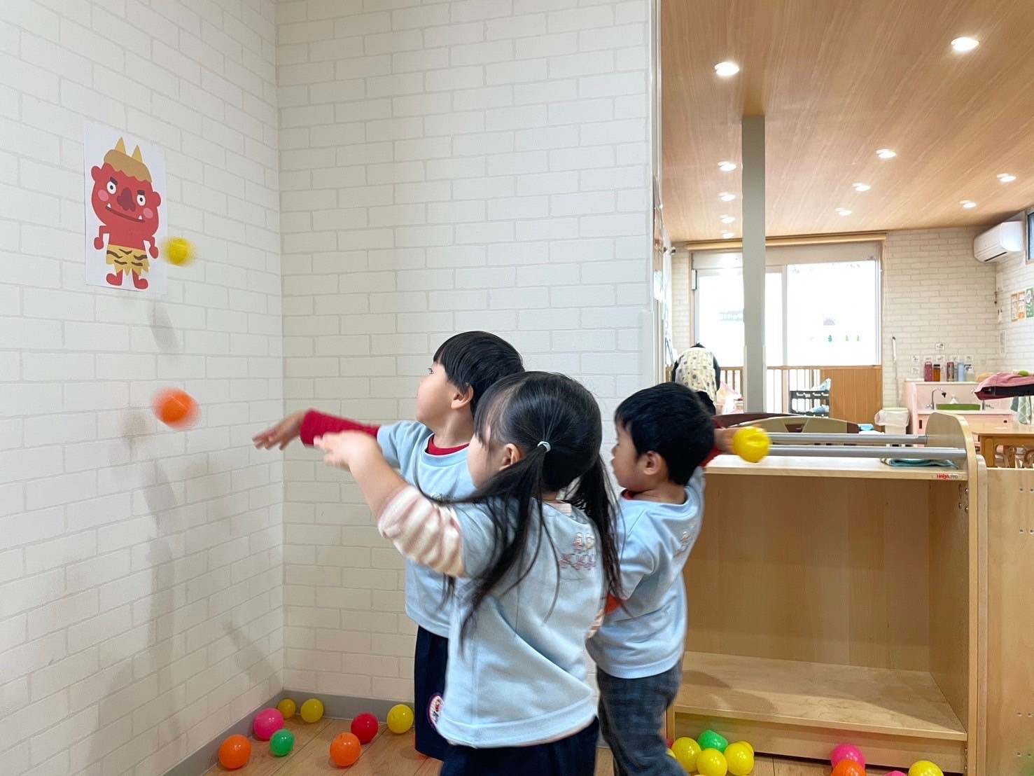 「あかおににしようかな?」「ぼくはあおおに!」と会話をしながらカラフルに仕上げていました🌈✨その後は、壁に鬼のイラストを貼って「おにはそと!ふくはうち!」の掛け声でボールを投げ豆まきごっこをしました🎱