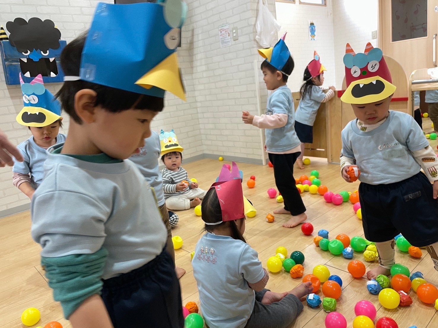 涙を流すお友だち😢や先生の背中の後ろに隠れて息を潜めるお友だち🥷もいましたが、頑張って鬼に立ち向かって「鬼は外〜🫘」とボールを投げるお友だちもいましたよ☺️