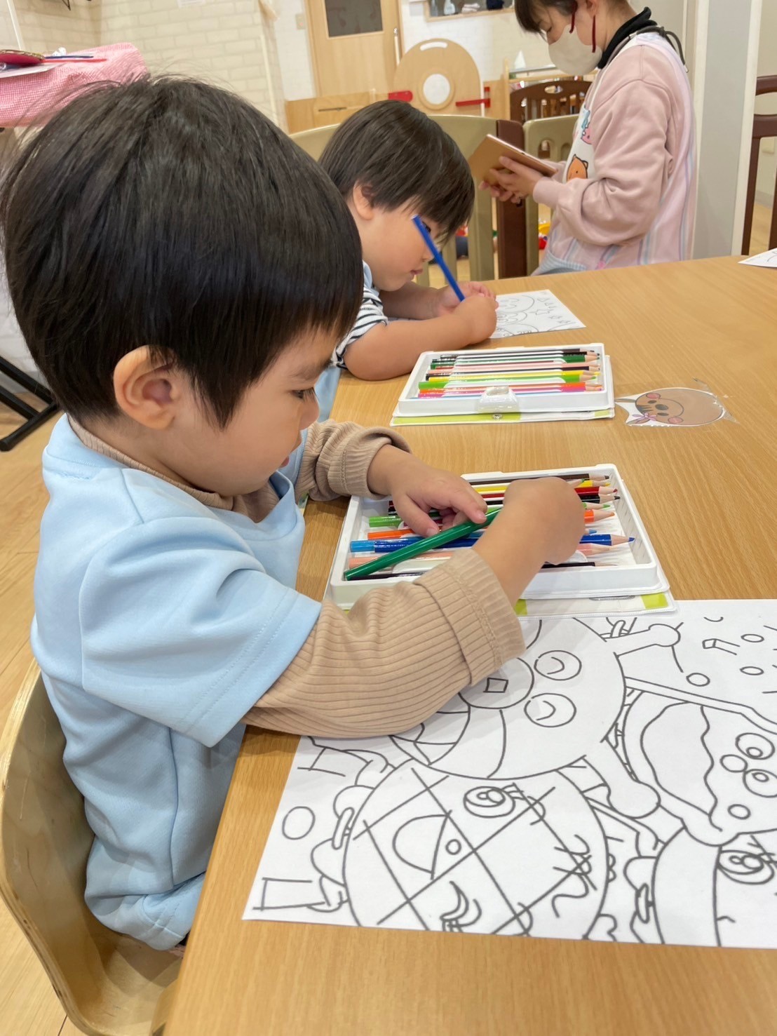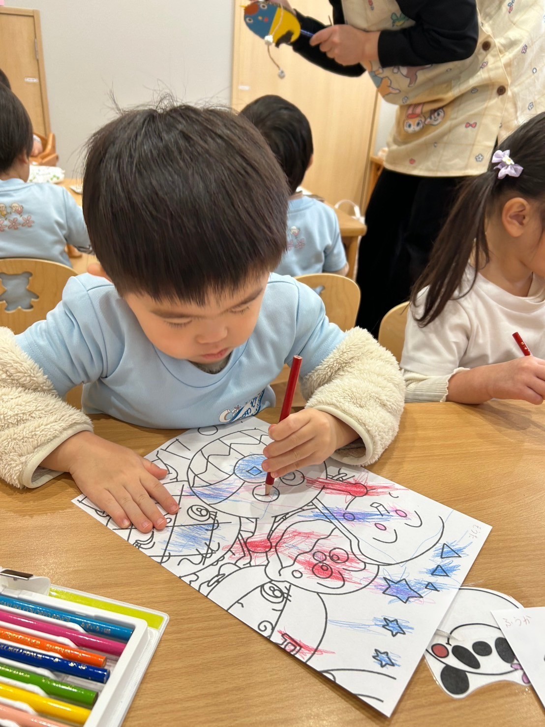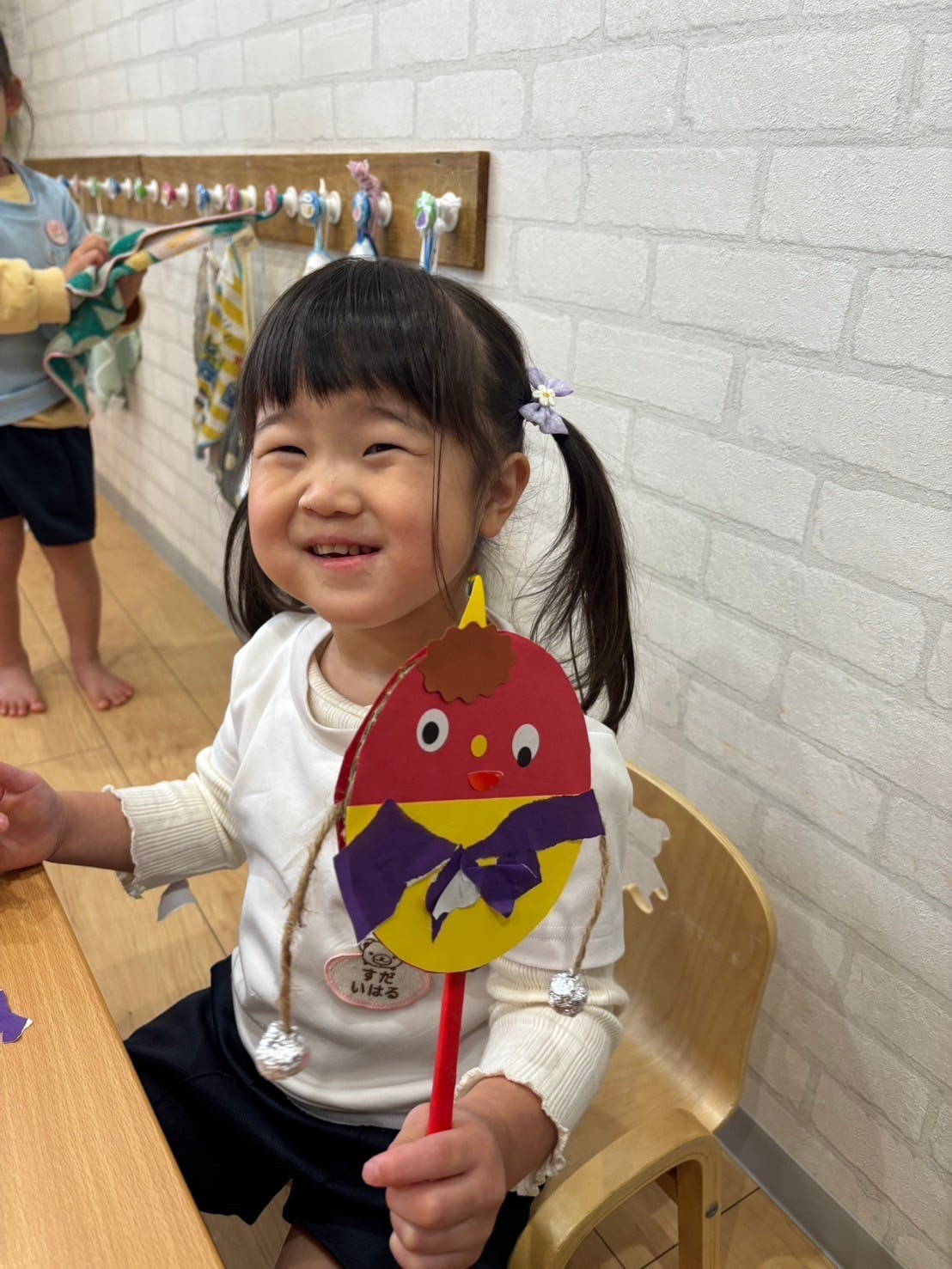 外は雪☃️吹雪のような雪❄️そんな日は お部屋でのんびり過ごします❤️今日は 塗り絵と、制作に分かれて活動をしました。制作はでんでん太鼓を作りました🌵一つ一つのパーツをタックシールや、のりで貼り、折り紙も自分でビリビリ破いて鬼のパンツ模様もできました(きらきら)出来上がった作品をクルクル動かして 友だちとも遊びました(happy)