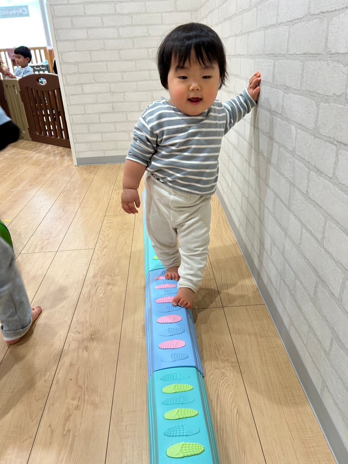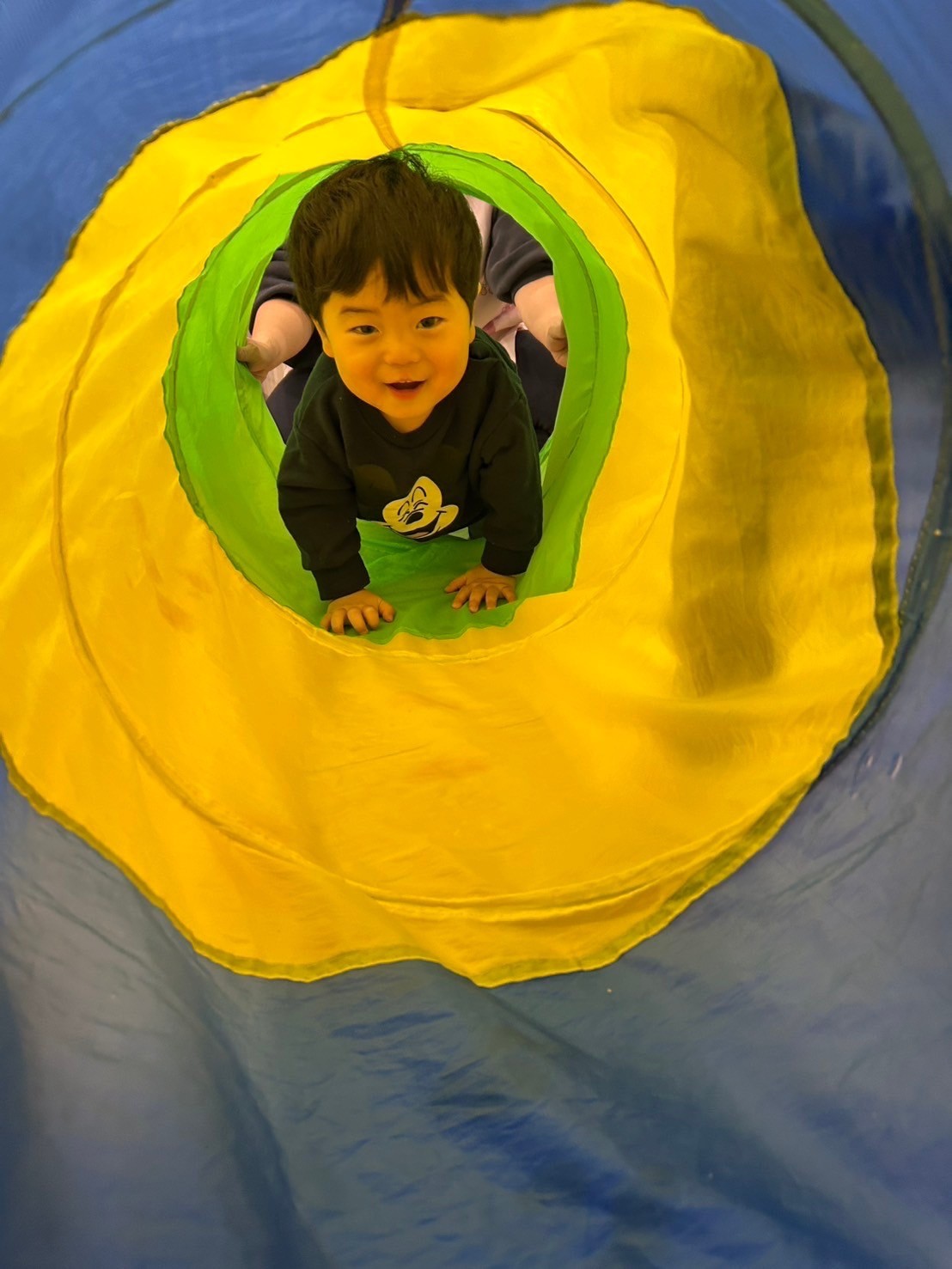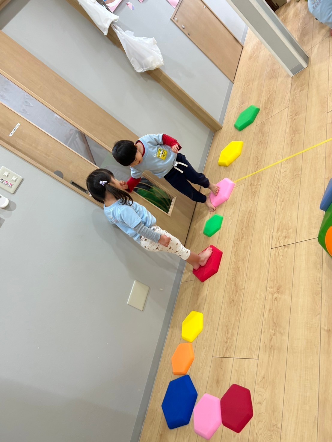 朝の会から元気がありあまっていたので、今日は室内でサーキット遊びをしましたよ🏃💨カメさんマットを真ん中に、周りを平均台やとびとびマット、トンネルで囲み準備をすると目がキラキラ輝いてきたお友だち🤩バランスをとりながら進んだり、カメさんマットに全身を使って登って滑り降りたり、たくさん身体を動かしていました🤸‍♂️