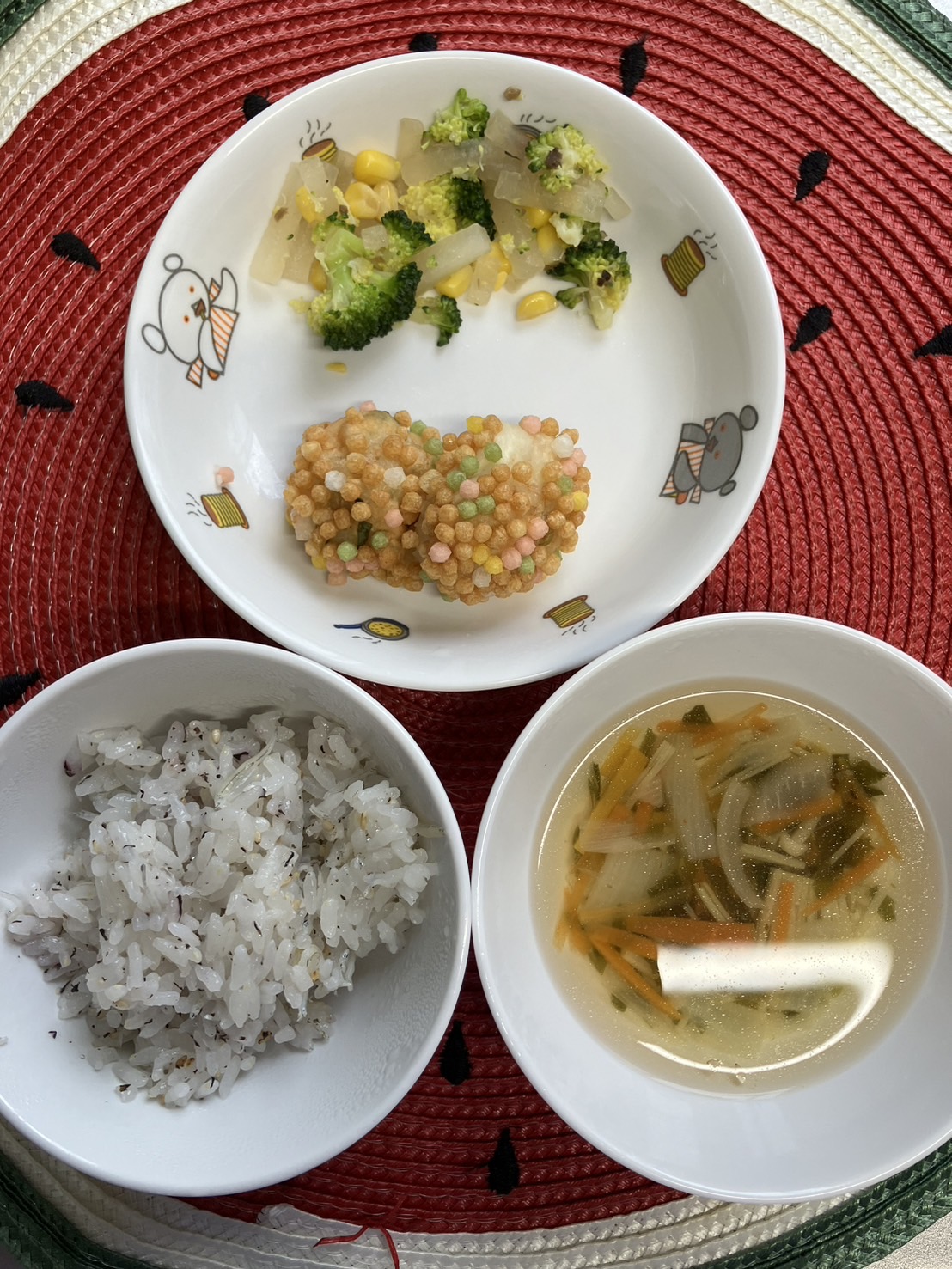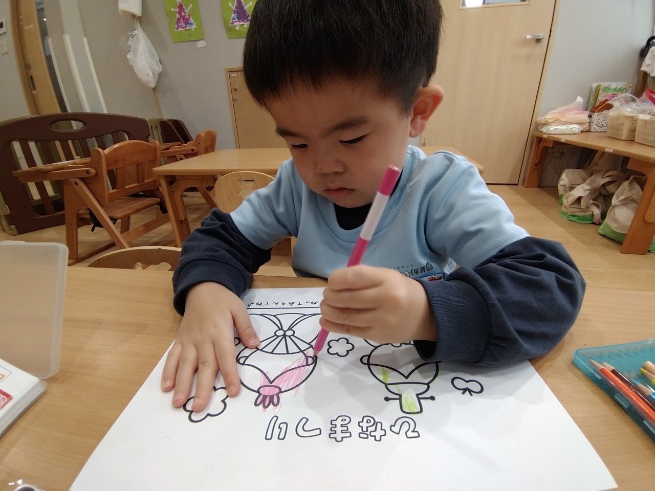 目や口を描いて、お花をピンクで塗って「せんせーできたよ🩷」と嬉しそうにする福津園のお友だちでした✨【福津園の今日の給食です】