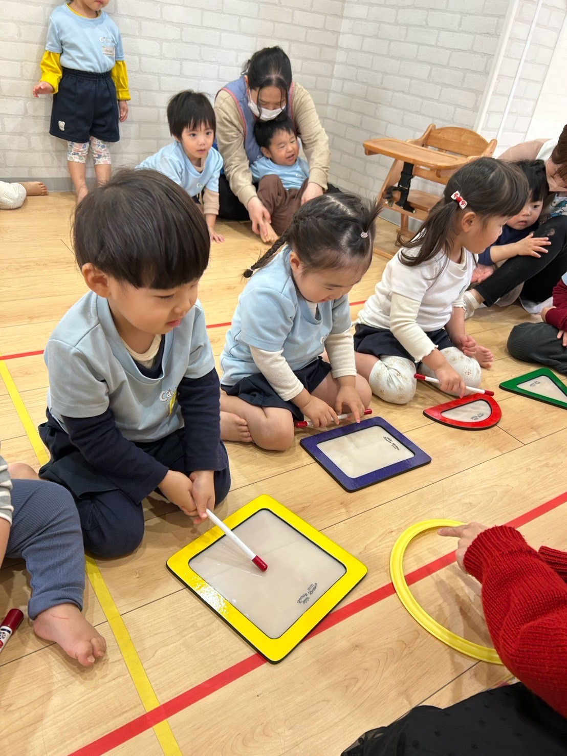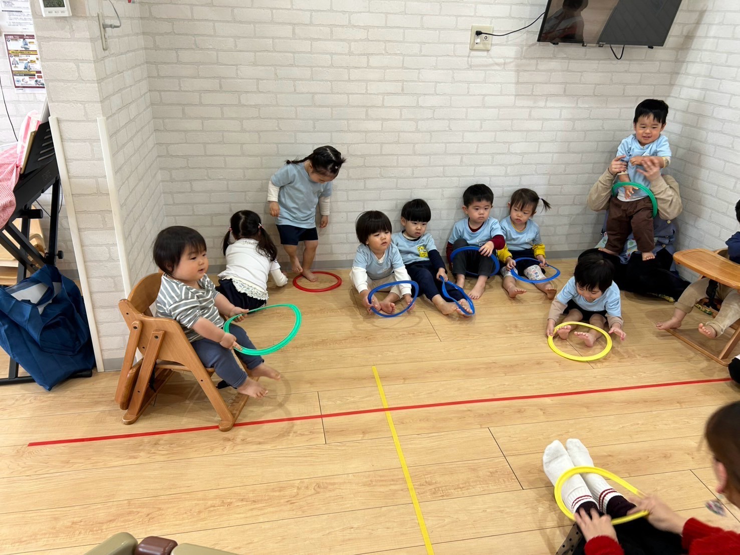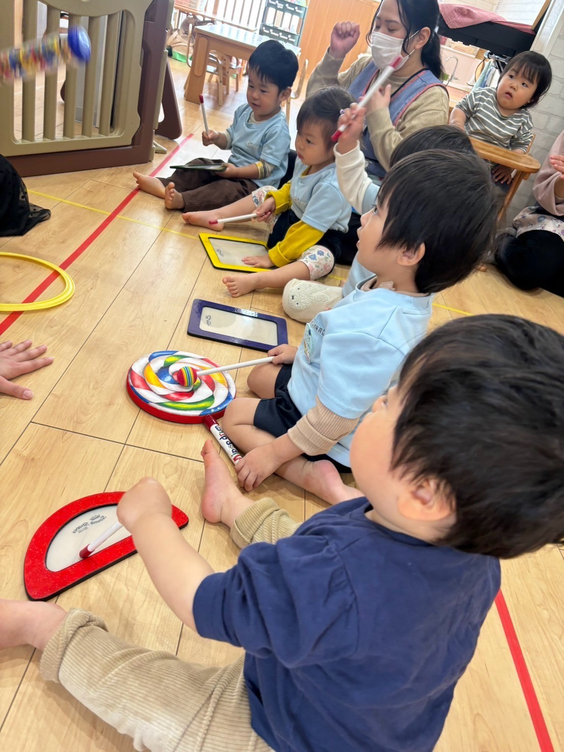 太鼓遊びでは カードがバックに入るとあら不思議🌟同じ形の太鼓が次々に出てきて「ワァーオ!」と、ビックリ‼︎‼︎太鼓叩きも上手にリズムにのれていました♡そして最後は いつものカラフルフープを持って🎶バスごっこの歌に合わせてドライブ(ドライブ)もしました🟢🟡🔴