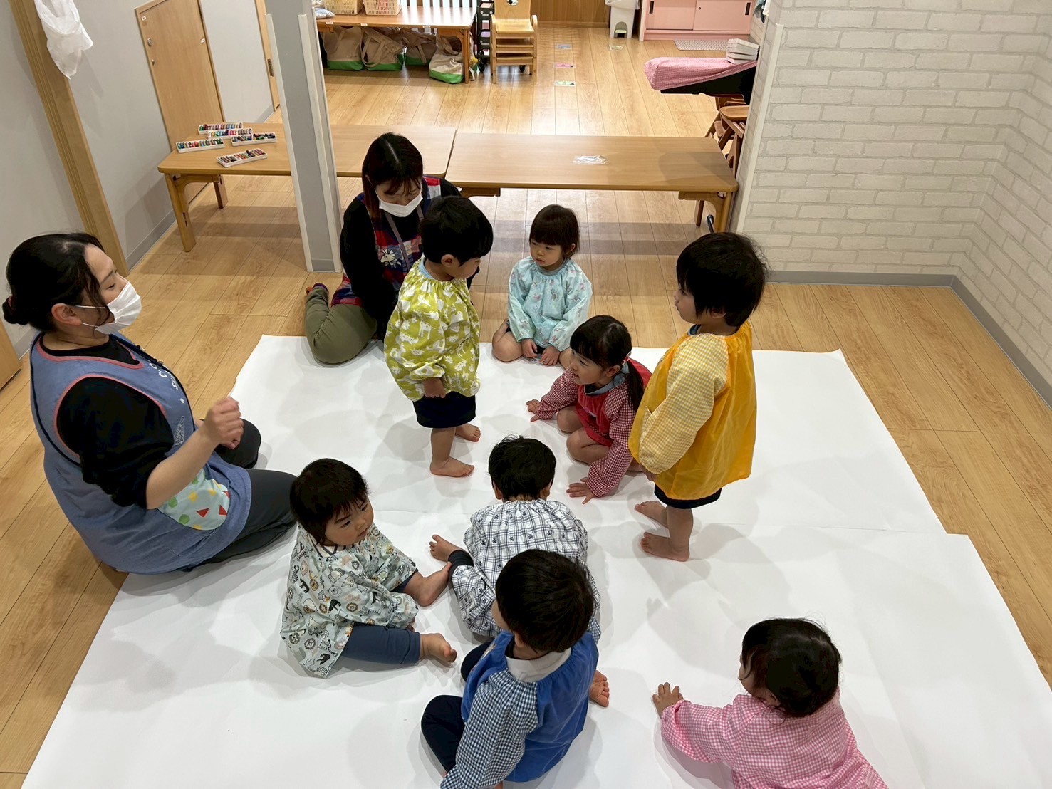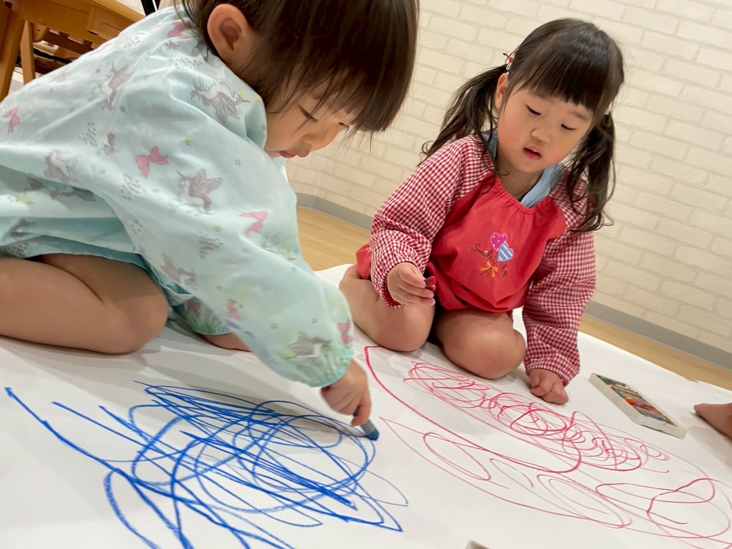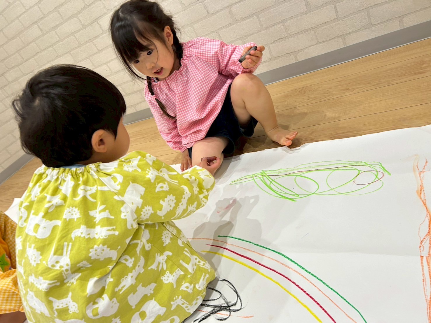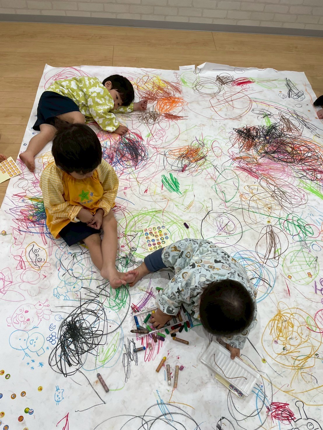 大きな紙を見て「いつもと違うね🤩」と興味津々のお友だち!!始める前にお約束事をして、自由にお絵描きスタート▶️✨