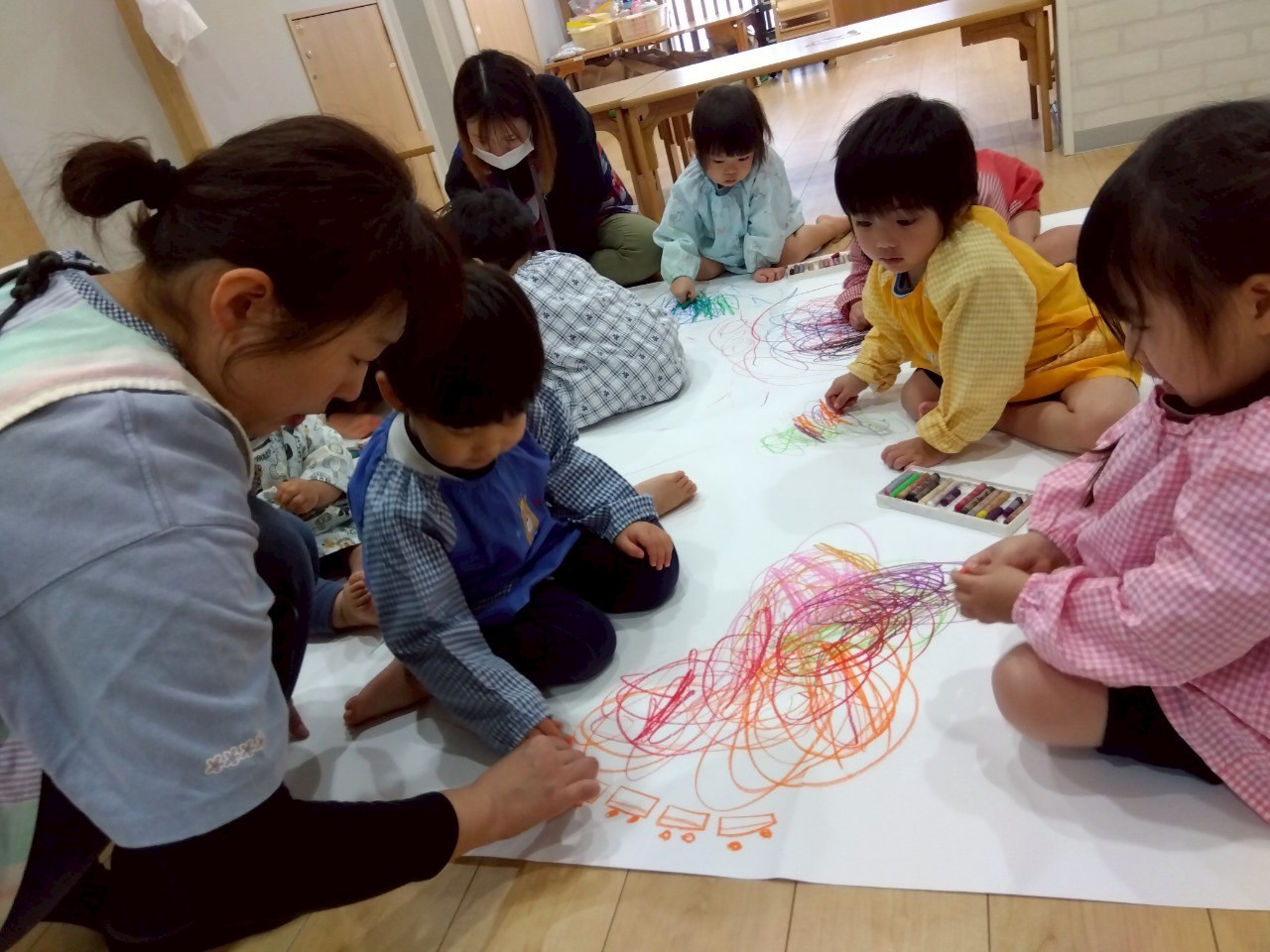 好きな色のクレヨンを選んで、グルグル〜とカラフルに描く子、お友だちと一緒に想像を膨らませて会話も楽しみながら描く子、保育者と一緒に楽しむ子と思い思いに楽しむ姿がありました😊💕