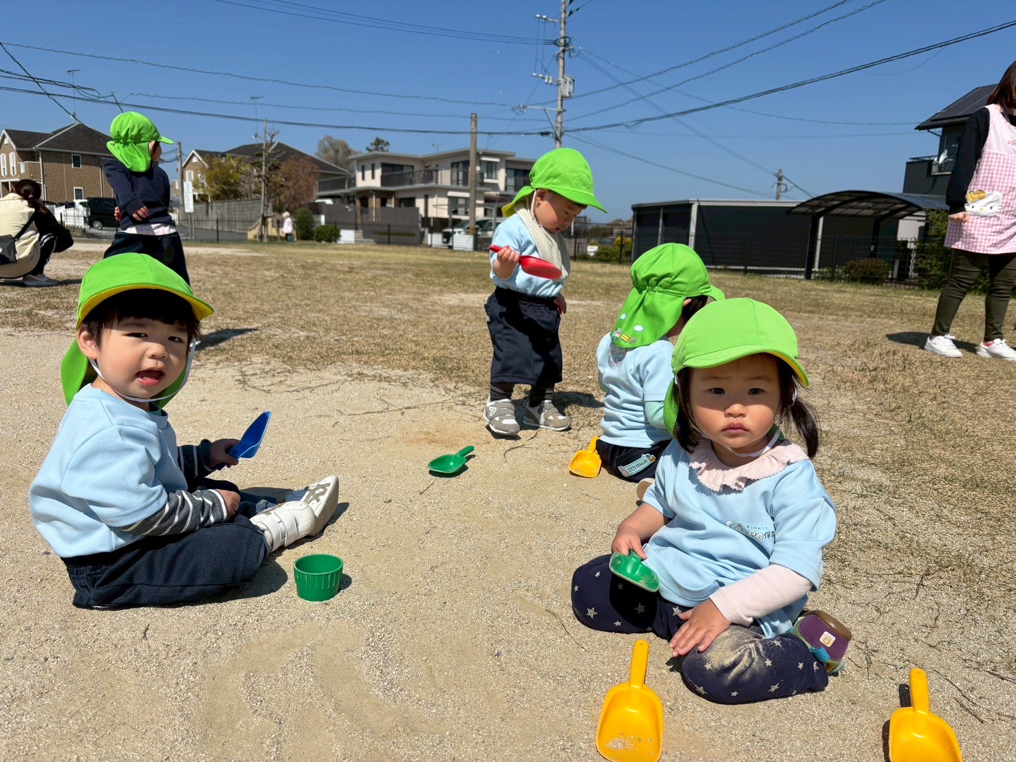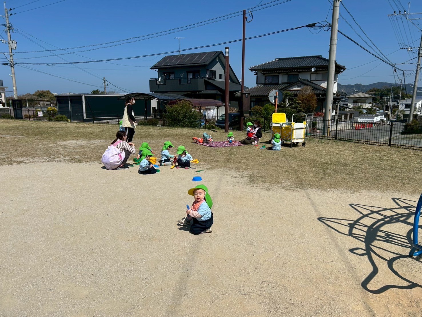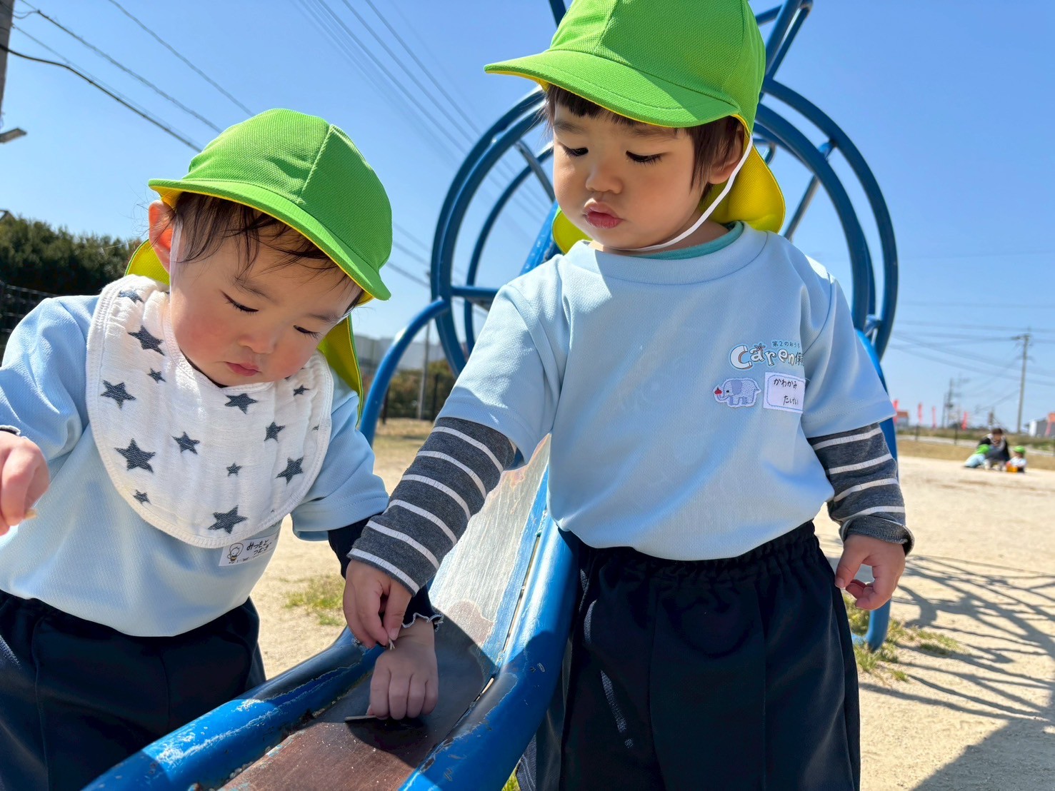 今日はお天気も良く 🦕むつき公園まで遊びに行きました🌸恐竜の遊具につかまって遊んだり、砂遊びや、スコップに石をのせてみたりと、みんな好きな遊びを楽しみました♪