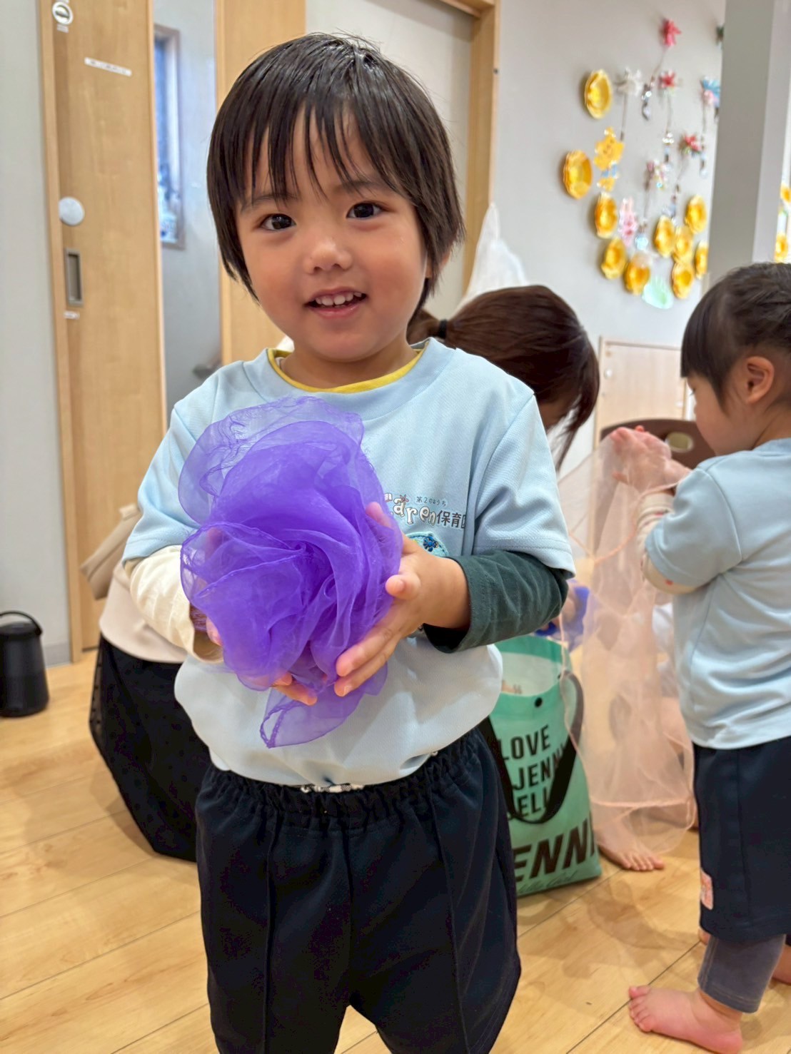 今日はリトミックからスタート❣️仕掛け絵本を見たり、ミニ鉄琴を演奏したり、歌に合わせて好きな色のカラーシフォンをフワフワさせて楽しみました🎵