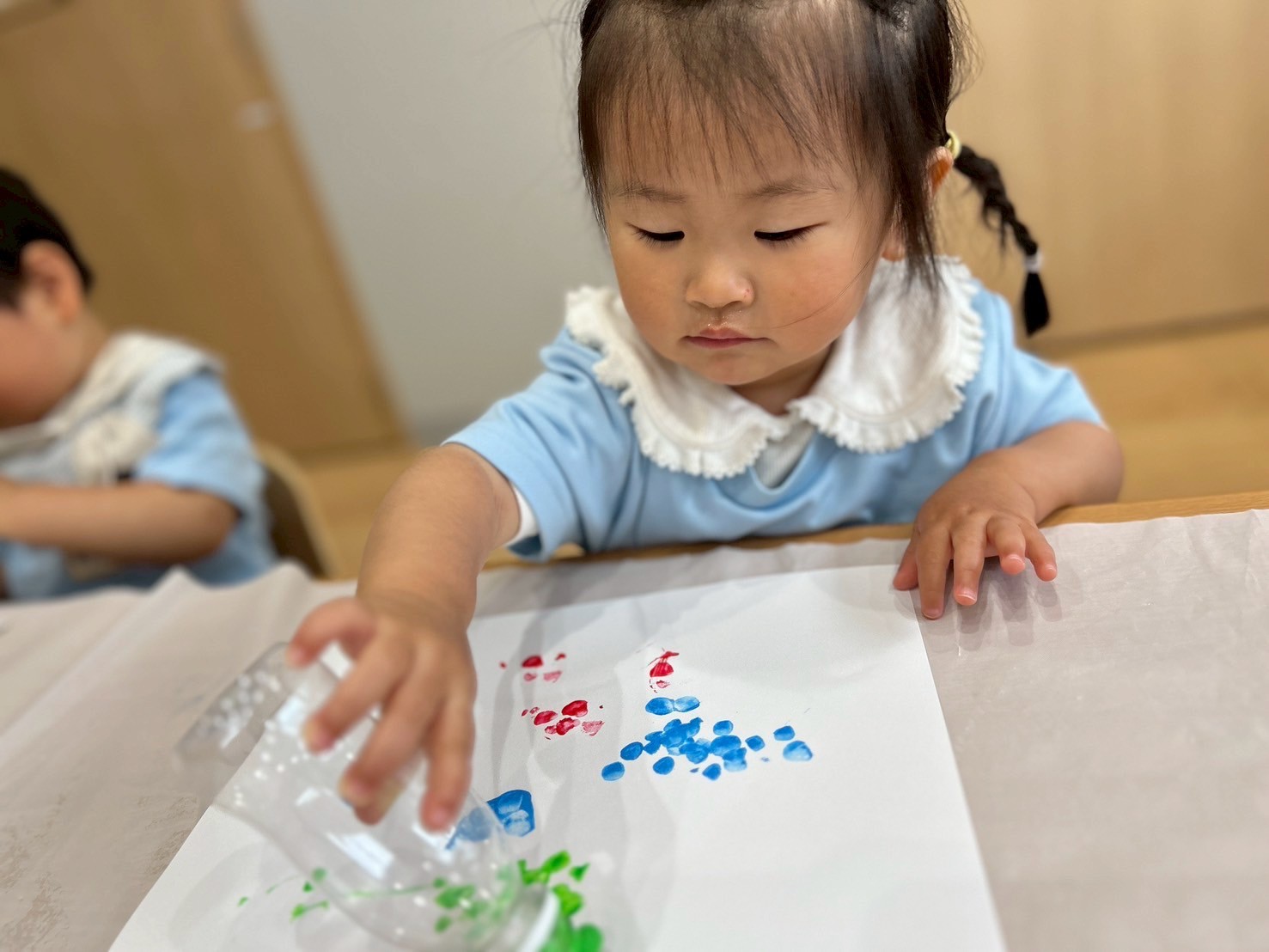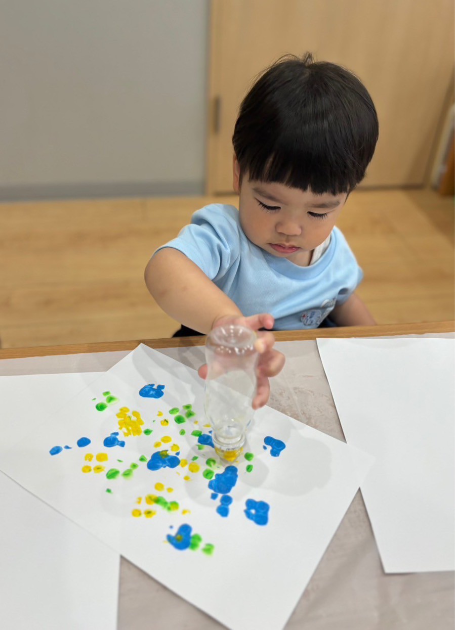 その後は順番に月製作をしました✨好きな色の絵の具のスタンプをペタペタ😙白い画用紙にカラフルな色が付いて嬉しそうでした💕出来上がりをお楽しみに😘