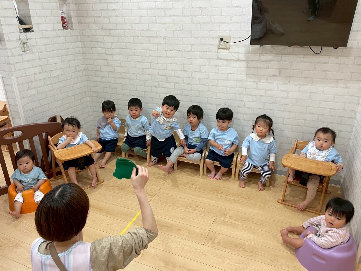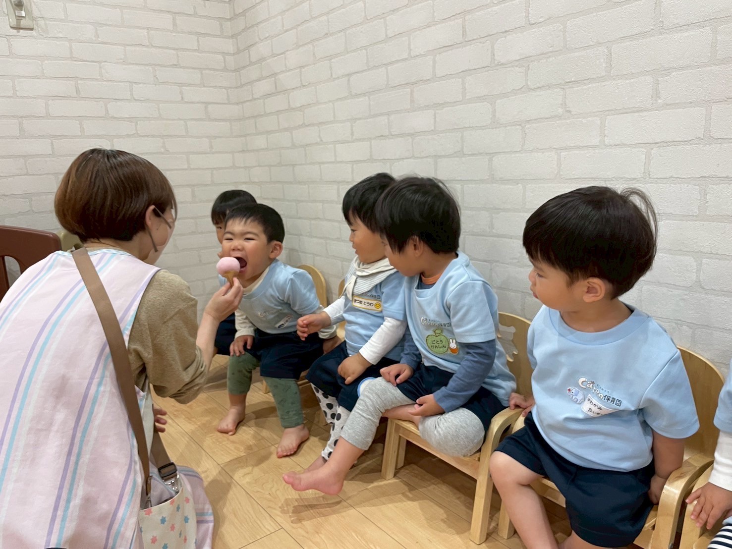 みんなで手遊びをしました🙌🏻ボールに卵と牛乳を入れて、混ぜ混ぜして冷やすと…美味しいアイスクリームの出来上がり❣️アイスをペロッと舐めようとする子ども達がとっても可愛かったです😋❤️