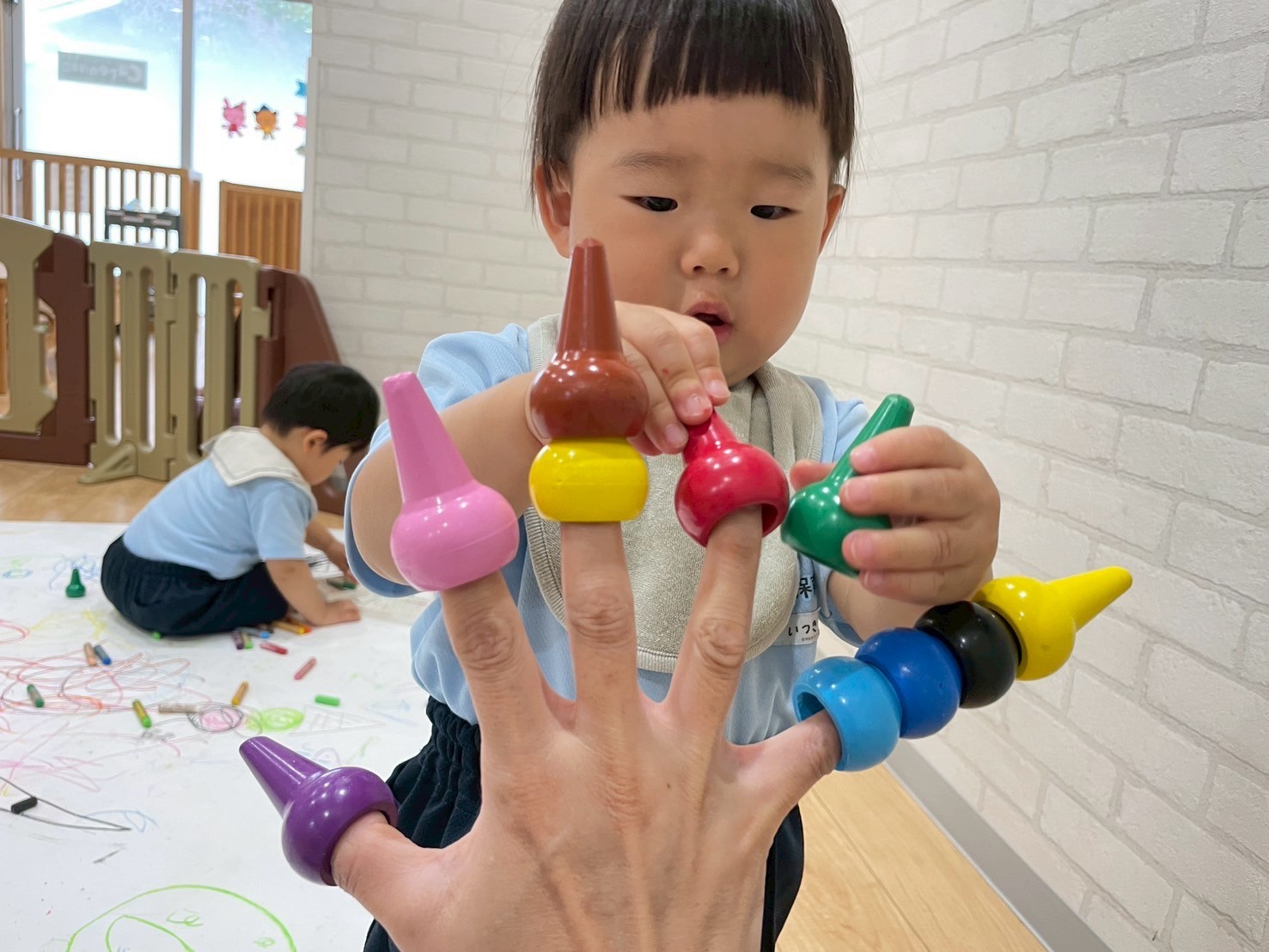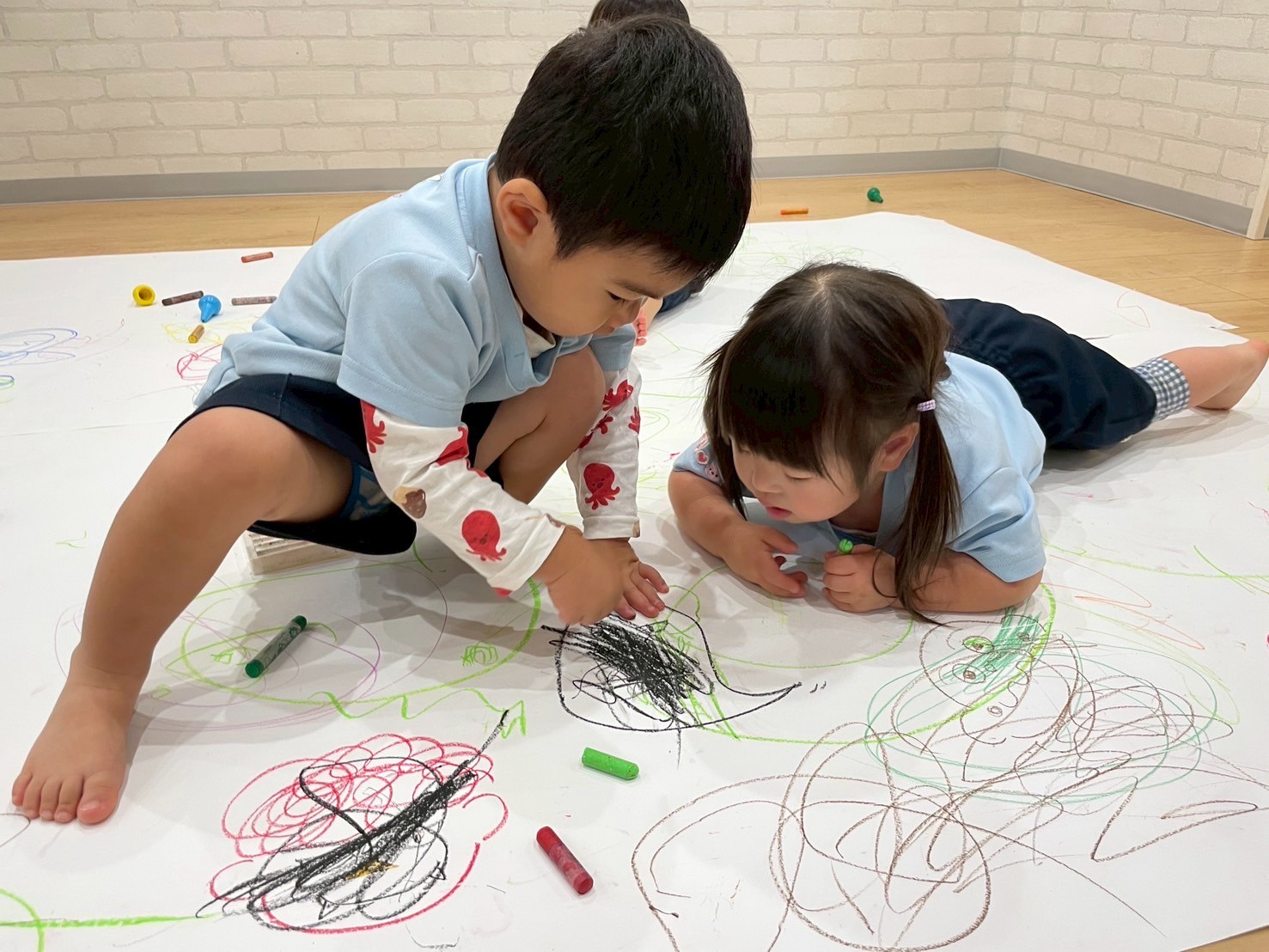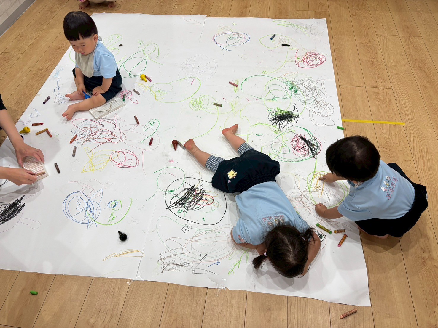 ロール画用紙を床いっぱいに広げて大きなキャンバスが誕生🤩クレヨンを持ってきて「アンパンマン!」とリクエストするお友だちや、うつ伏せになり汚れも気にせず豪快にぐるぐるとお絵描きするお友だちがいましたよ👩🏻‍🎨ぱんだ組さんはしっかりした筆圧で描いていて成長も感じられました👏😌