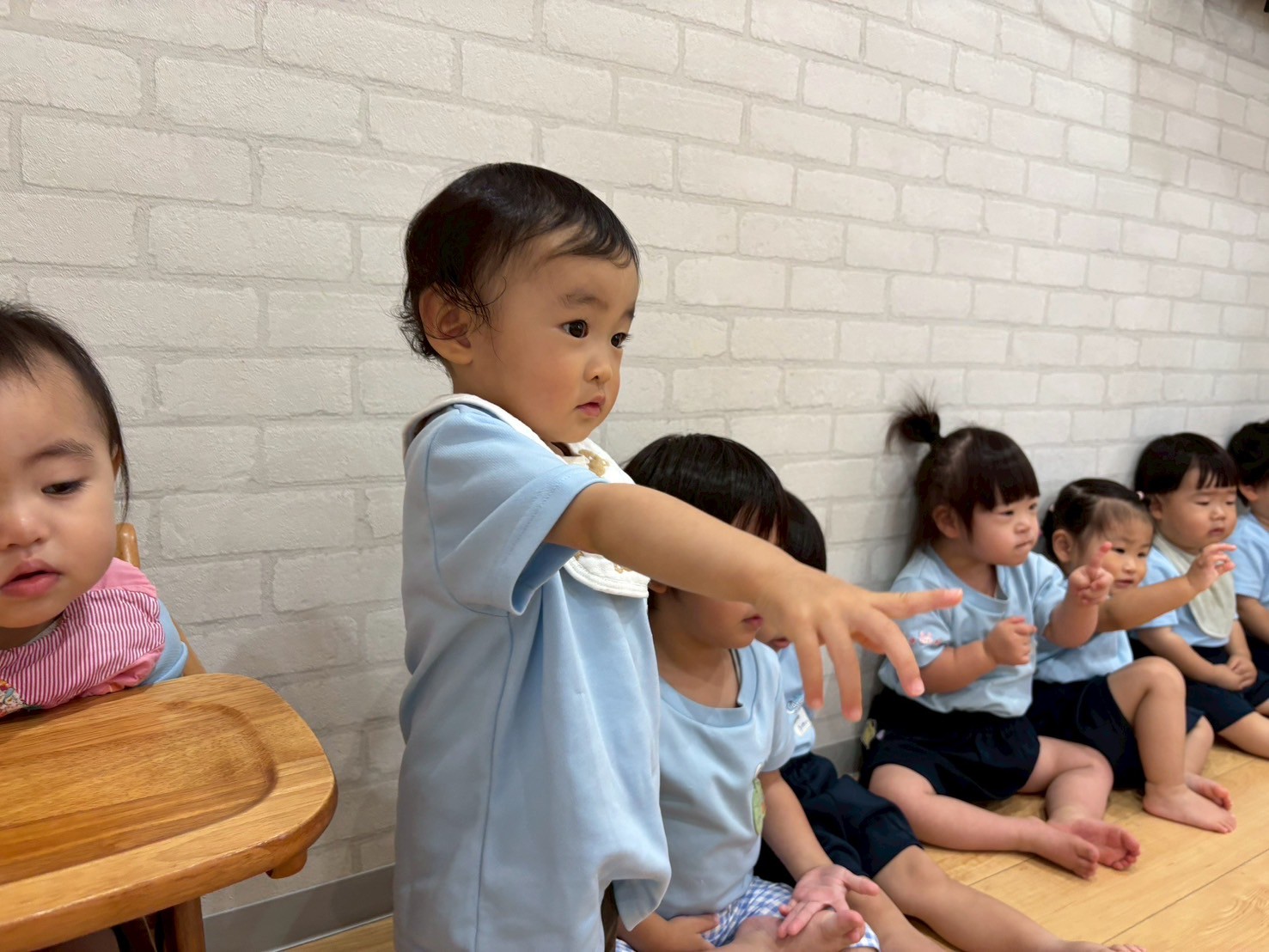 耳を澄まして「ワンワン🐶」「にゃんにゃん😼」何の鳴き声かな〜?と聞かれると、一生懸命犬や猫の指さす福津園のお友だち💚