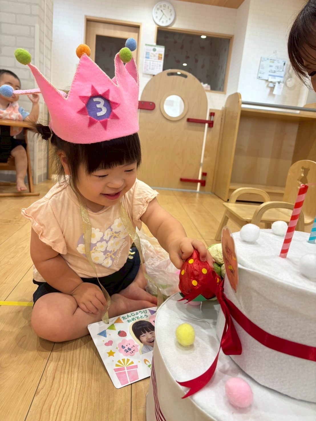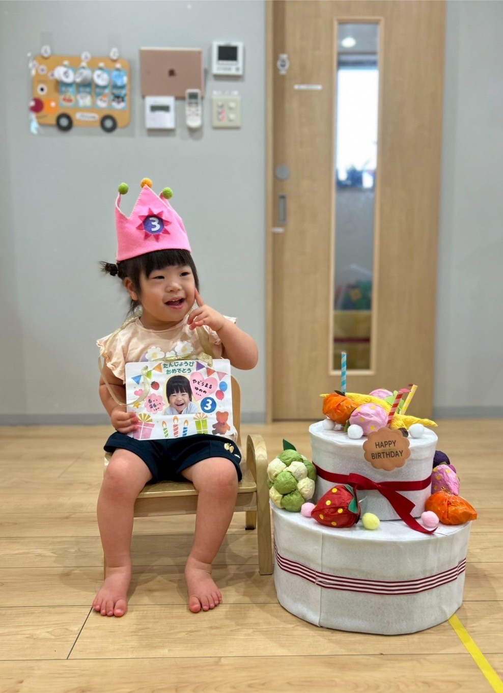 みんなにお祝いしてもらうのが嬉しくて、ニコニコ笑顔がいっぱいでしたよ🥰お家で3の指を練習してきてくれ、頑張って披露してくれました👏とっても可愛かったです✨大きな🎂に沢山のフルーツを飾りつけてご機嫌でした♡