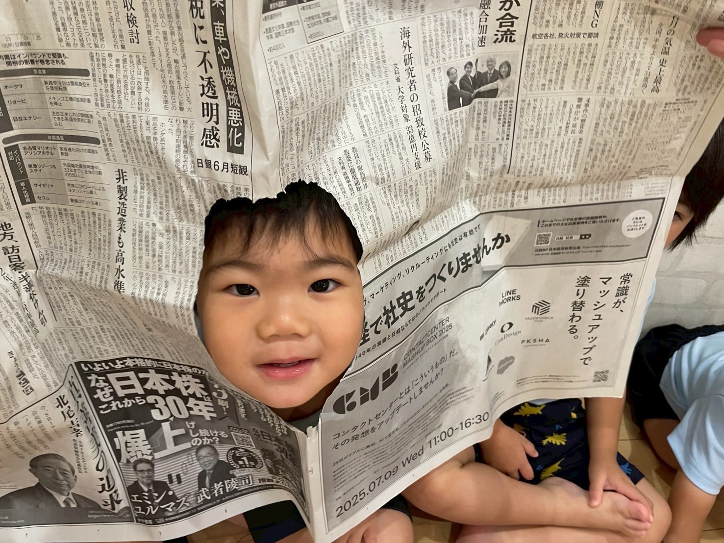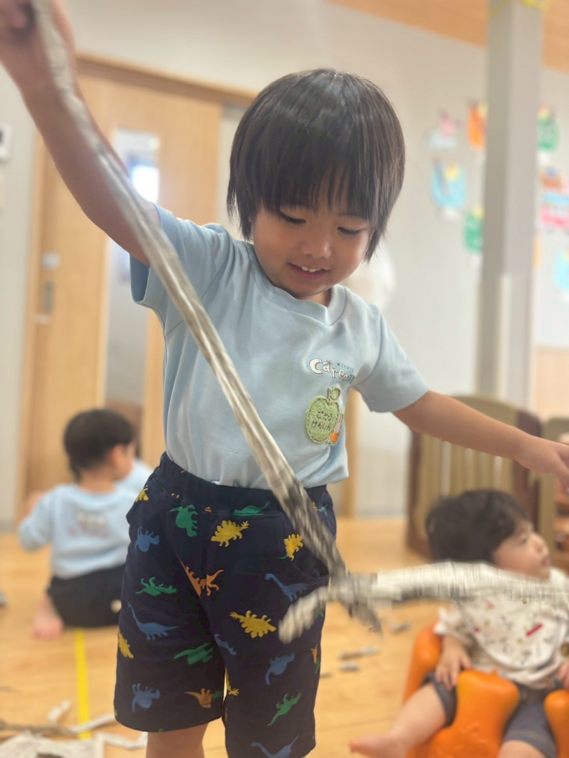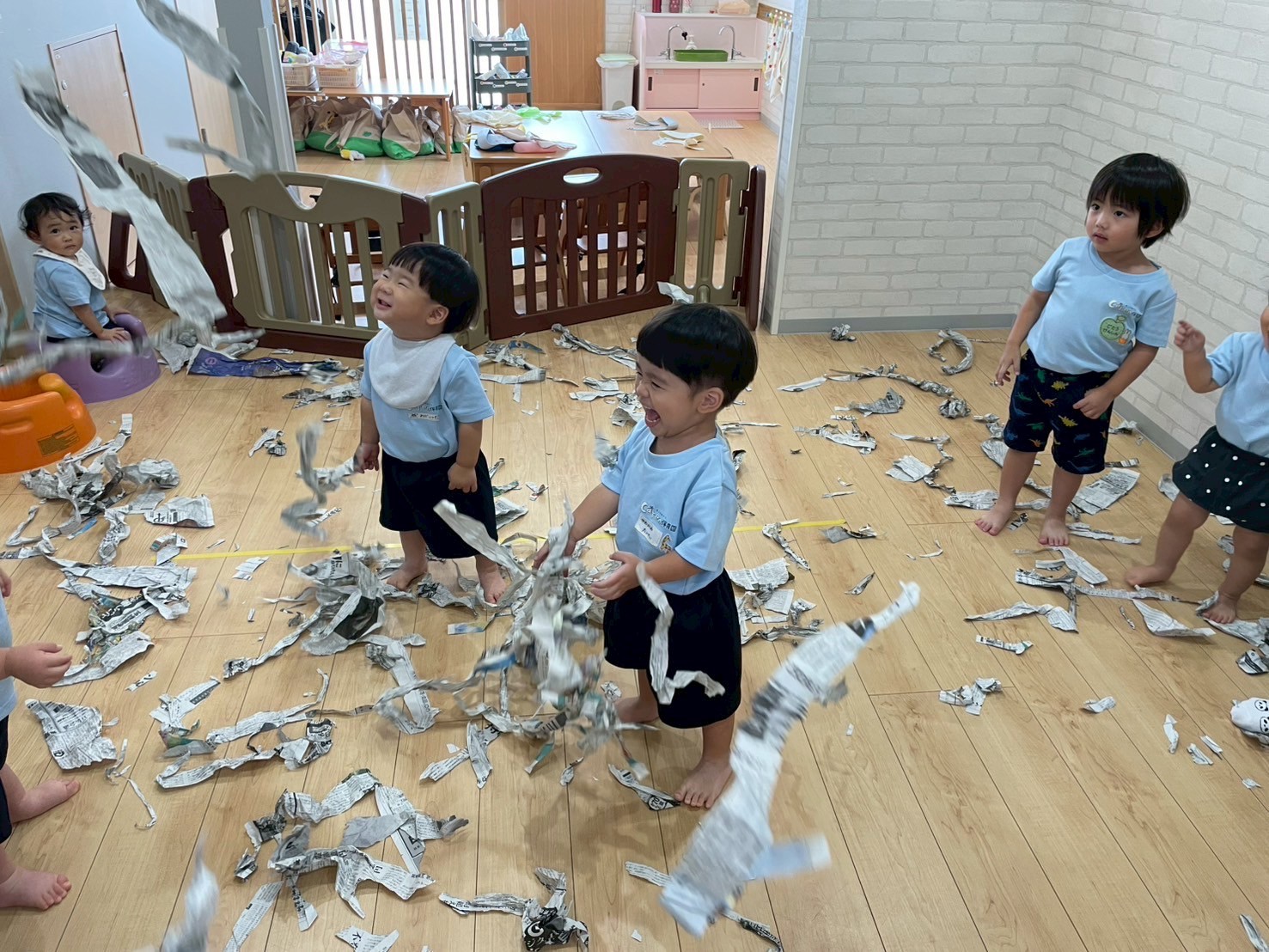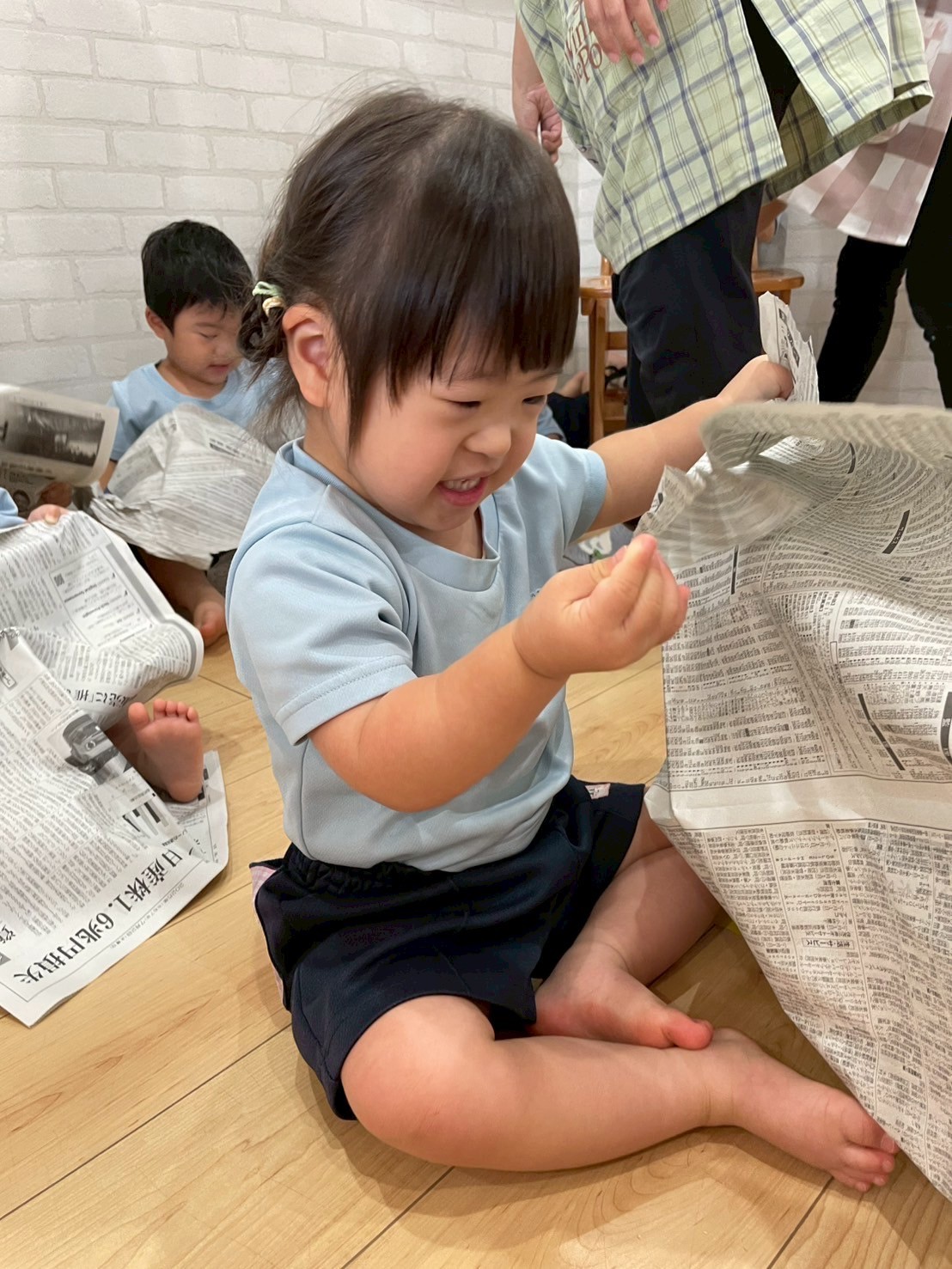 今日は室内で新聞紙遊びをしました✨くしゃくしゃして音を出してみたり、ビリビリと破いたりと感触を楽しみながら色んな遊びをしましたよ😘新聞紙の真ん中をくり抜いて顔ハメをしたり、魔法をかけて大きなツリーを作ったり❤️小さくちぎってごはんの材料にしたり、沢山集めてお布団にしたりと楽しみながらゆっくり過ごしました🌟