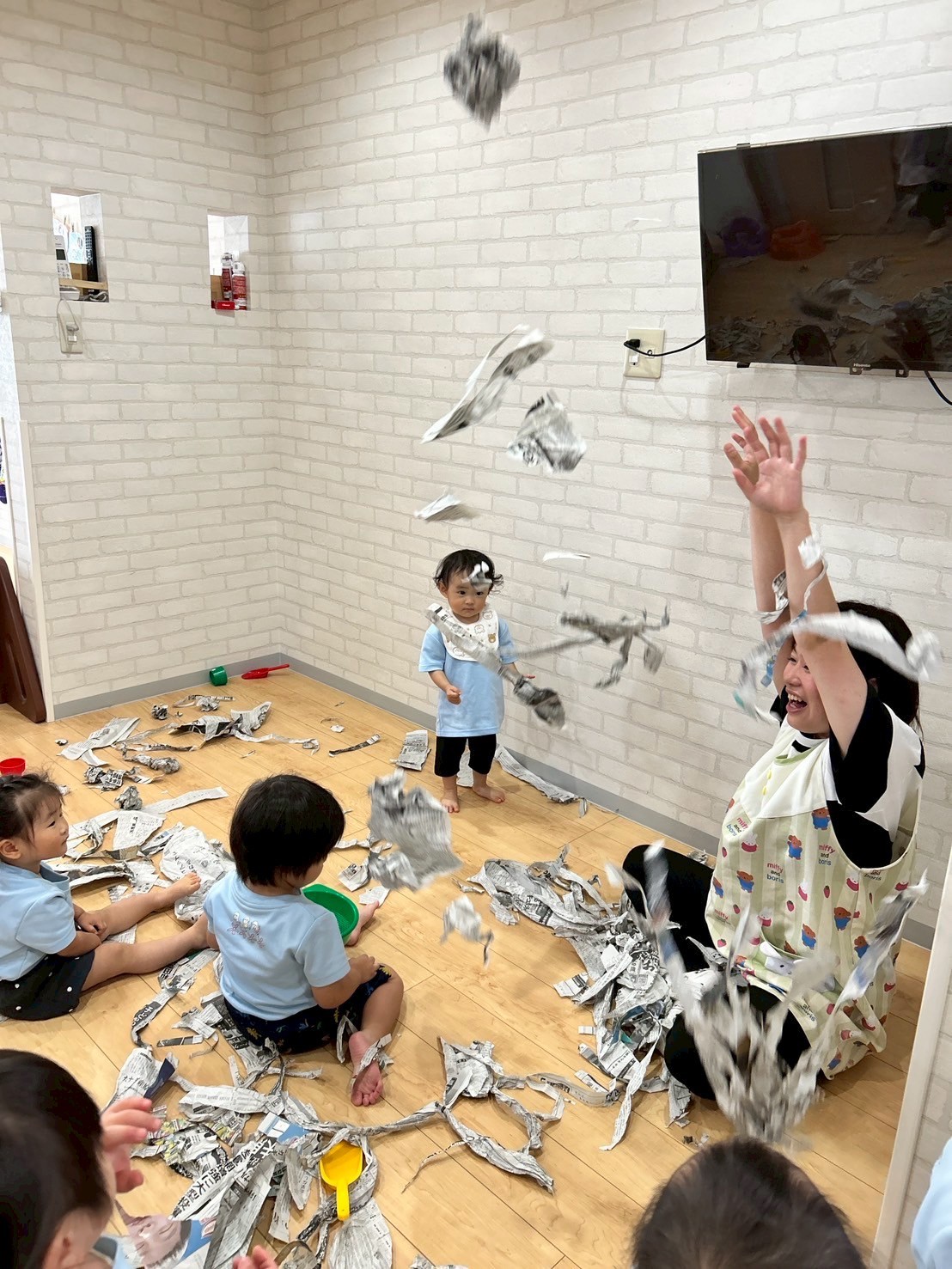 みんなで傘の中に新聞紙を入れて、高いところからシャワ〜☔️「まだする〜‼️」と何度も遊んで大喜びの子ども達でした🥰最後はお部屋に散らばった新聞紙を袋にどんどん集めて、大きなおばけができました(おばけ)ひよこさんは様子を見ながらボールプールも楽しみましたよ🎶